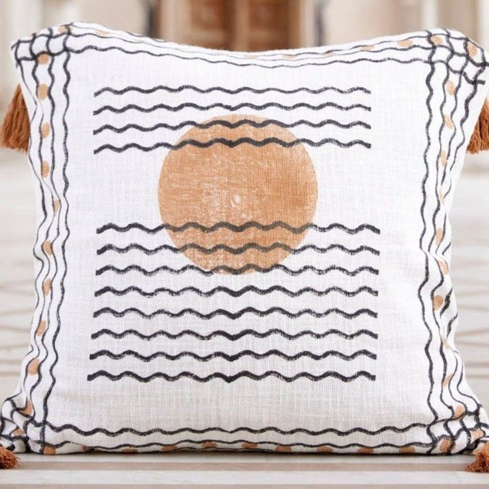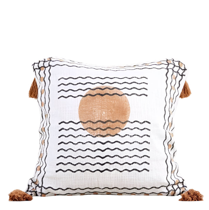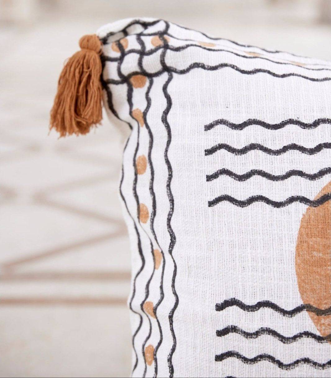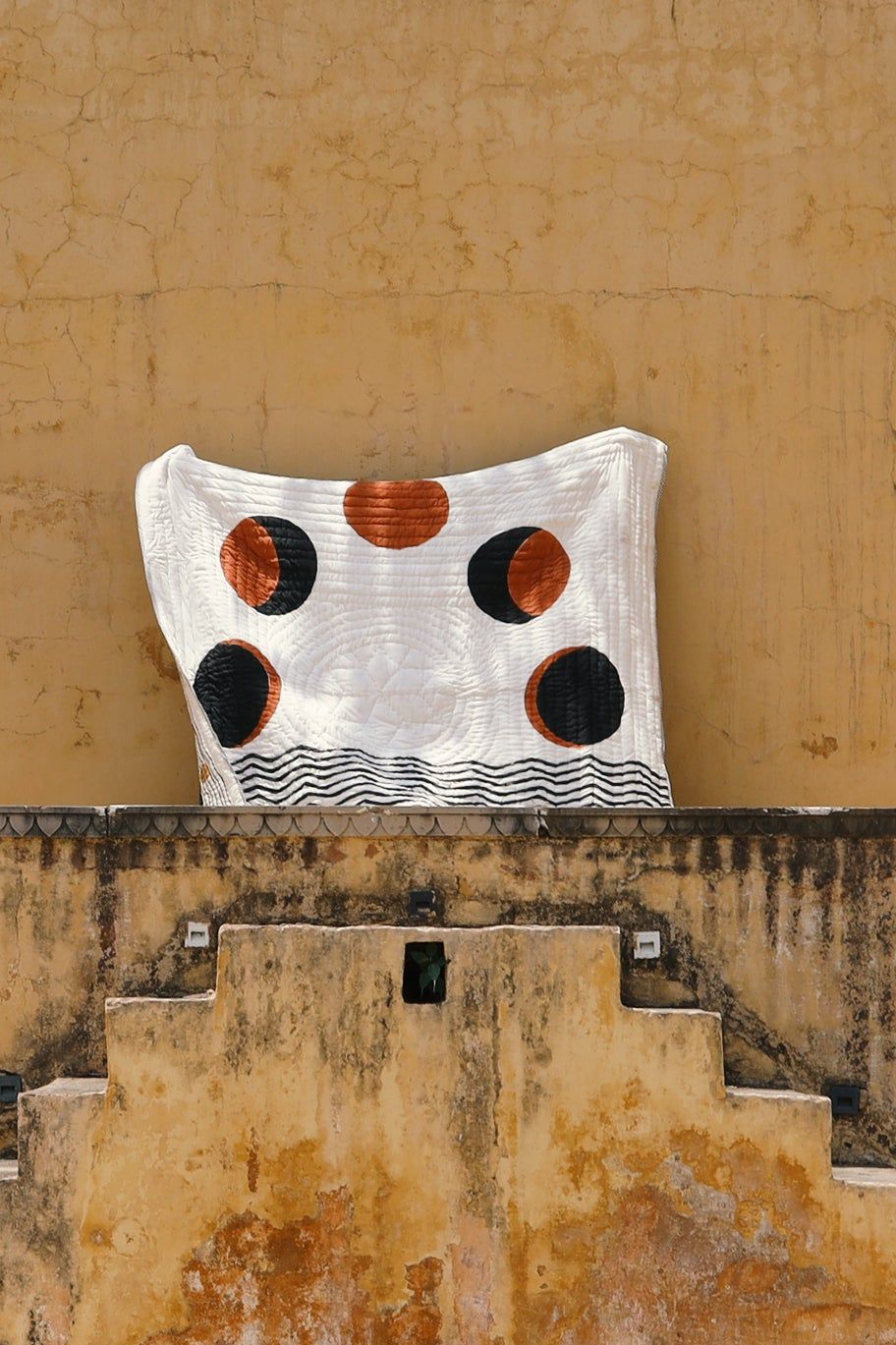 This reversible, hand-printed quilt on a crisp white base presents a modern take on lunar motifs. One side showcases a prominent brown moon, while the flip side features the lunar cycle in shades of black and brown.