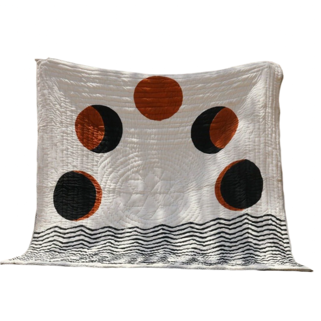 This reversible, hand-printed quilt on a crisp white base presents a modern take on lunar motifs. One side showcases a prominent brown moon, while the flip side features the lunar cycle in shades of black and brown.