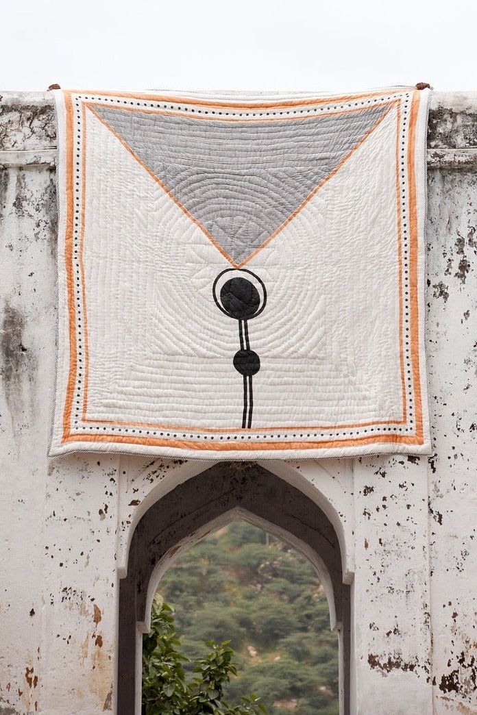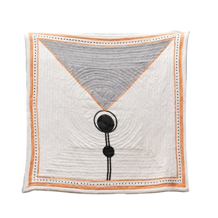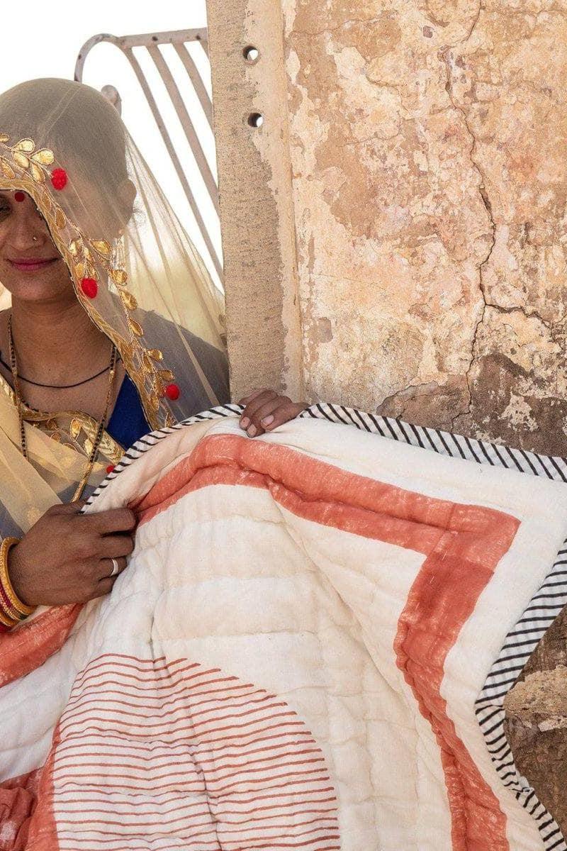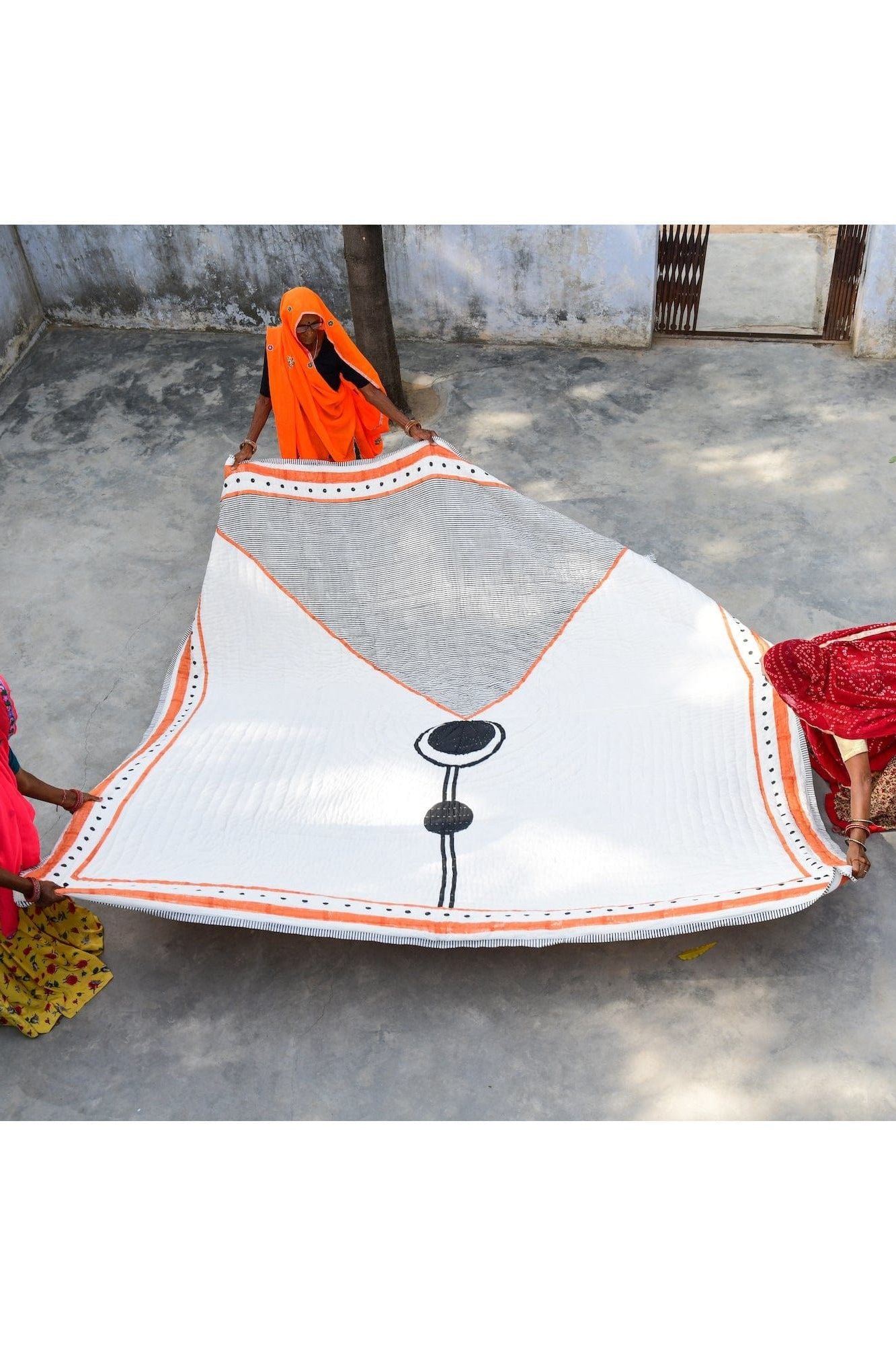 Inspired by the German Bauhaus art movement, this reversible, hand-printed quilt features a modern orange and white motif. Each quilt is handmade from 100% cotton and requires attention from four artisans, including wood carvers, block printers, quiltmakers, and dye specialists.