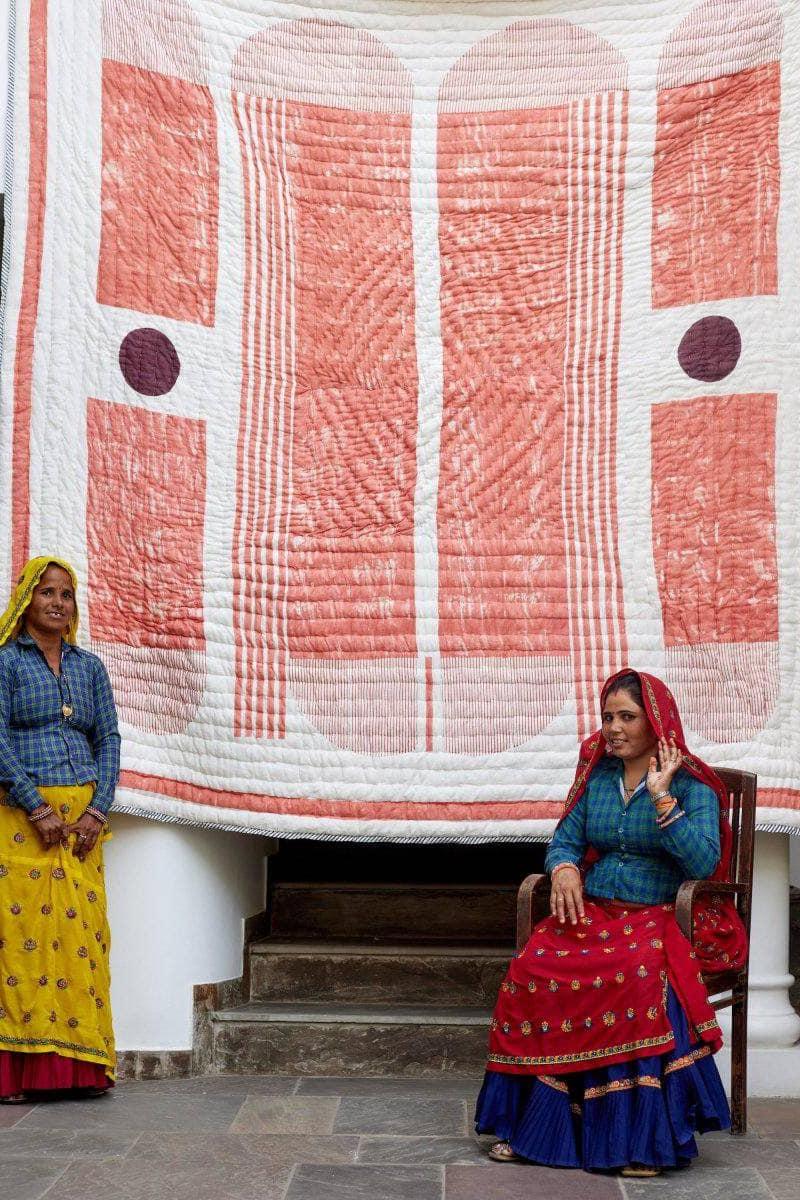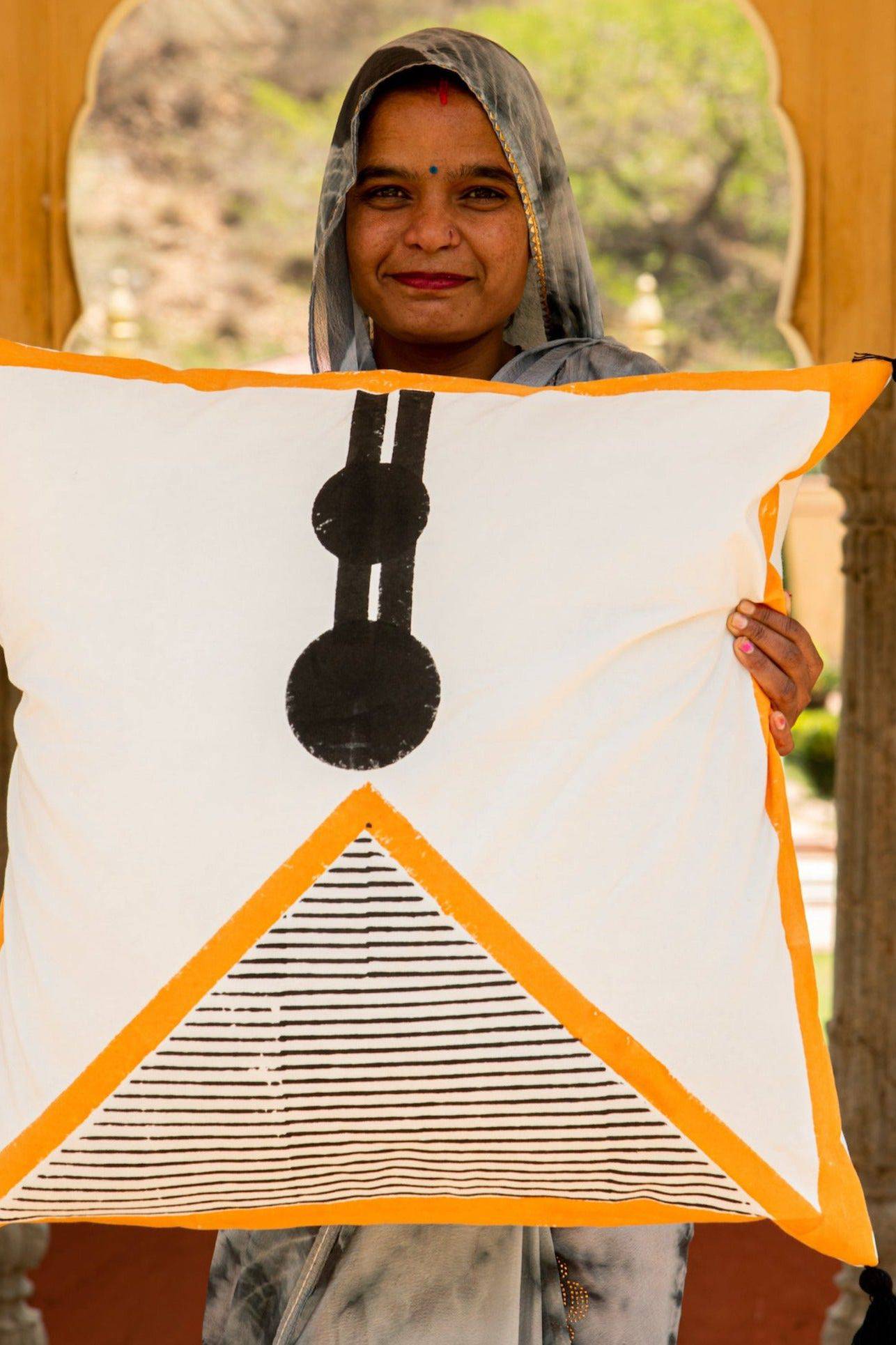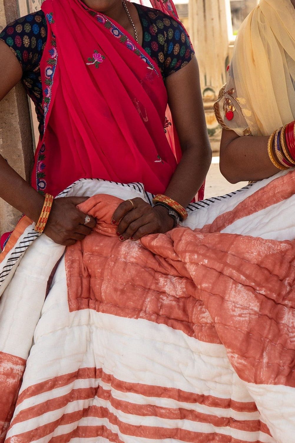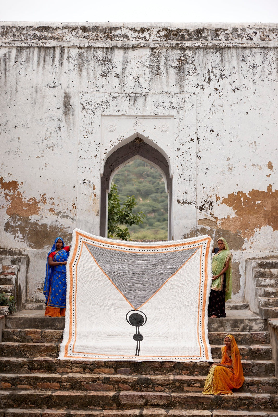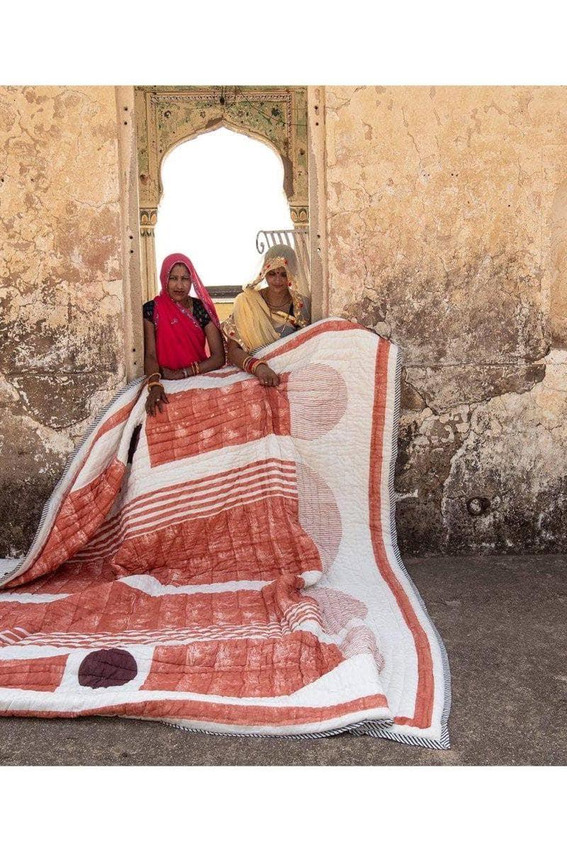 The design is hand-pressed onto each quilt using hand-carved wooden blocks dipped in dyes. The printed cotton shells are brought to the homes of quiltmakers, who stuff and stitch the quilts by hand, creating the final product.