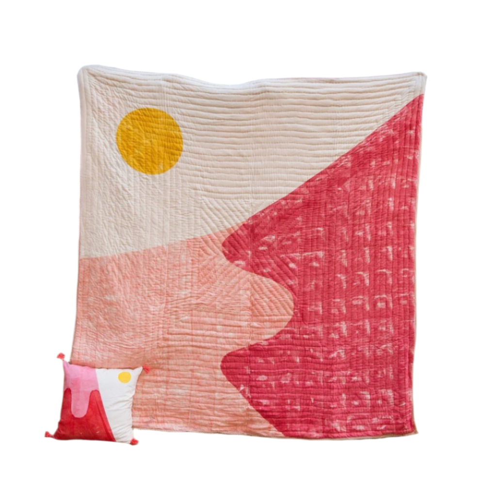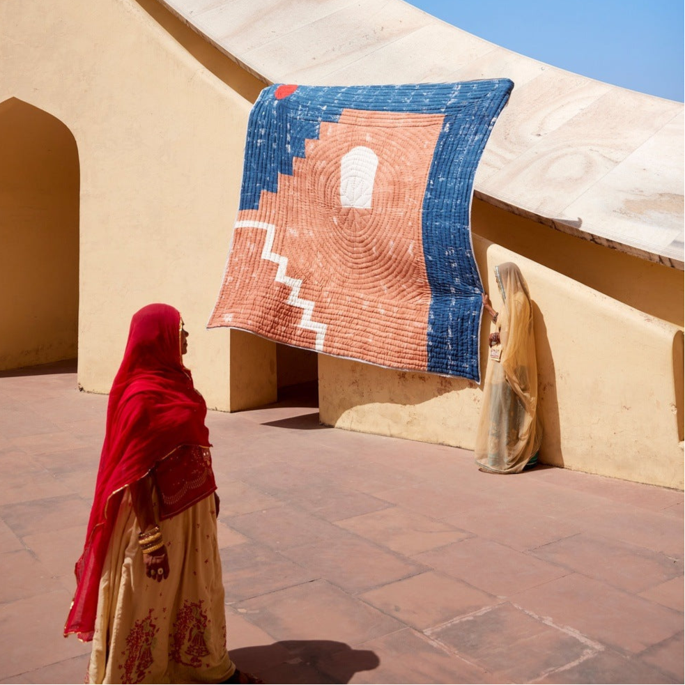 The design is hand-pressed onto each quilt using hand-carved wooden blocks dipped in dyes. The printed cotton shells are brought to the homes of quiltmakers, who stuff and stitch the quilts by hand, creating the final product.