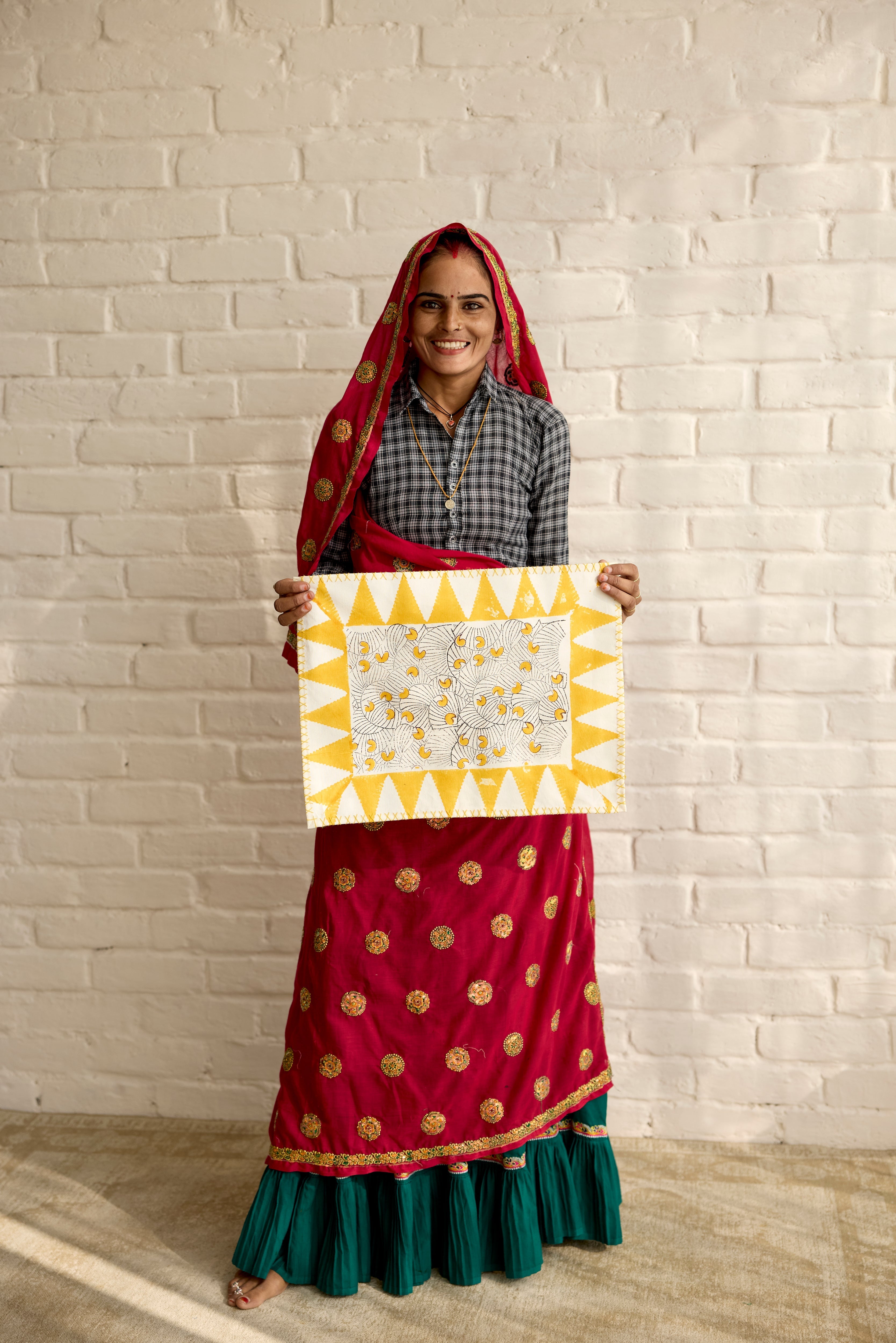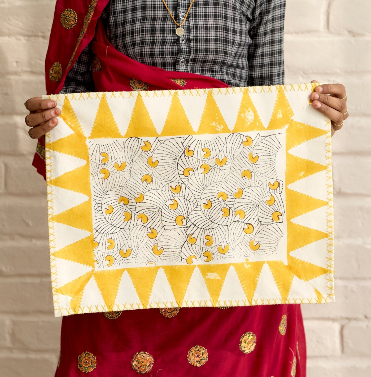 Four artisans meticulously crafted each placemat: wood carvers, block printers, Kantha stitchers, and dye specialists. Using hand-carved wooden blocks dipped in rich, natural dyes, the designs are carefully stamped onto 100% cotton fabric. The printed canvas is then enhanced with a hand-stitched Kantha border, making each piece a masterpiece of craftsmanship.