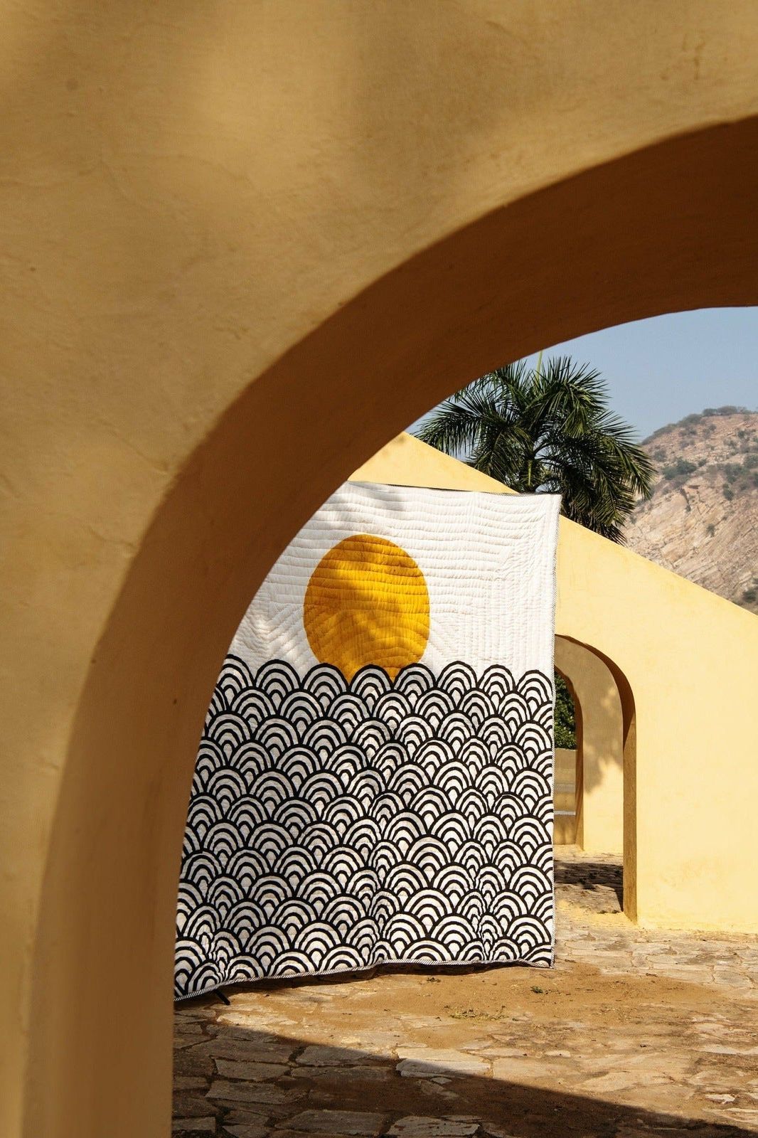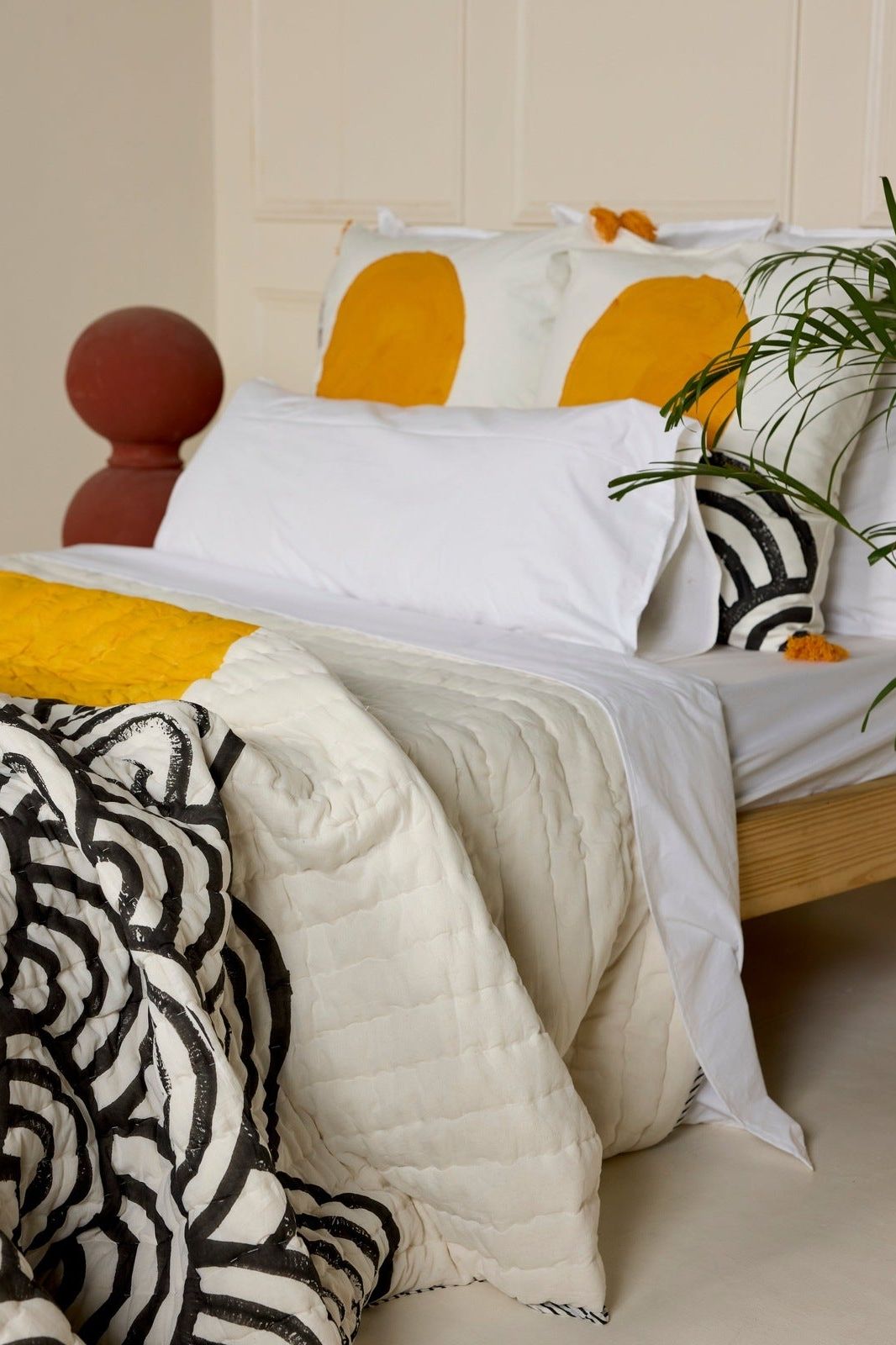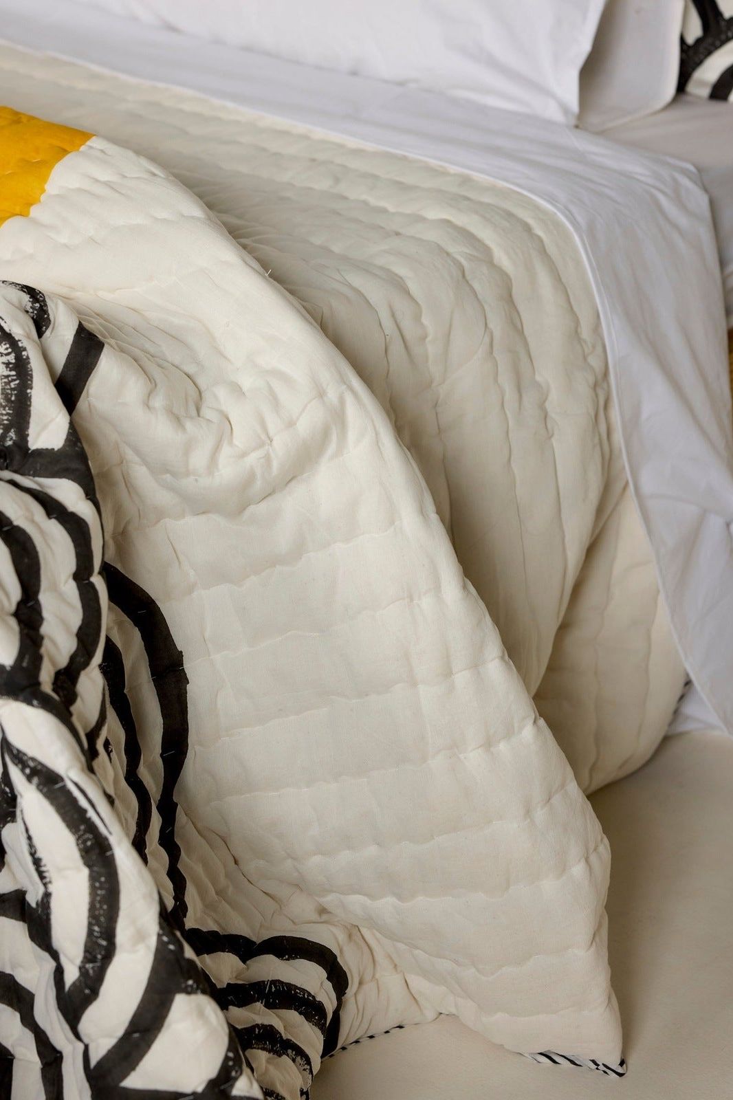 The design is hand-pressed onto each quilt using hand-carved wooden blocks dipped in dyes. The printed cotton shells are brought to the homes of quiltmakers, who stuff and stitch the quilts by hand, creating the final product.