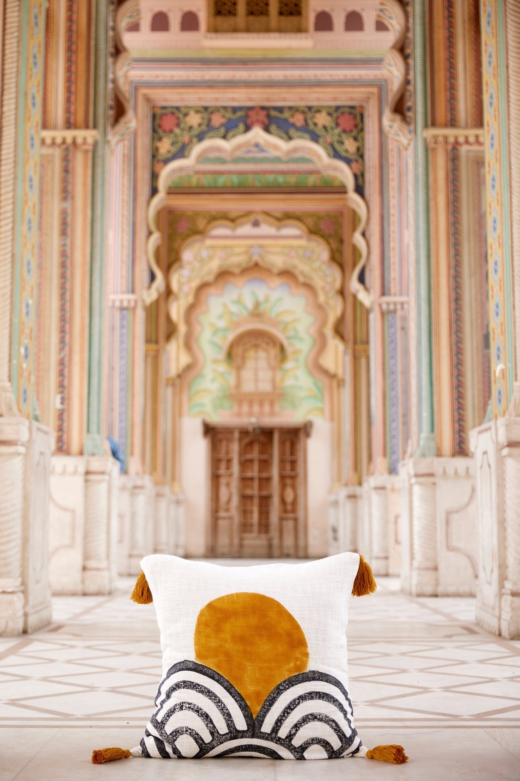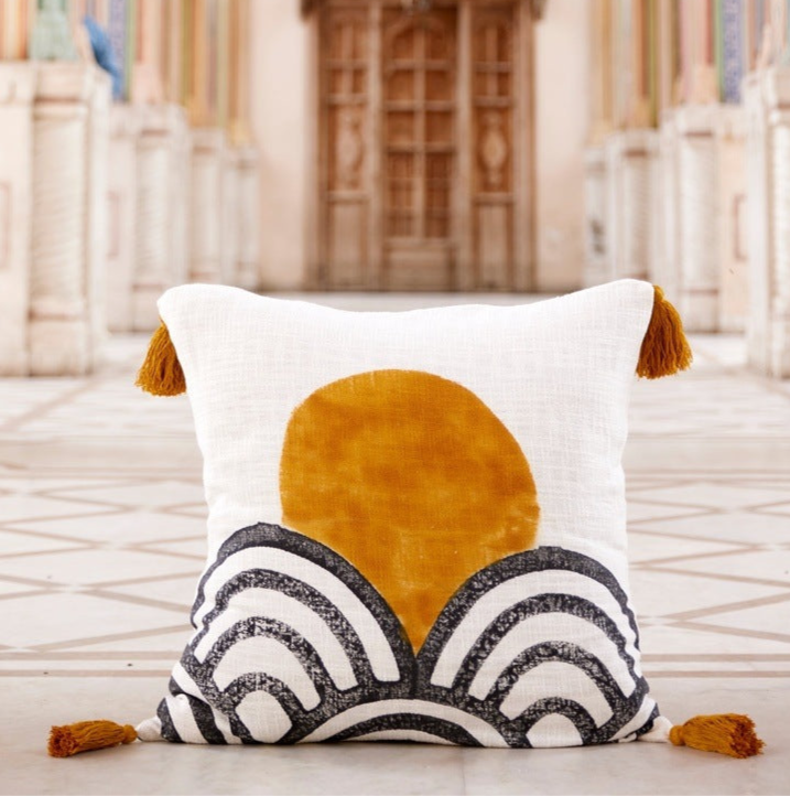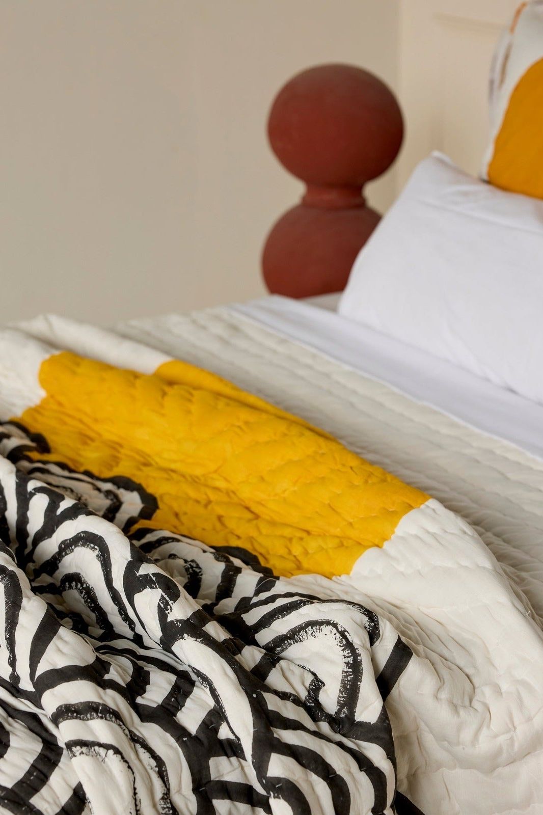 The design is hand-pressed onto each quilt using hand-carved wooden blocks dipped in dyes. The printed cotton shells are brought to the homes of quiltmakers, who stuff and stitch the quilts by hand, creating the final product.