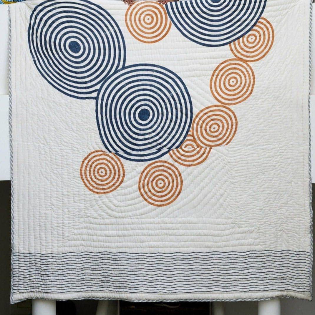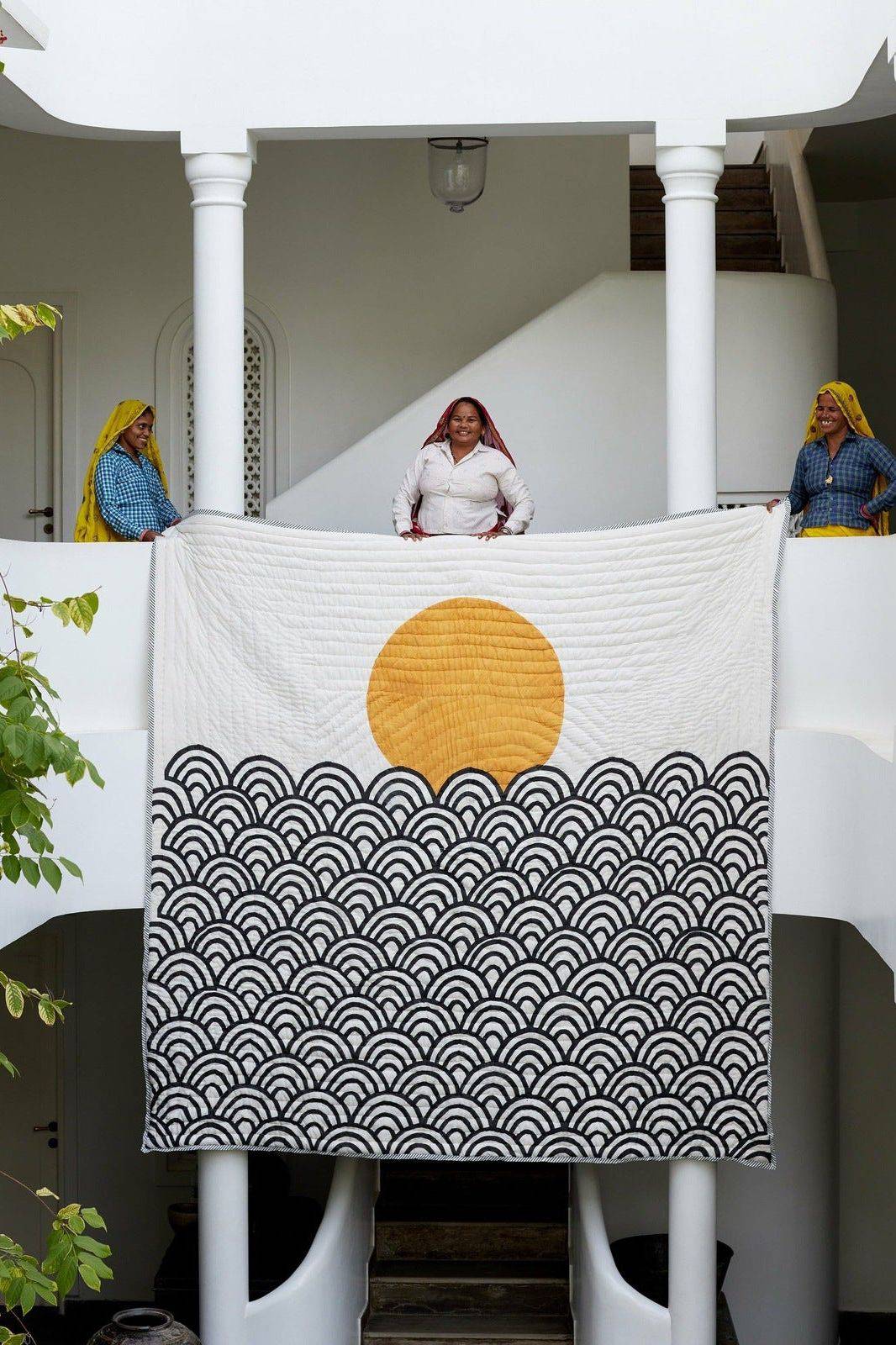 The design is hand-pressed onto each quilt using hand-carved wooden blocks dipped in dyes. The printed cotton shells are brought to the homes of quiltmakers, who stuff and stitch the quilts by hand, creating the final product.