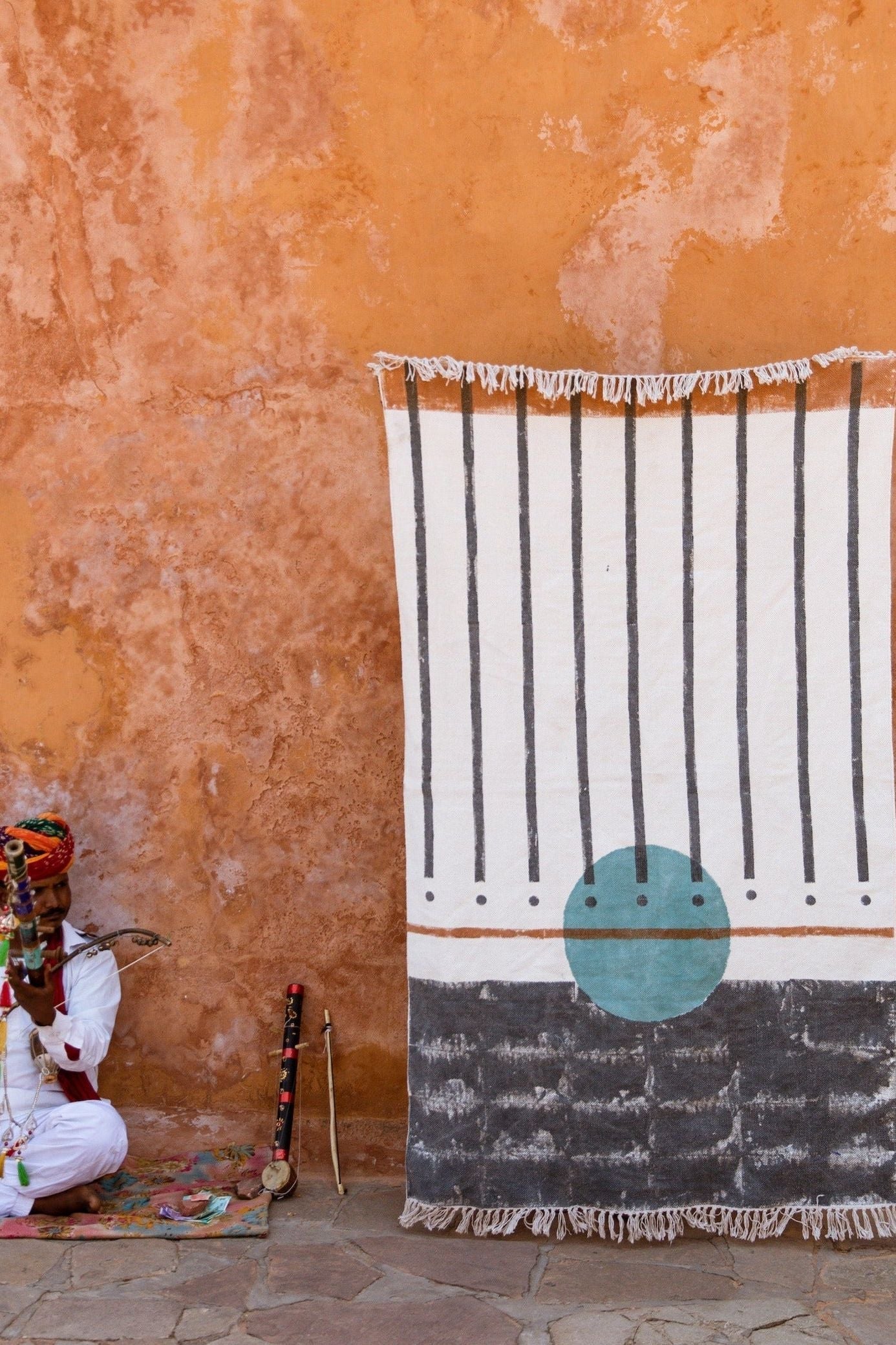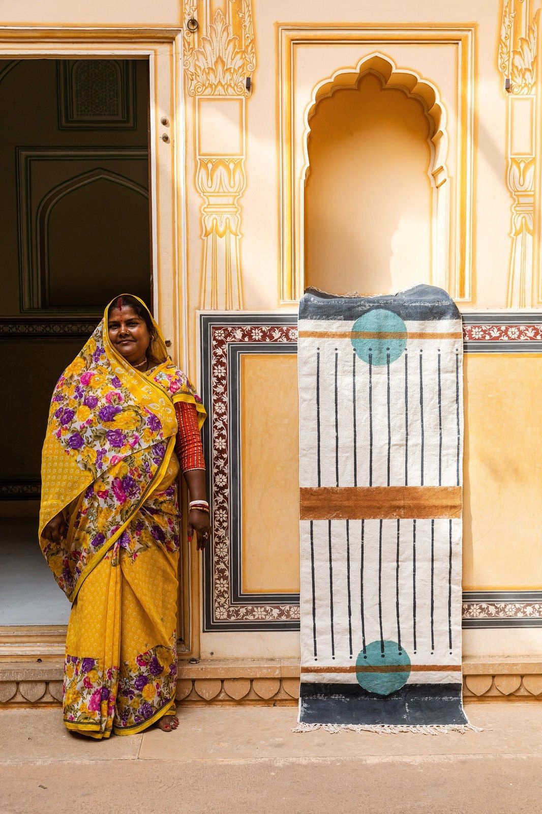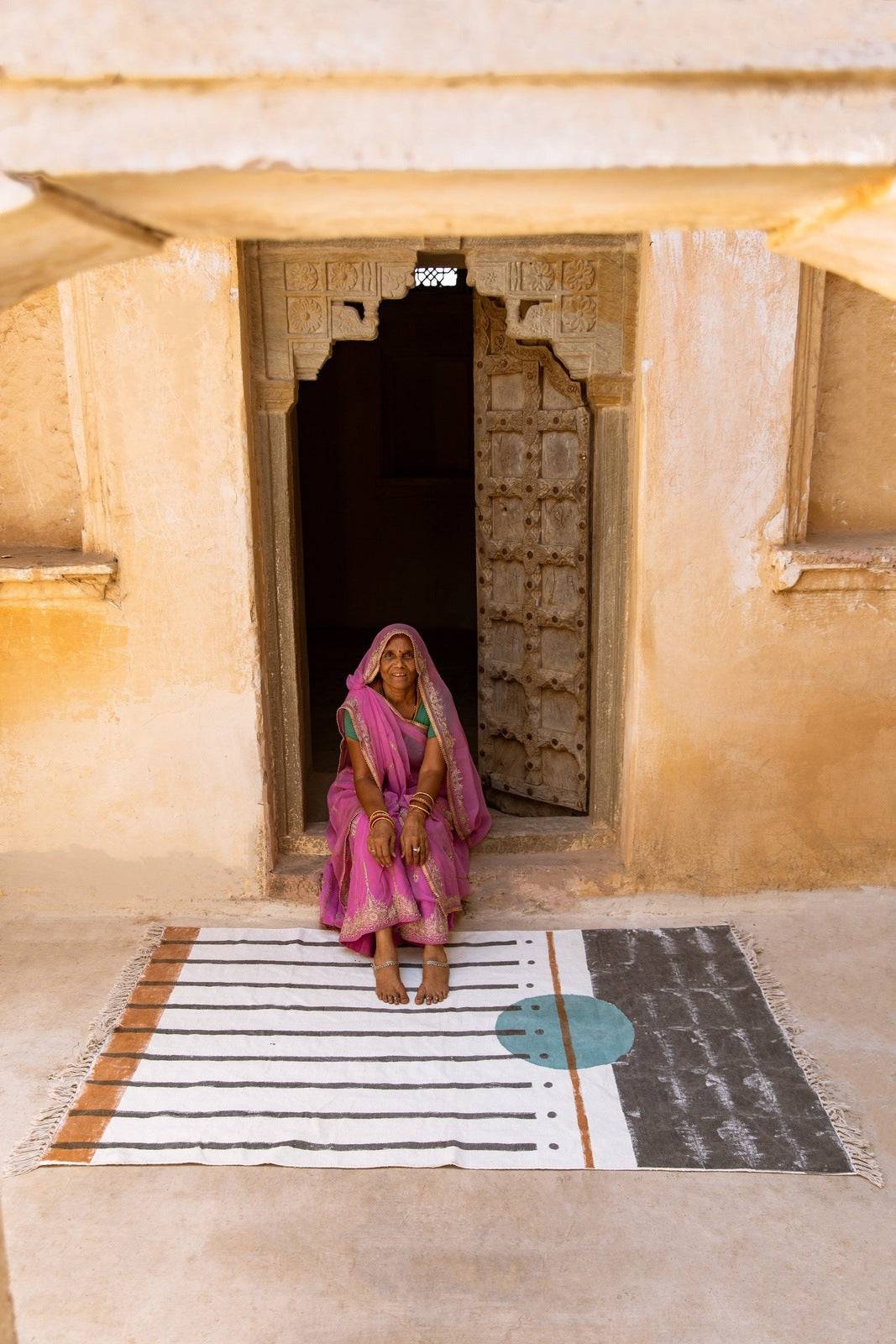 Each rug is handmade, requiring attention from 4 artisans, including wood carvers, block printers, weavers, and dye specialists.