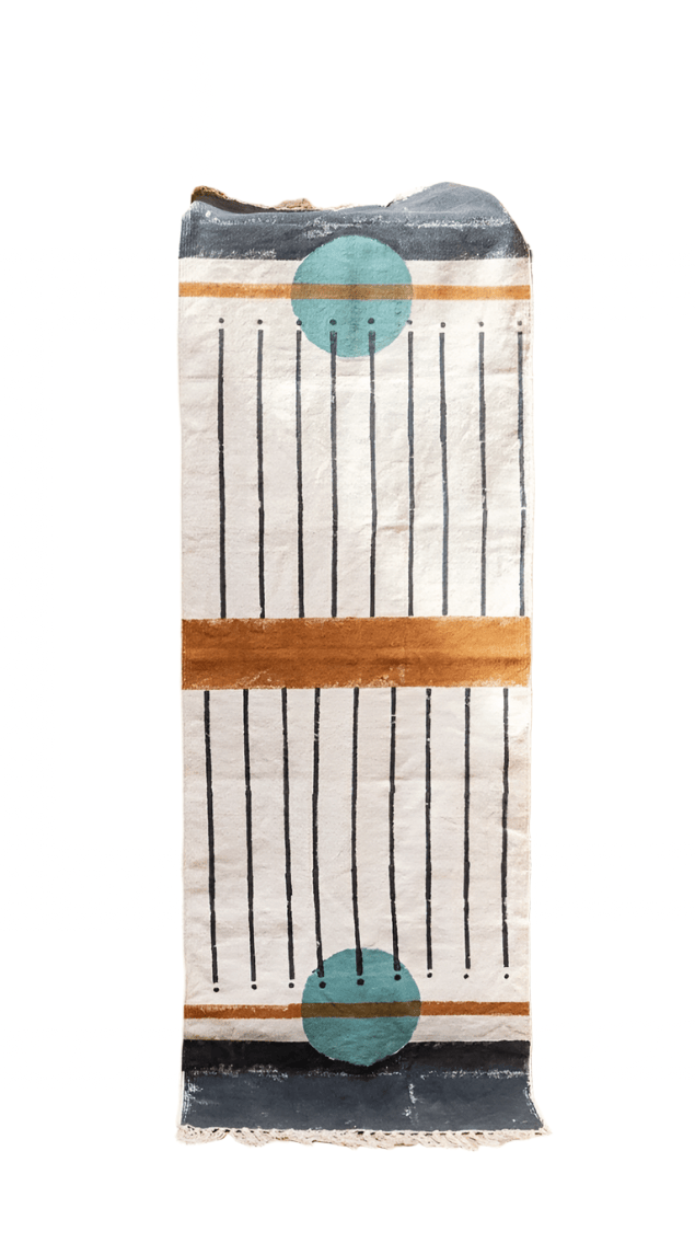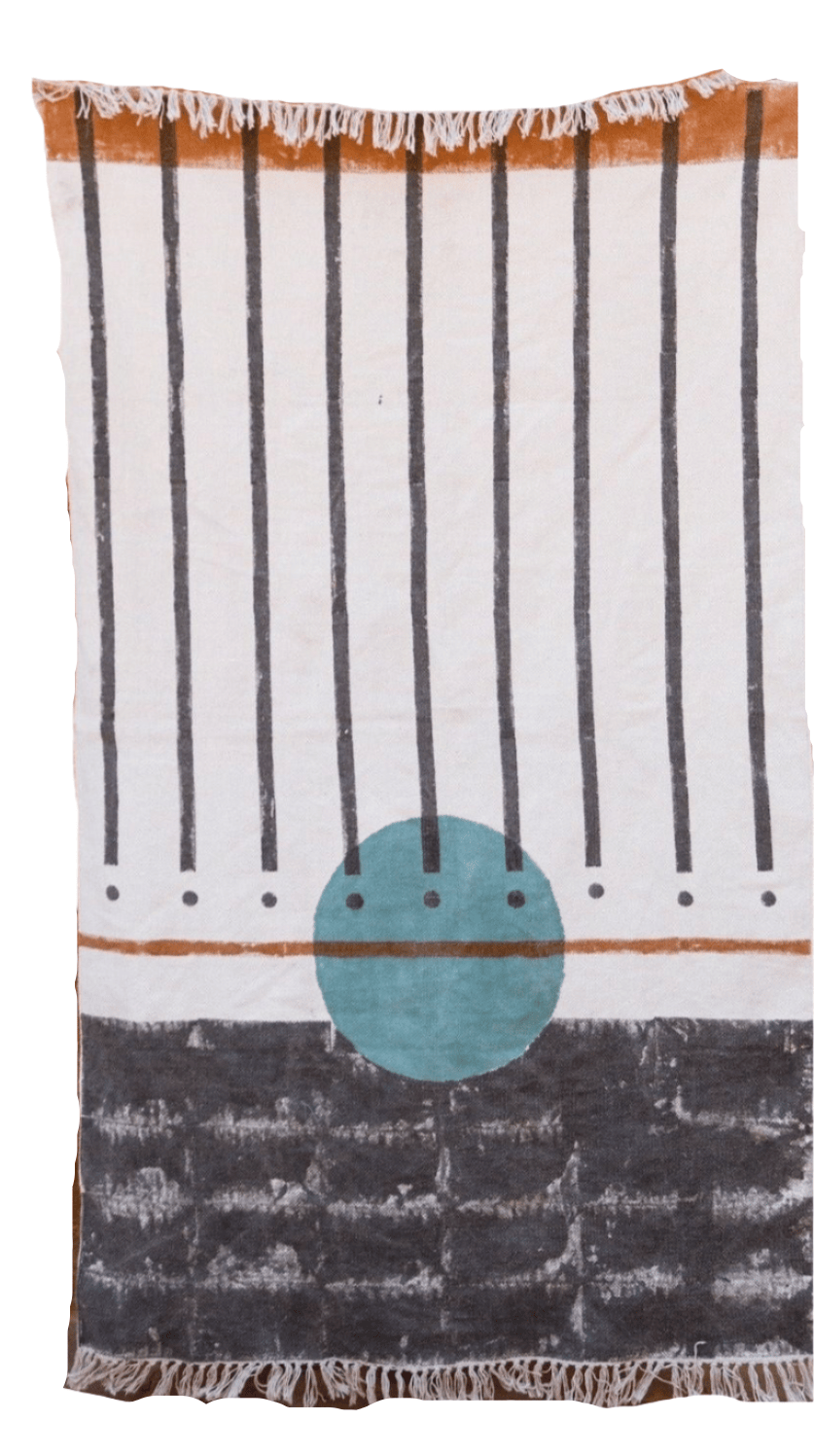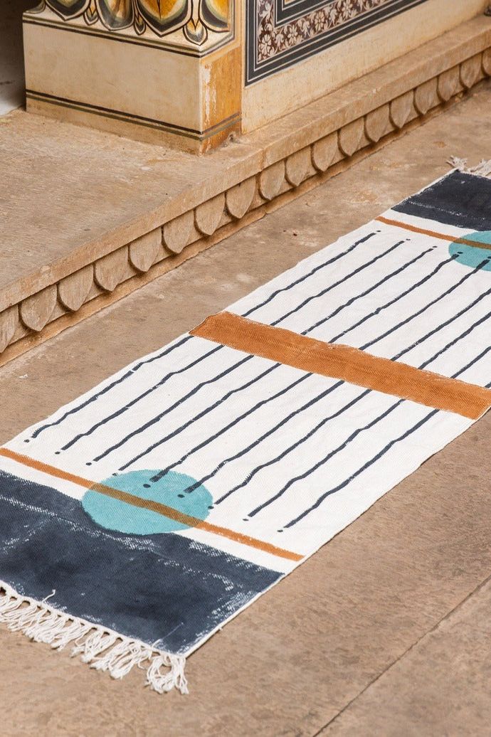 The design is hand-pressed onto each rug using hand-carved wooden blocks dipped in dyes. All rugs are made in small batches.