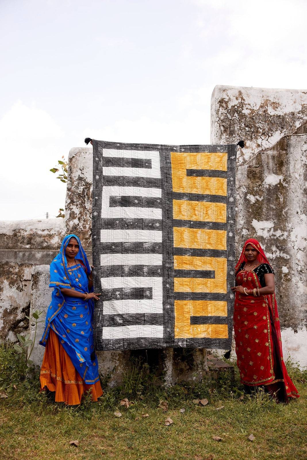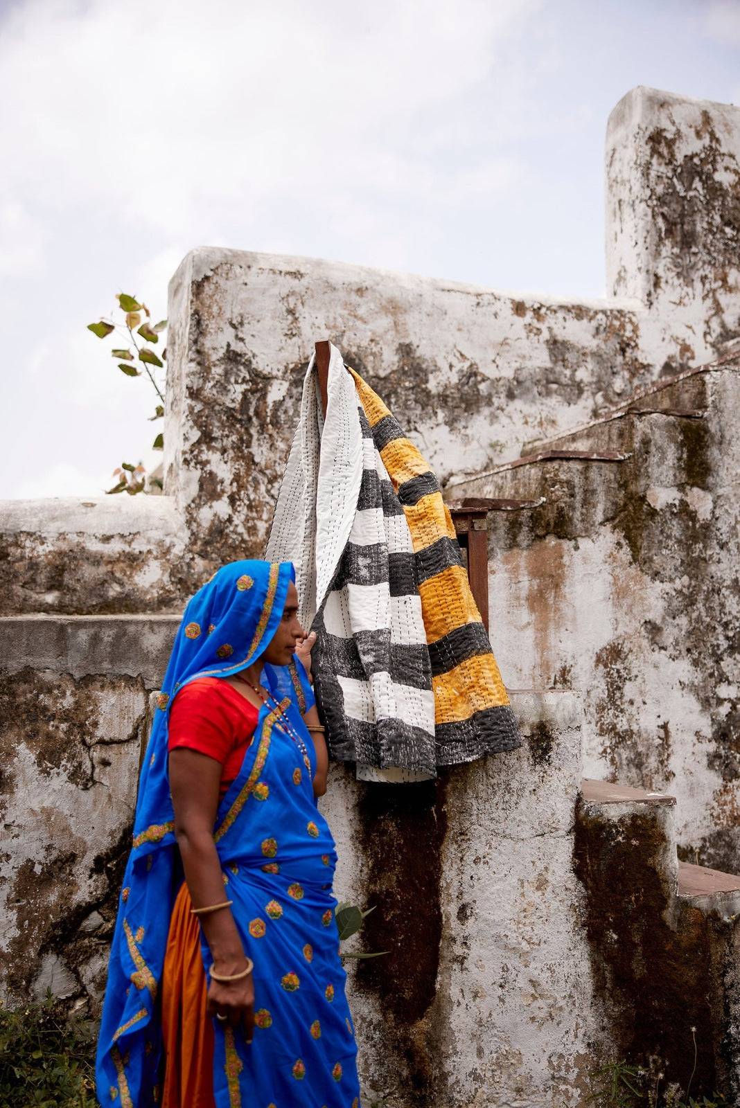 Each throw is handmade, requiring attention from 4 different types of artisans, including wood carvers, block printers, Kantha quiltmakers, and dye specialists.