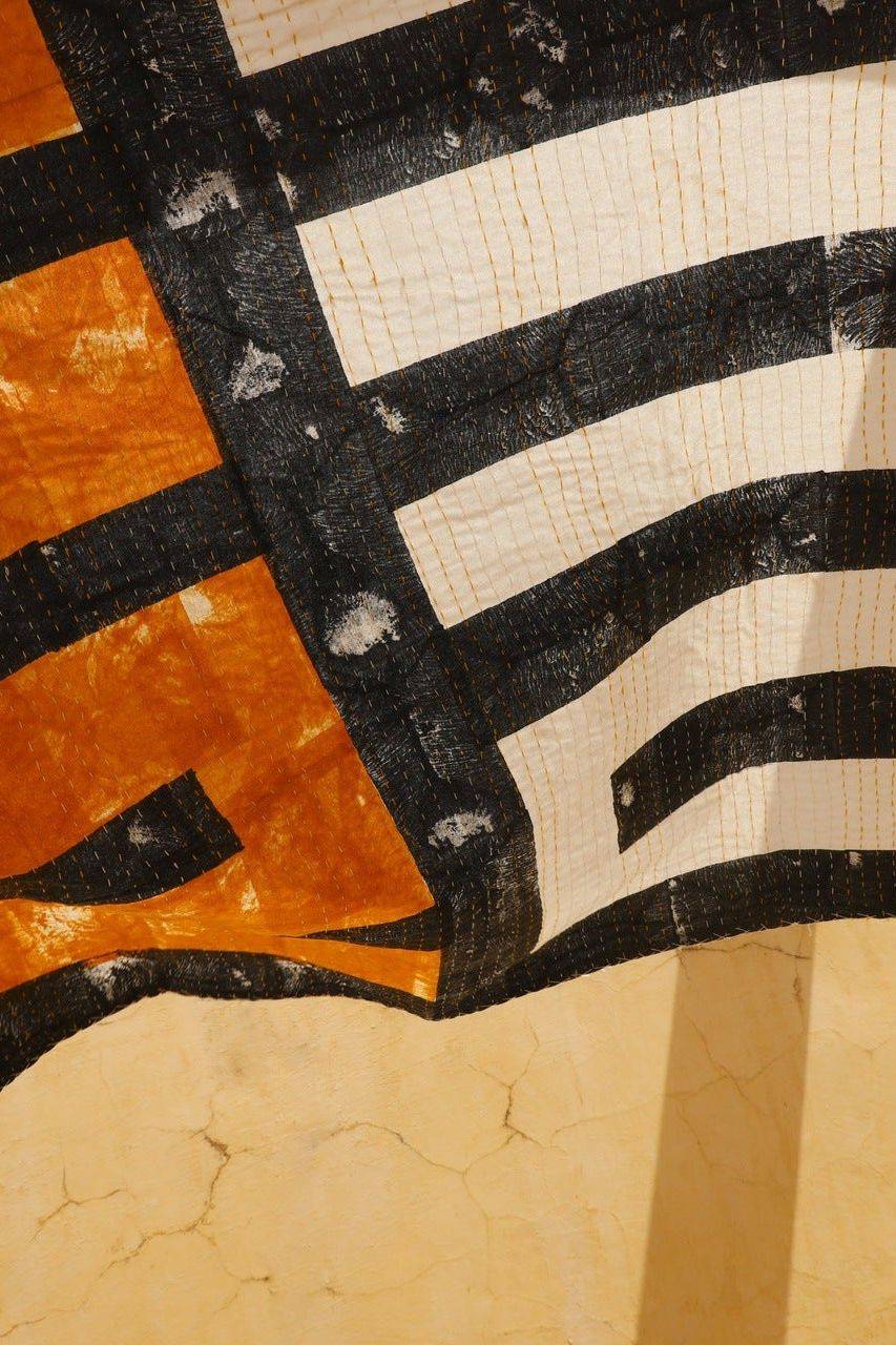 The design is hand-pressed onto pure cotton using hand-carved wooden blocks dipped in dyes. The printed cotton is brought to the homes of Kantha quiltmakers, who hand-stitch the cotton sheet onto a cotton base to create the final throw.