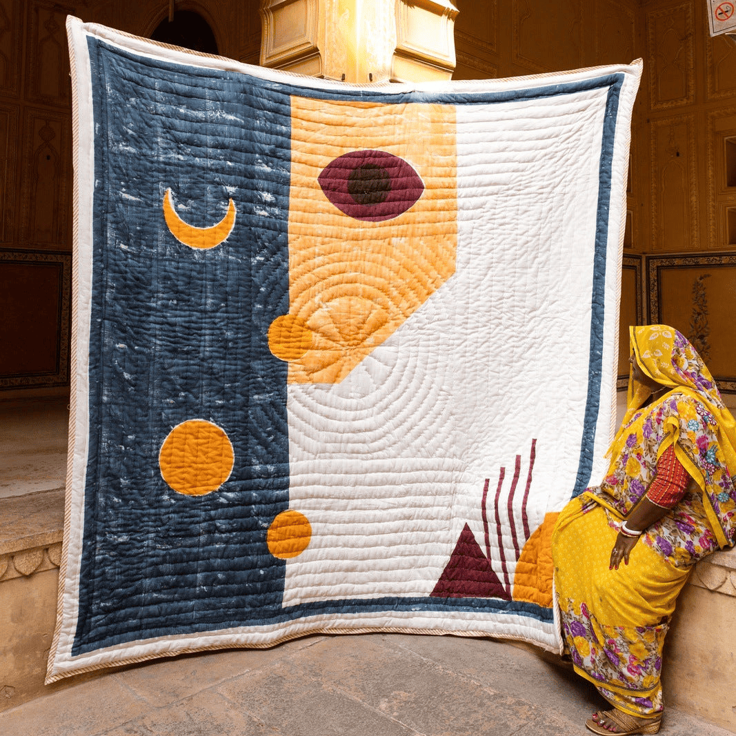 The design is hand-pressed onto each quilt using hand-carved wooden blocks dipped in dyes. The printed cotton shells are brought to the homes of quiltmakers, who stuff and stitch the quilts by hand, creating the final product.