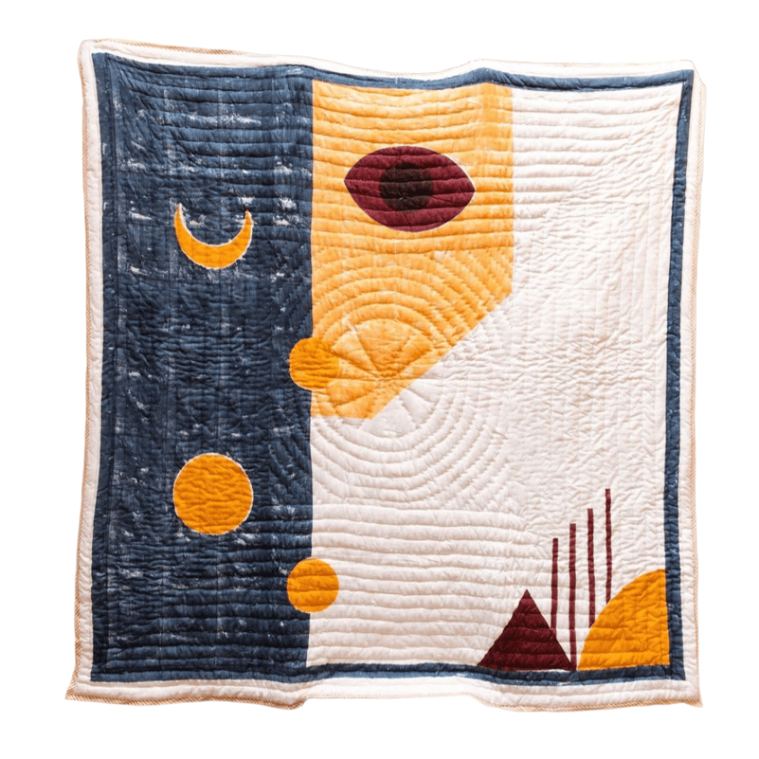 This hand-printed, reversible quilt has a white base on both sides. It showcases abstract designs of moons and mountains in shades of maroon, red, dark blue, and yellow.