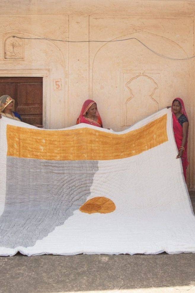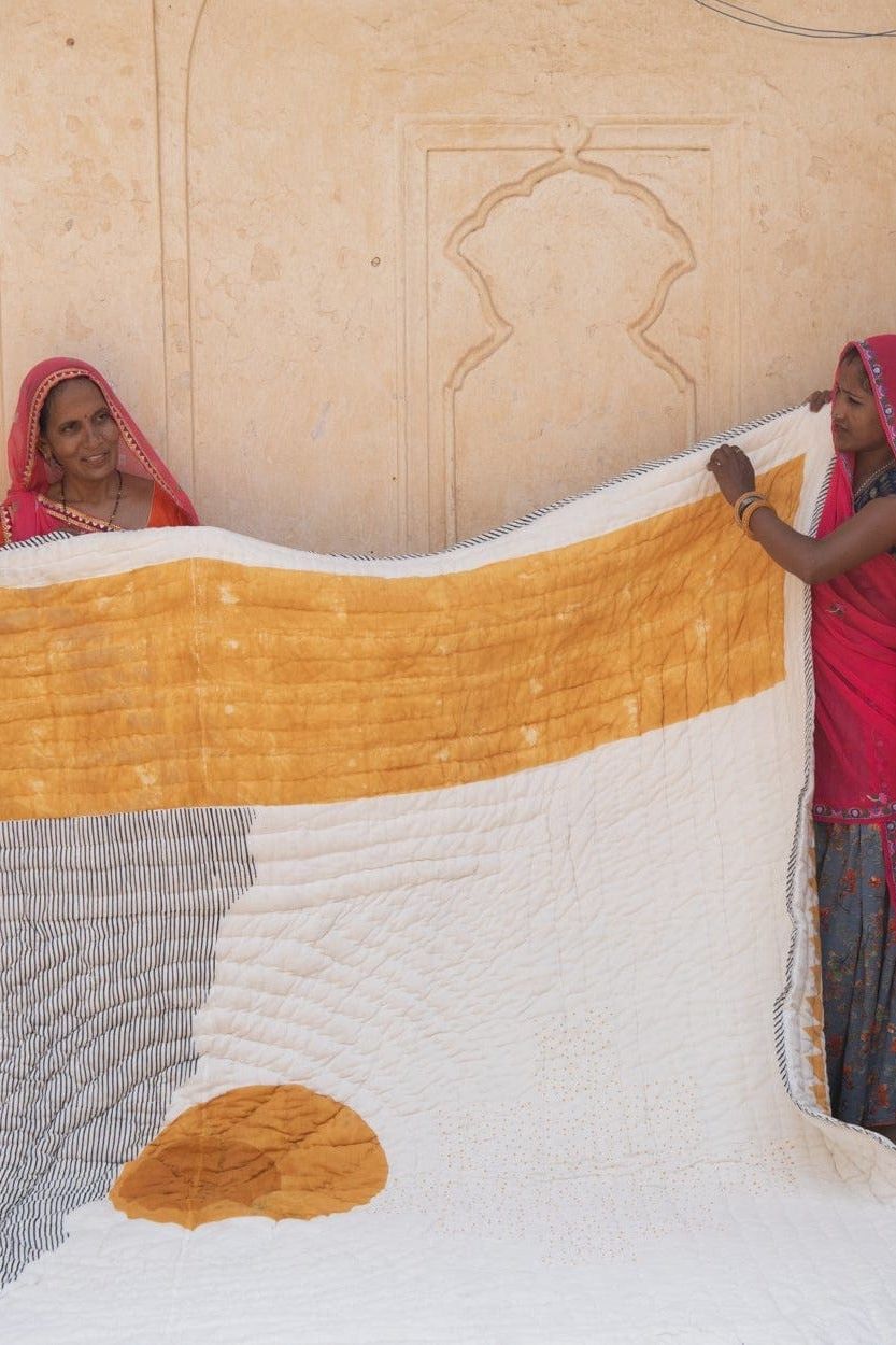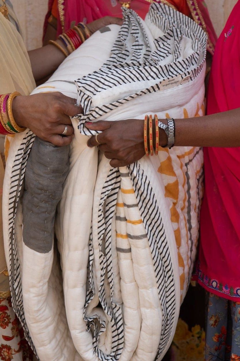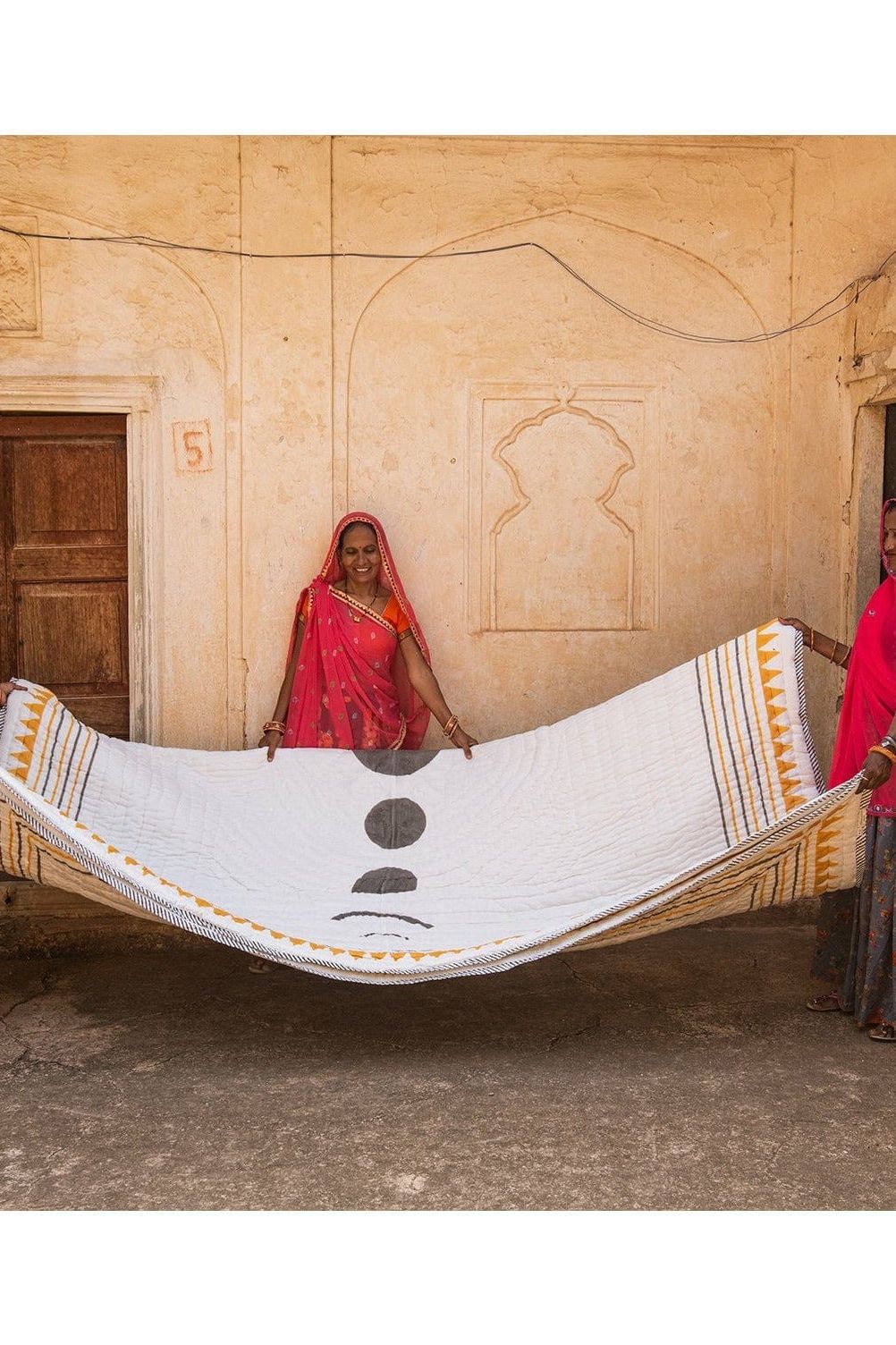 The design is hand-pressed onto each quilt using hand-carved wooden blocks dipped in dyes. The printed cotton shells are brought to the homes of quiltmakers, who stuff and stitch the quilts by hand, creating the final product.