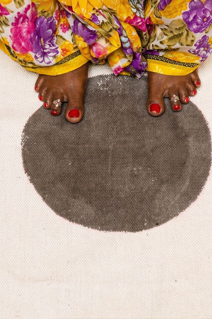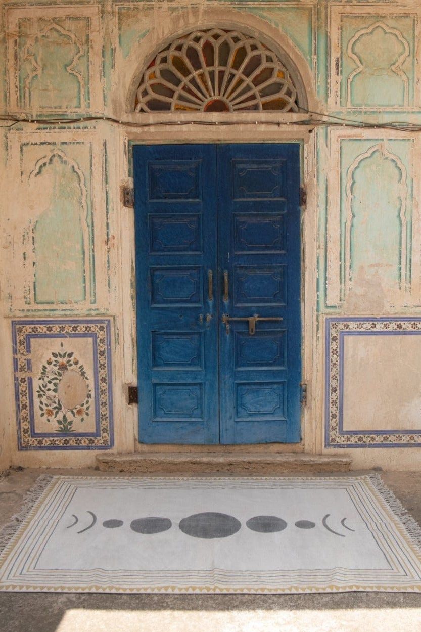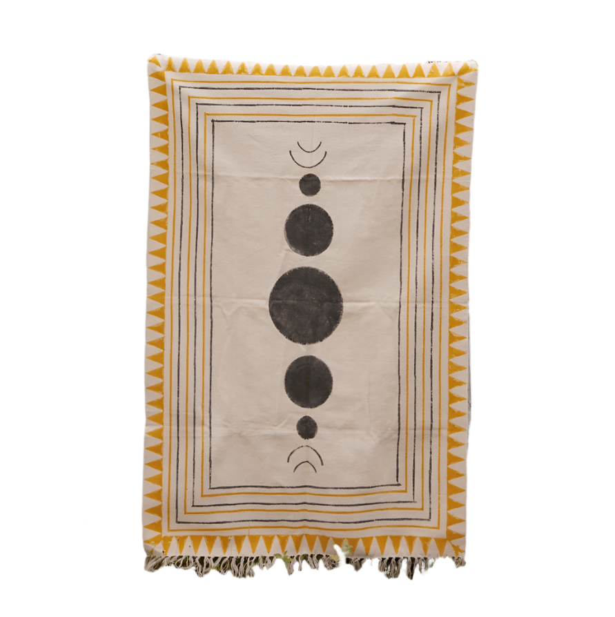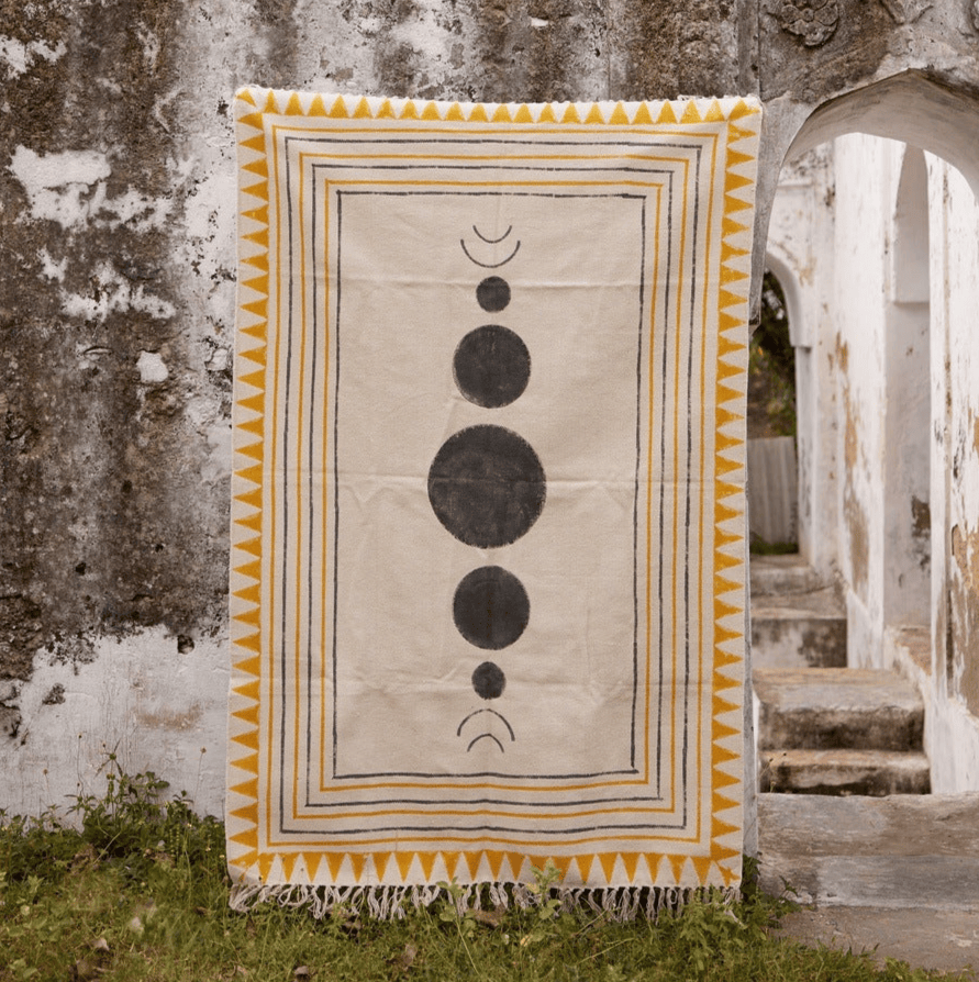 The design is hand-pressed onto each rug using hand-carved wooden blocks dipped in dyes. All rugs are made in small batches.