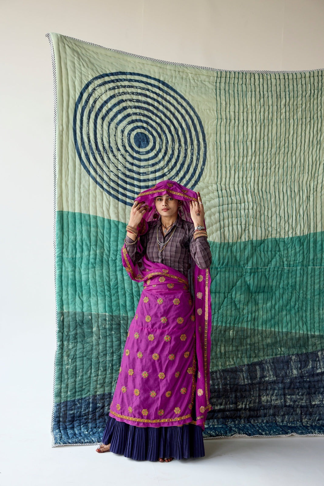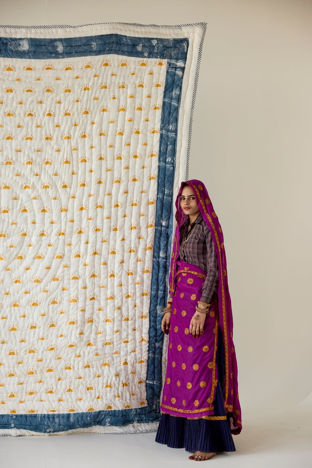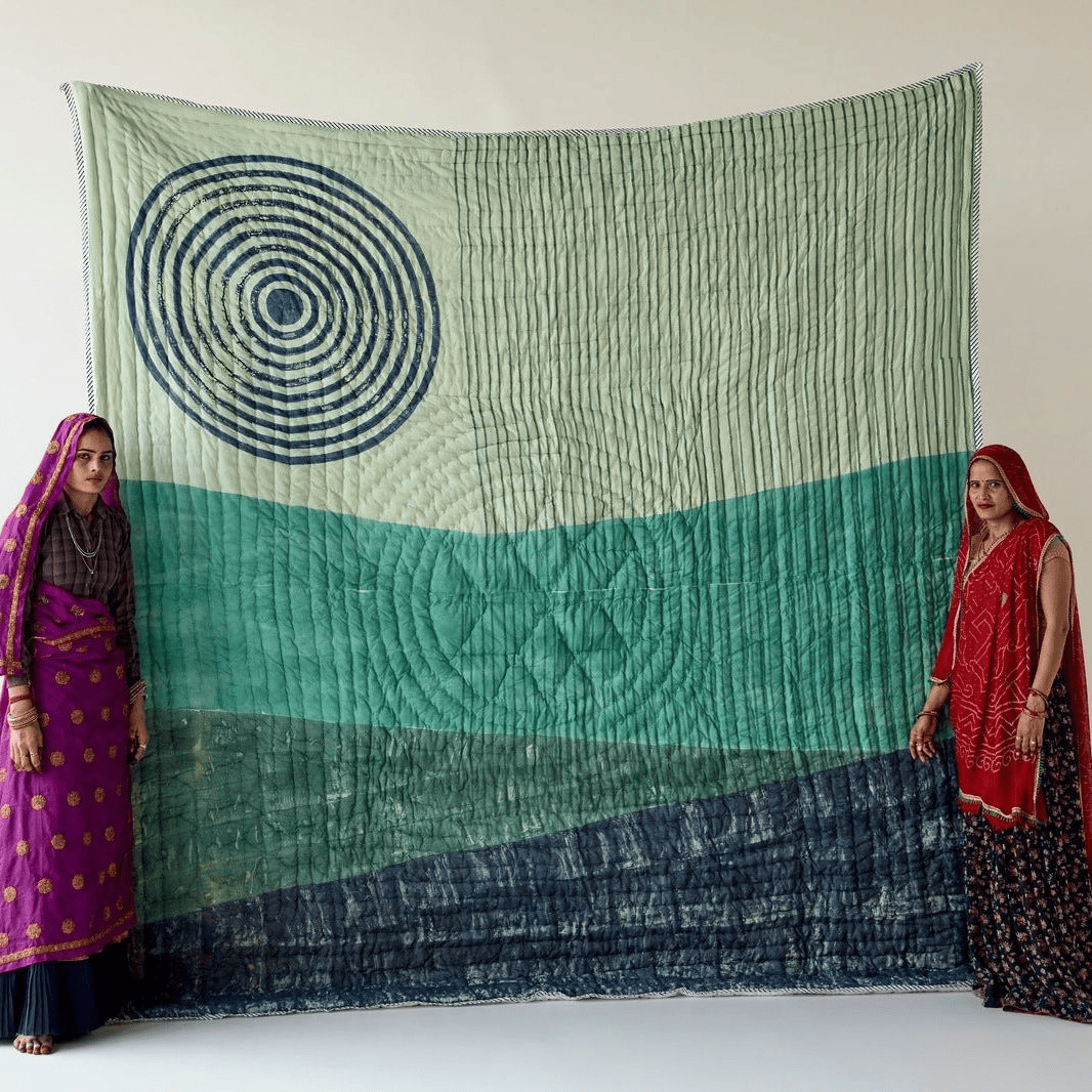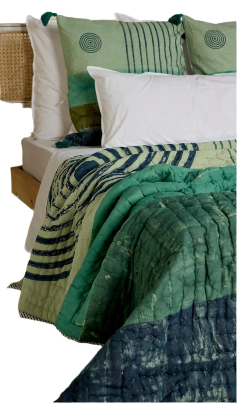 The design is hand-pressed onto each quilt using hand-carved wooden blocks dipped in dyes. The printed cotton shells are brought to the homes of quiltmakers, who stuff and stitch the quilts by hand, creating the final product.