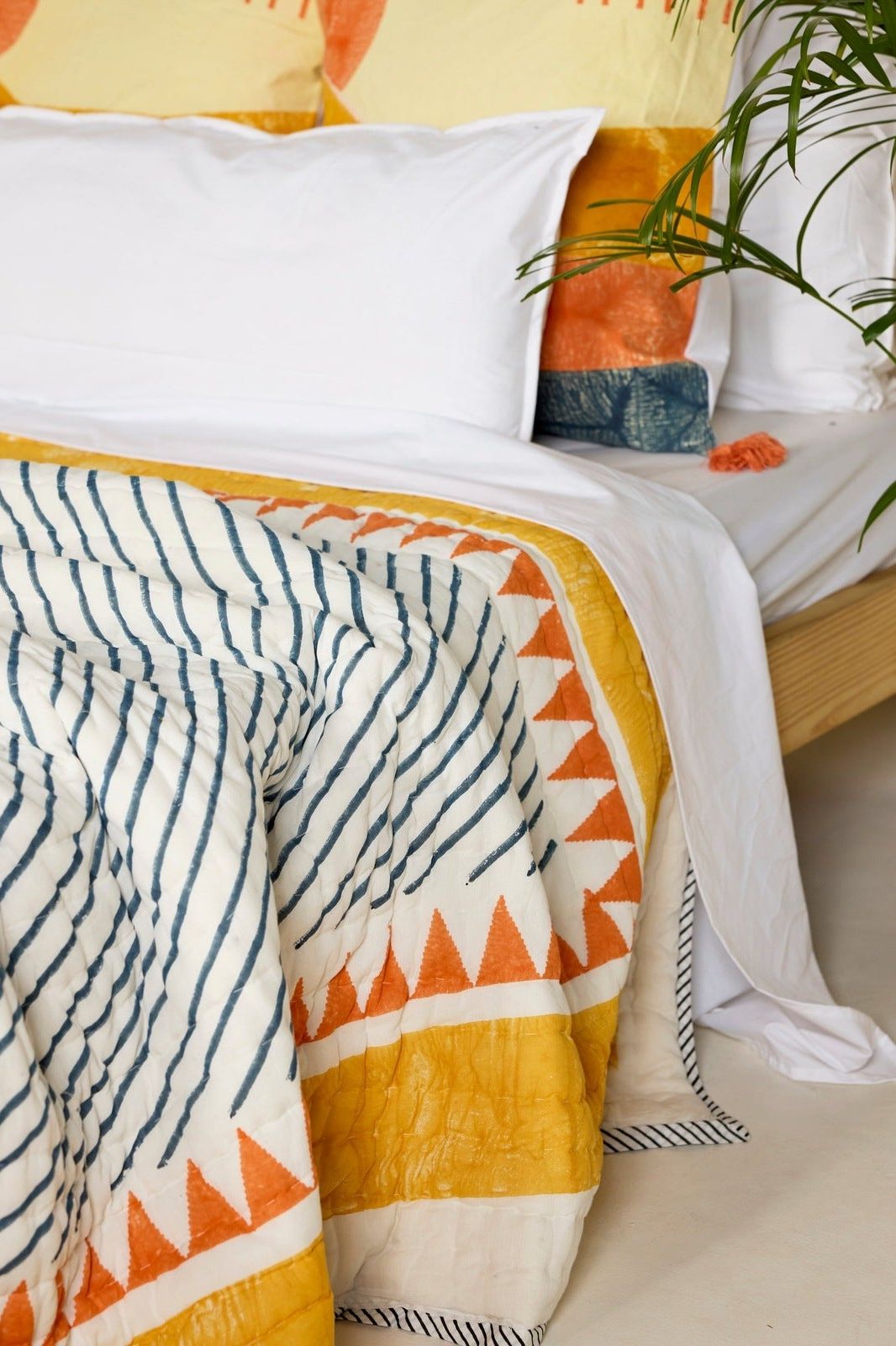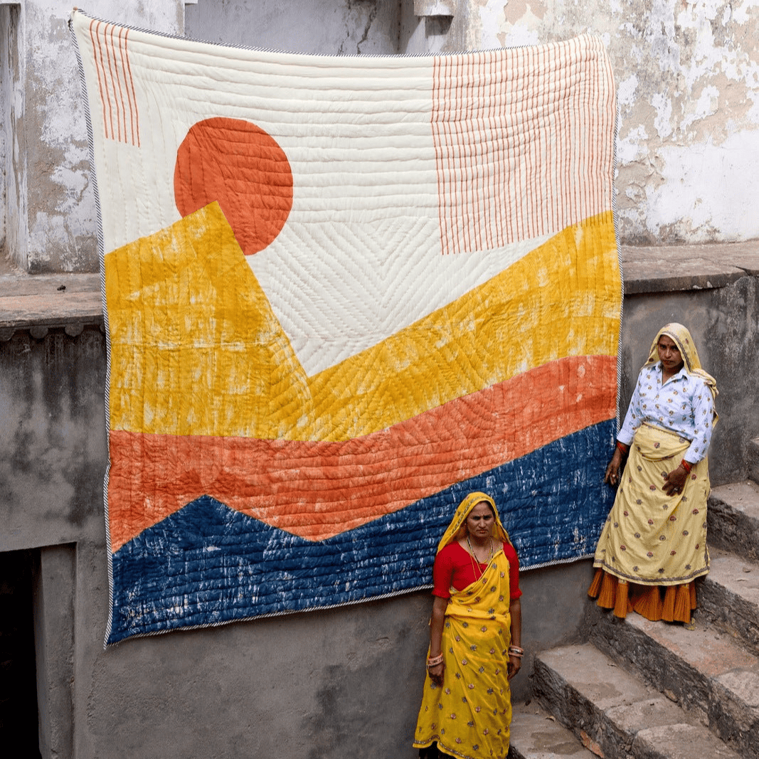 The design is hand-pressed onto each quilt using hand-carved wooden blocks dipped in dyes. The printed cotton shells are brought to the homes of quiltmakers, who stuff and stitch the quilts by hand, creating the final product.