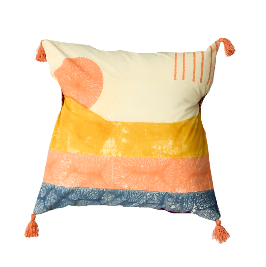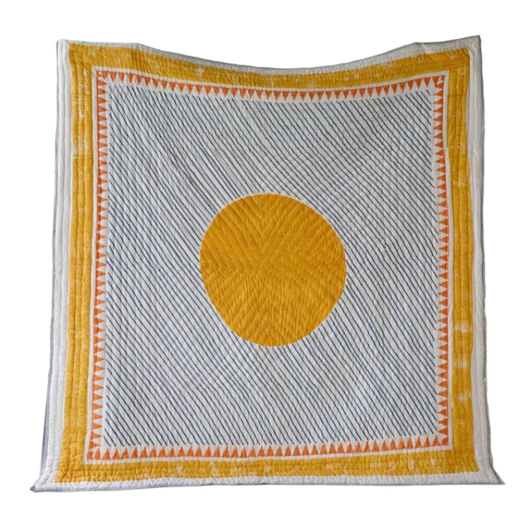 Introducing the Ouray Quilt, a mesmerizing reflection of the San Juan Mountains' majesty. This quilt captivates with its abstract depiction of a sunset cascading over mountains in shades of yellow, orange, and midnight blue. Expertly handcrafted, each quilt marries the traditional arts of hand-block printing and Kantha stitching, performed by skilled artisans using 100% cotton. The quilt's reverse side features a minimalist design of a yellow circle complemented by blue stripes, offering a striking contrast and versatility in styling. Made with care and precision, the Ouray Quilt stands as a testament to both natural beauty and artisanal craftsmanship.