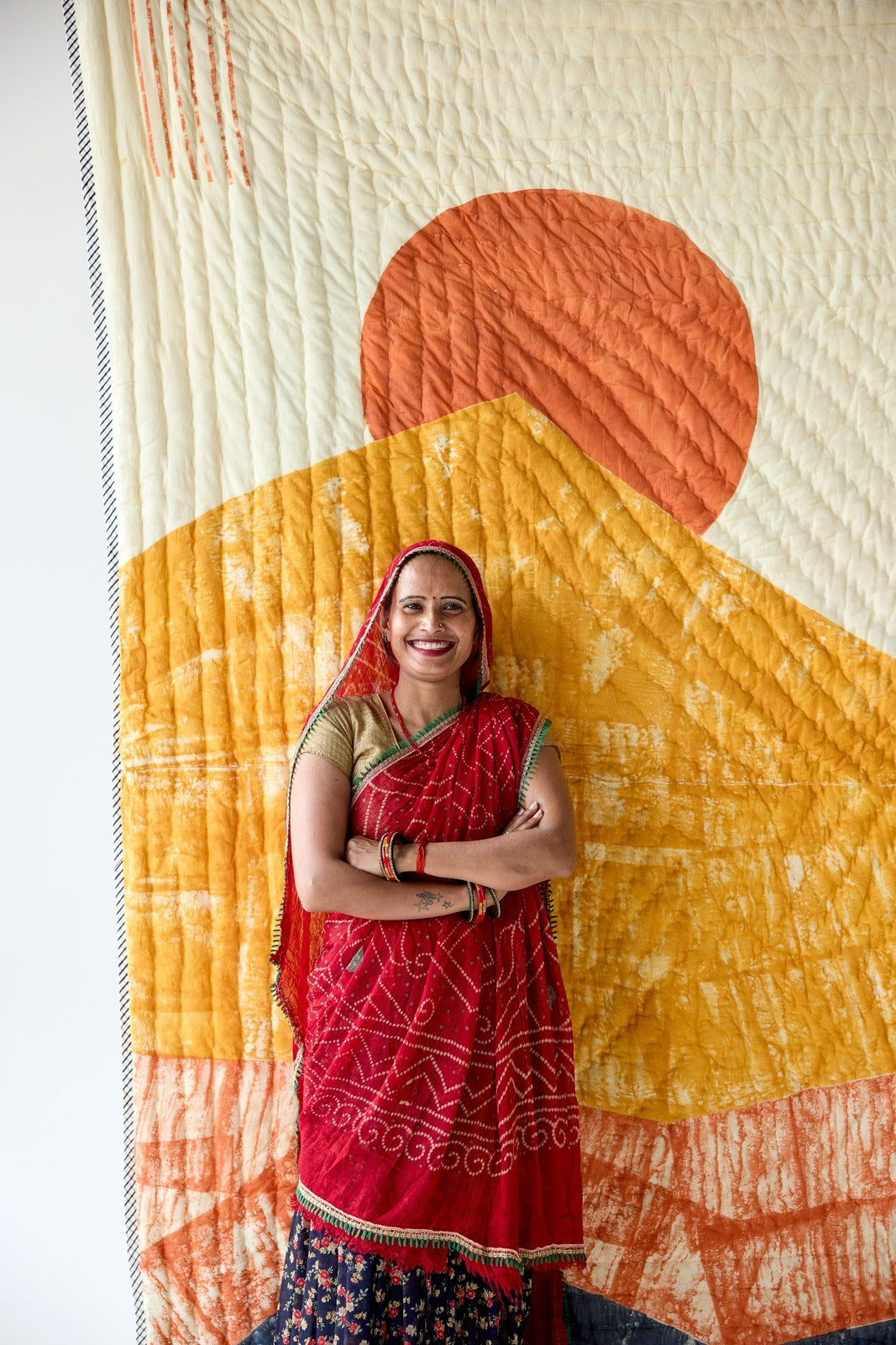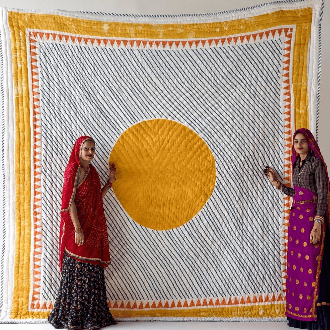 The design is hand-pressed onto each quilt using hand-carved wooden blocks dipped in dyes. The printed cotton shells are brought to the homes of quiltmakers, who stuff and stitch the quilts by hand, creating the final product.