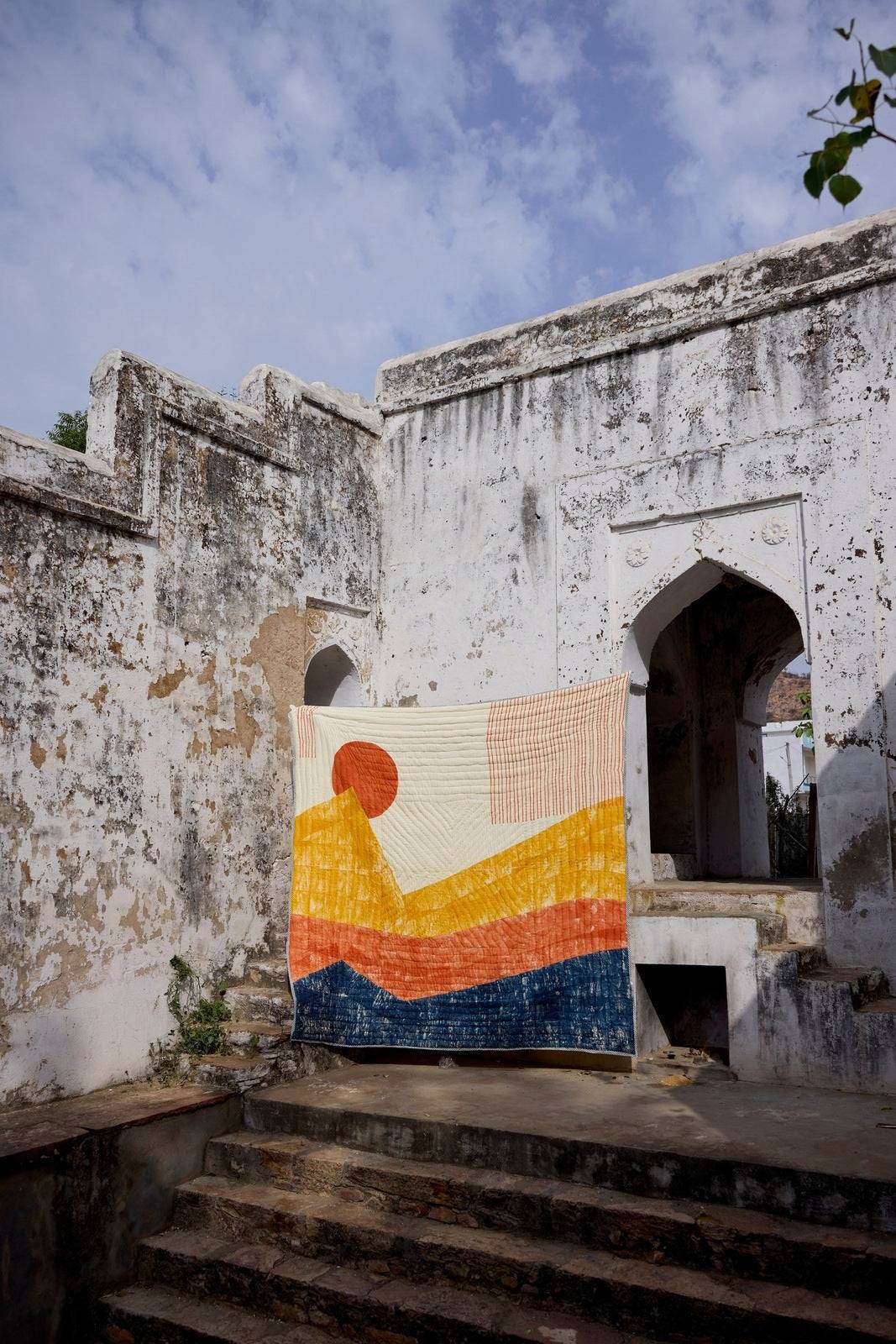 Explore the serene simplicity of the Ouray Quilt's reverse side, inspired by the tranquil beauty of Ouray, Colorado's San Juan Mountains. This side presents a minimalist yet striking design of a yellow circle amidst blue stripes, offering a contemporary contrast to the vibrant mountain sunset of the quilt's front side. Each quilt is a labor of love, handcrafted by skilled artisans through traditional hand-block printing and Kantha stitching on 100% cotton. The reversible nature of this quilt provides versatile styling options, allowing you to switch between the dynamic energy of an abstract mountain sunset and the calm, geometric minimalism with ease. Perfect for those who appreciate the blend of modern design and artisanal quality, the Ouray Quilt transforms any bedroom into a space of artistic expression and cozy comfort.