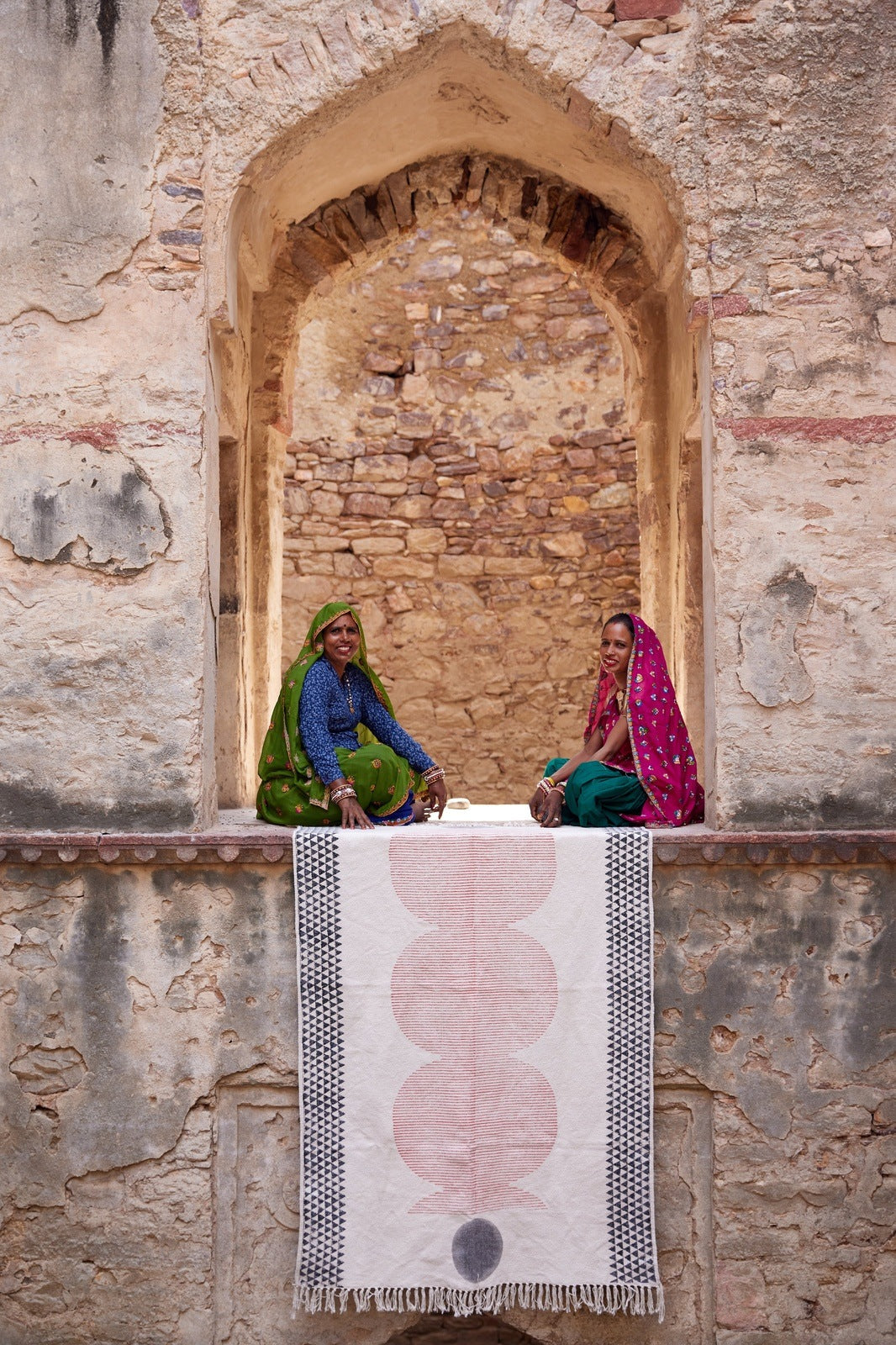 Each rug is handmade, requiring attention from 4 artisans, including wood carvers, block printers, weavers, and dye specialists.