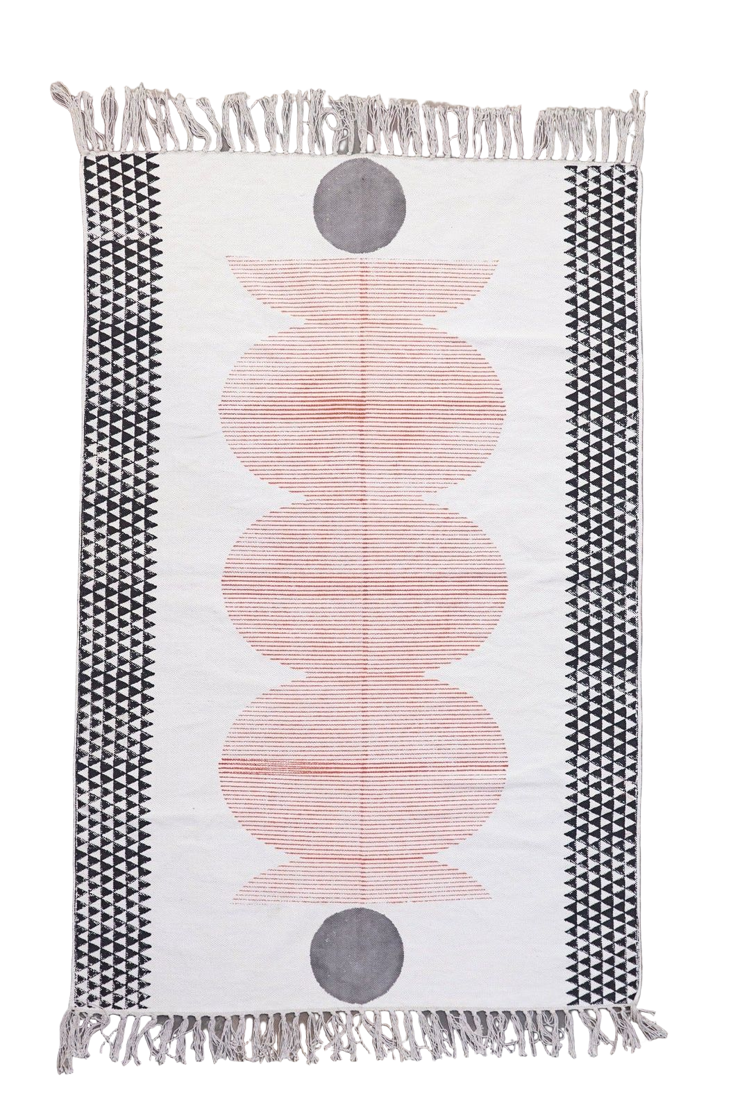 The design is hand-pressed onto each rug using hand-carved wooden blocks dipped in dyes. All rugs are made in small batches.