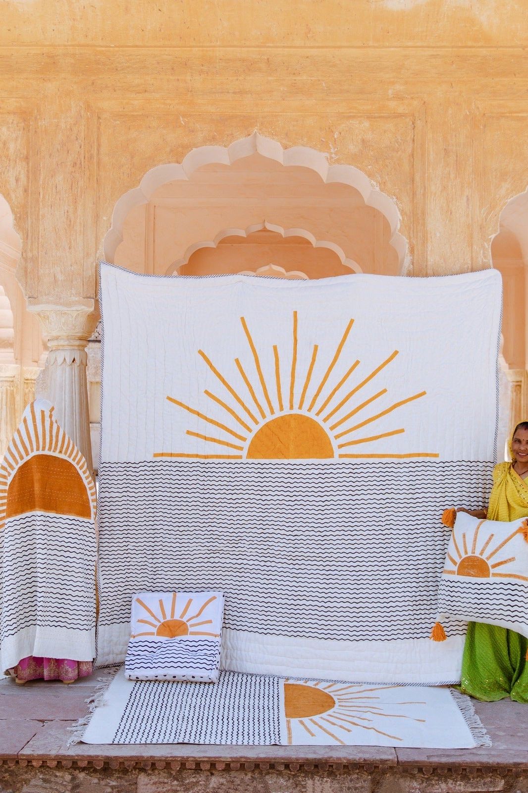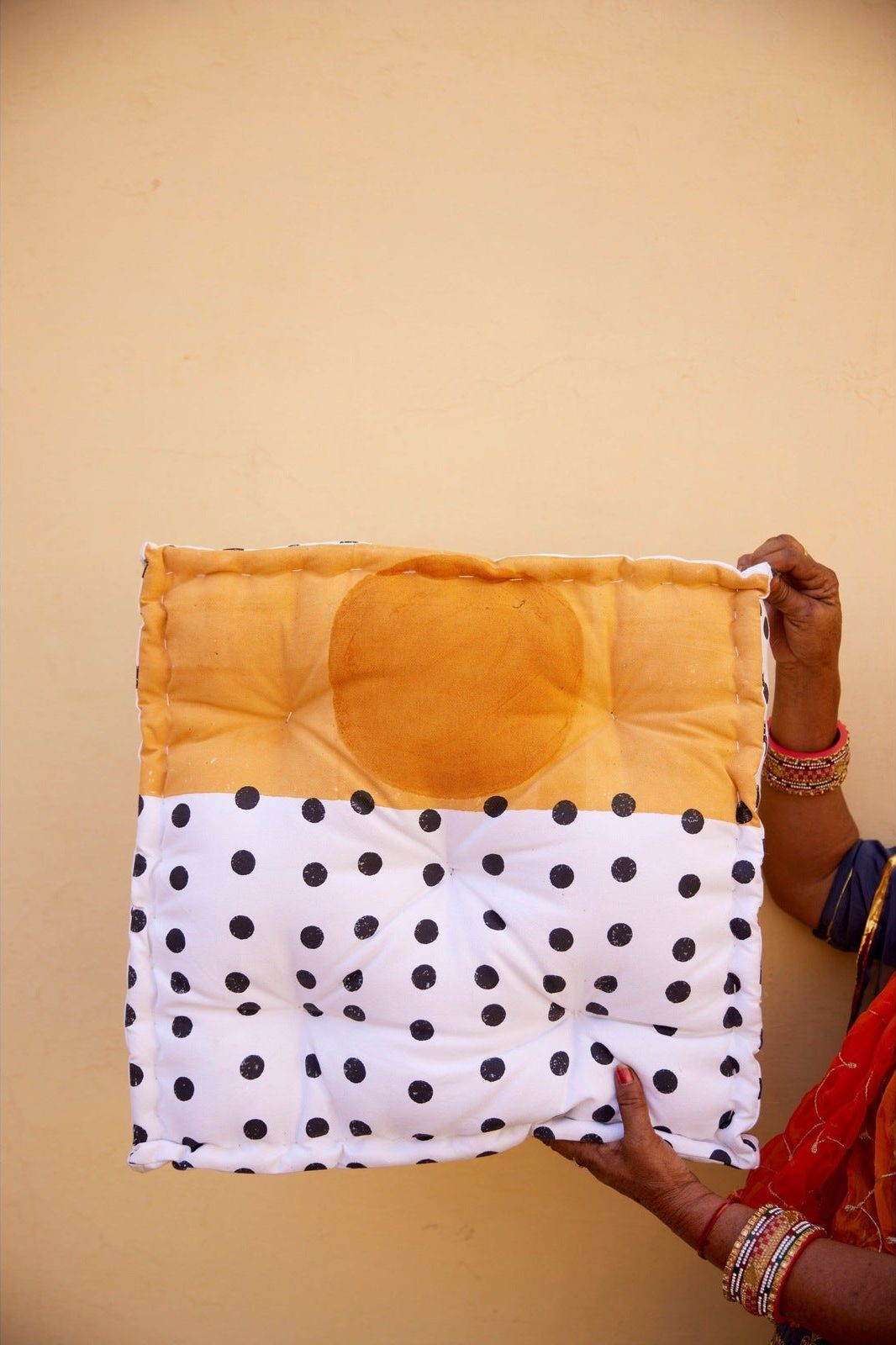 The cushion’s design is hand-pressed onto cotton using hand-carved wooden blocks dipped in dyes. The printed cotton shells are then brought to the homes of sewists who stuff and stitch the pillows by hand, creating the final product.