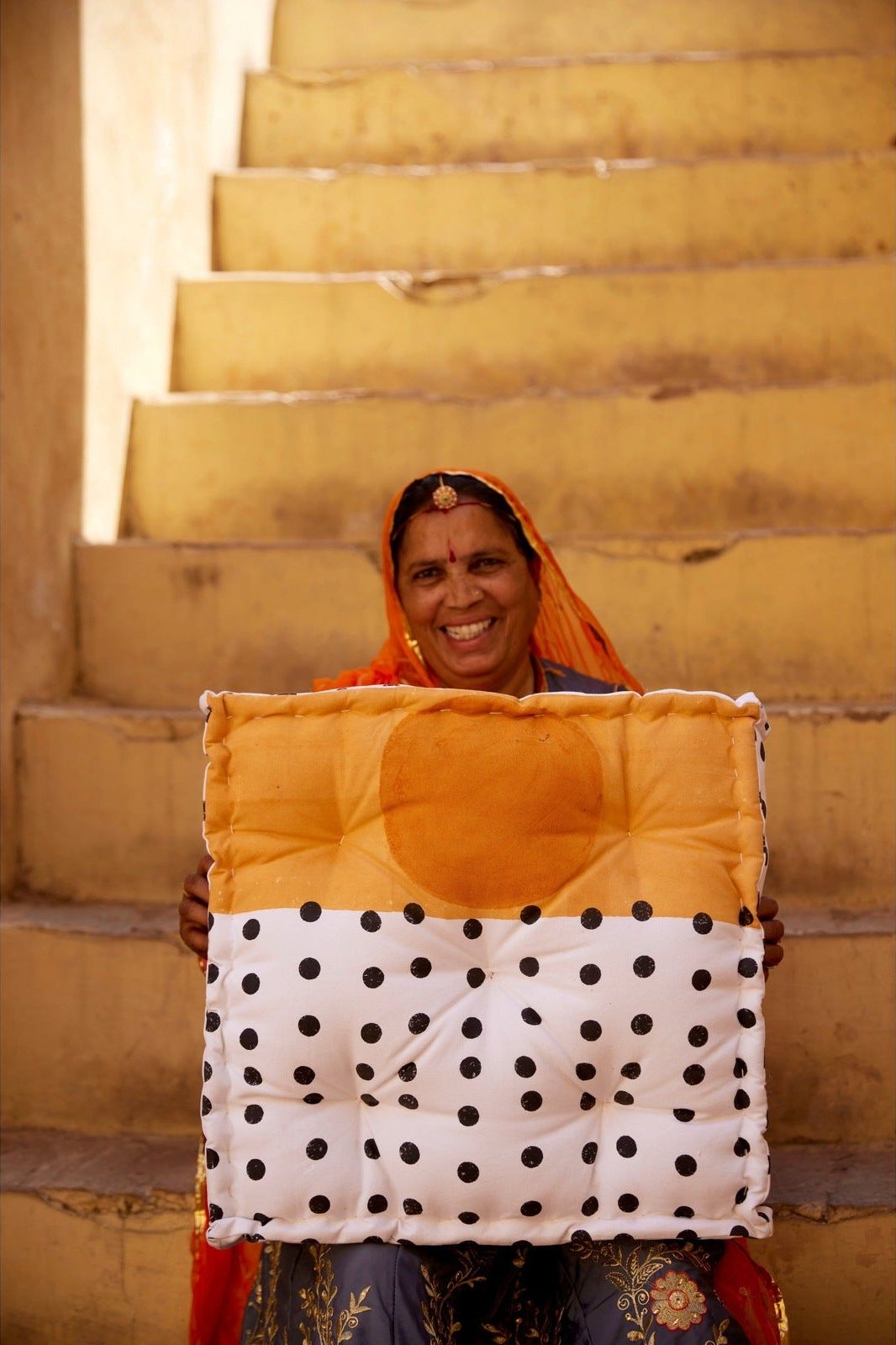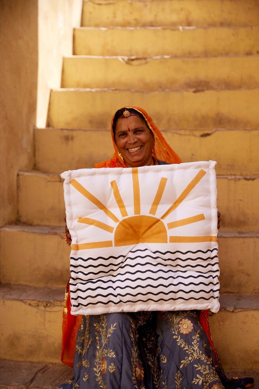 Each floor cushion is handmade, requiring attention from four types of artisans, including wood carvers, block printers, sewists, and dye specialists.