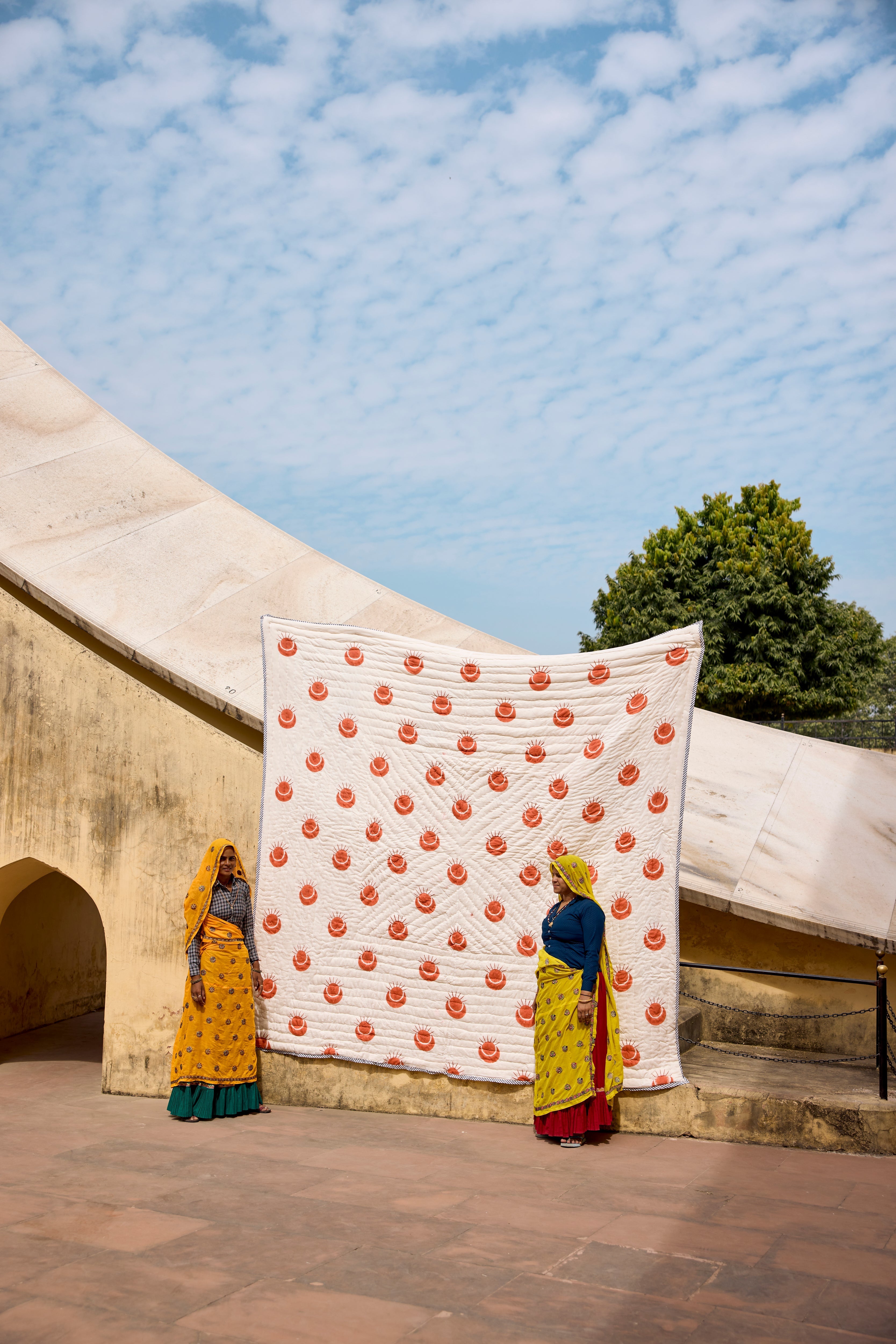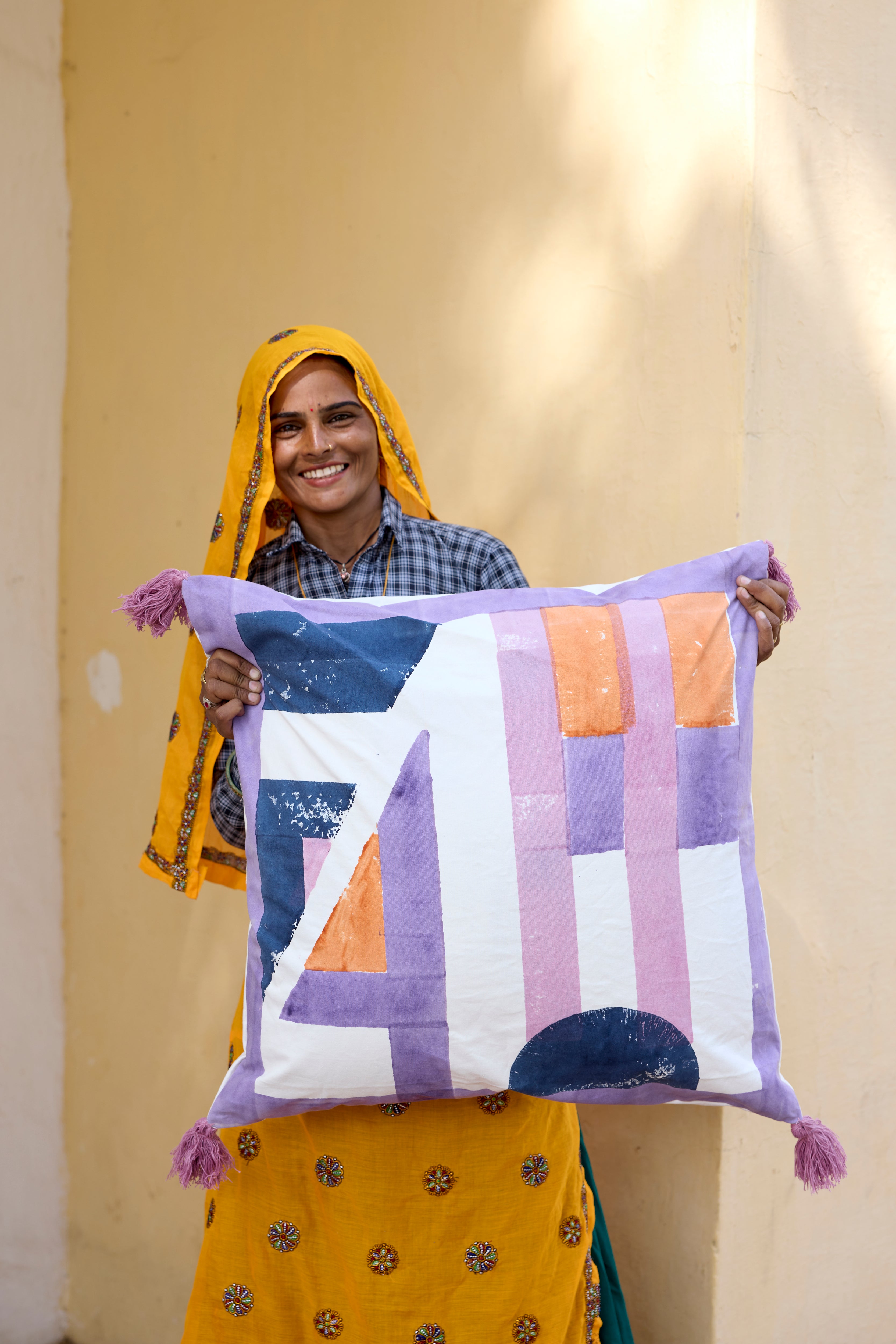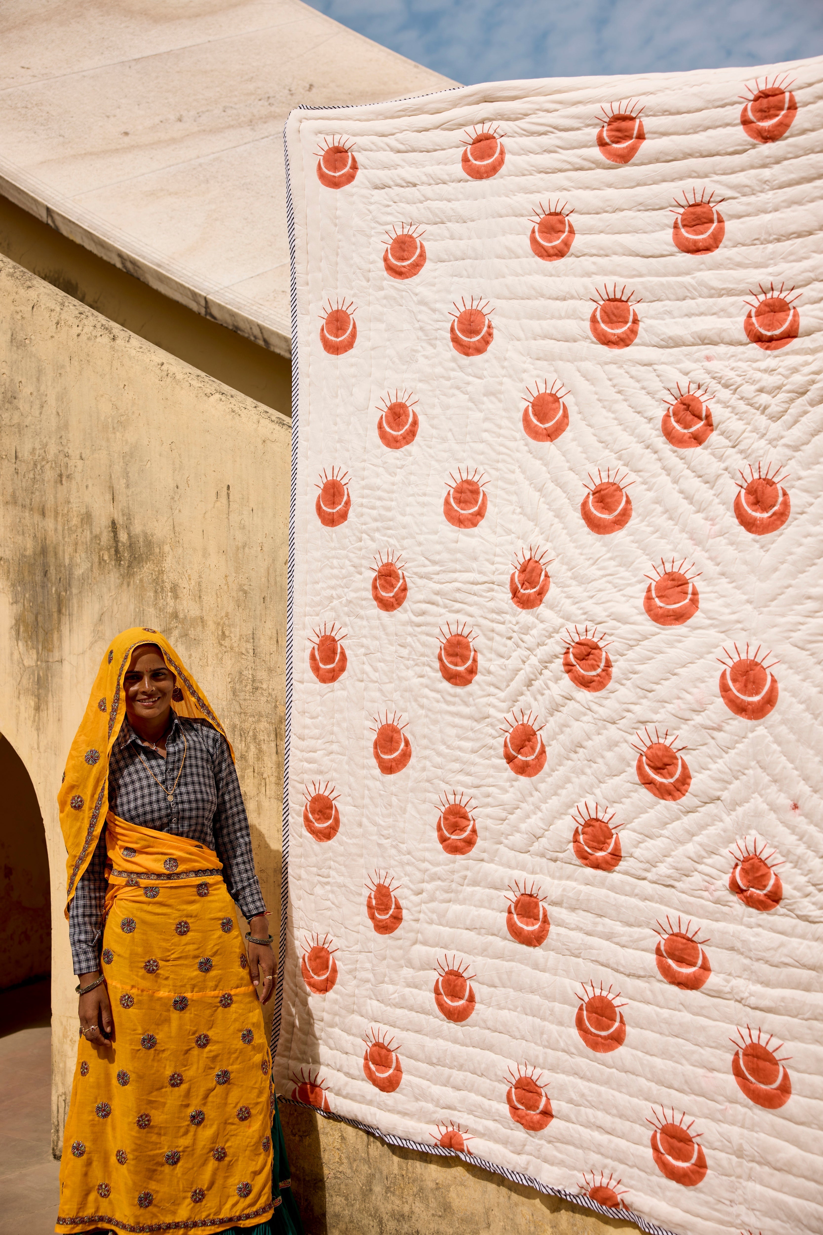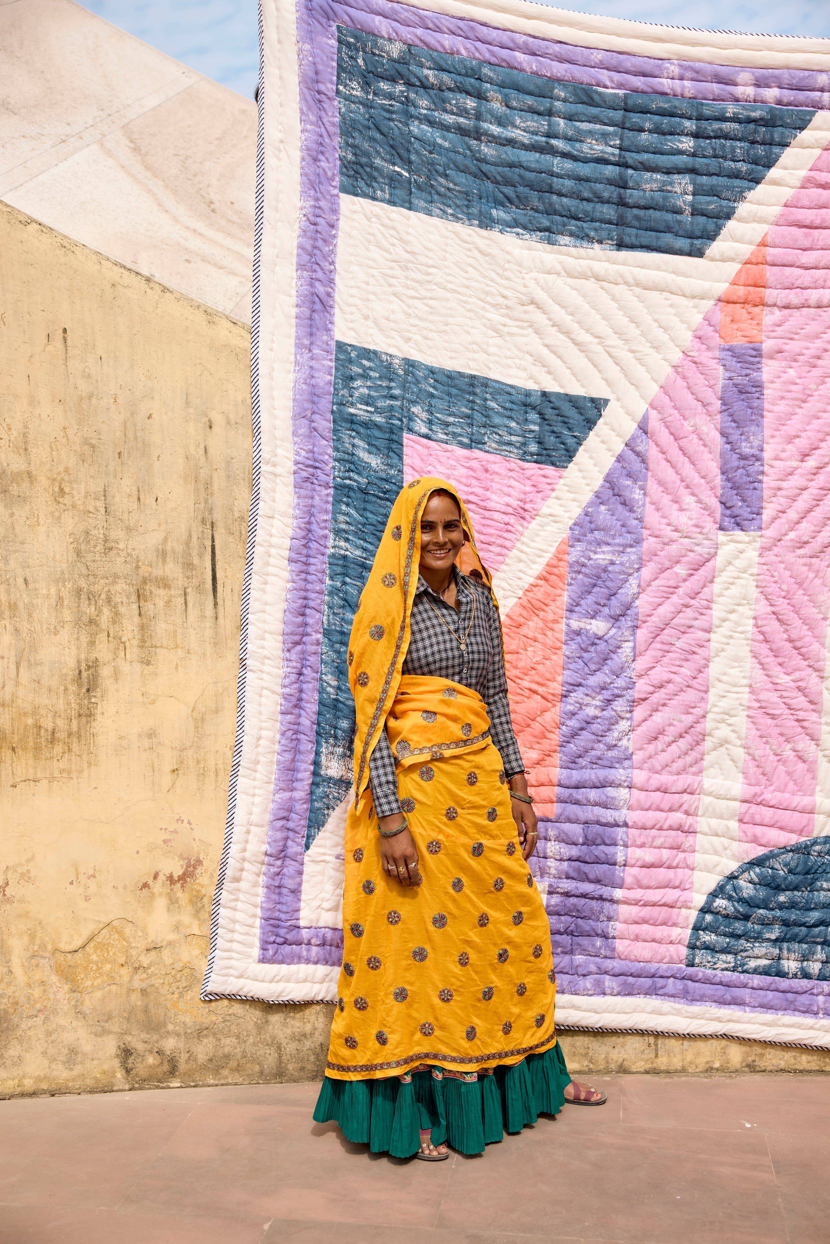 The design is hand-pressed onto each quilt using hand-carved wooden blocks dipped in dyes. The printed cotton shells are brought to the homes of quiltmakers, who stuff and stitch the quilts by hand, creating the final product.