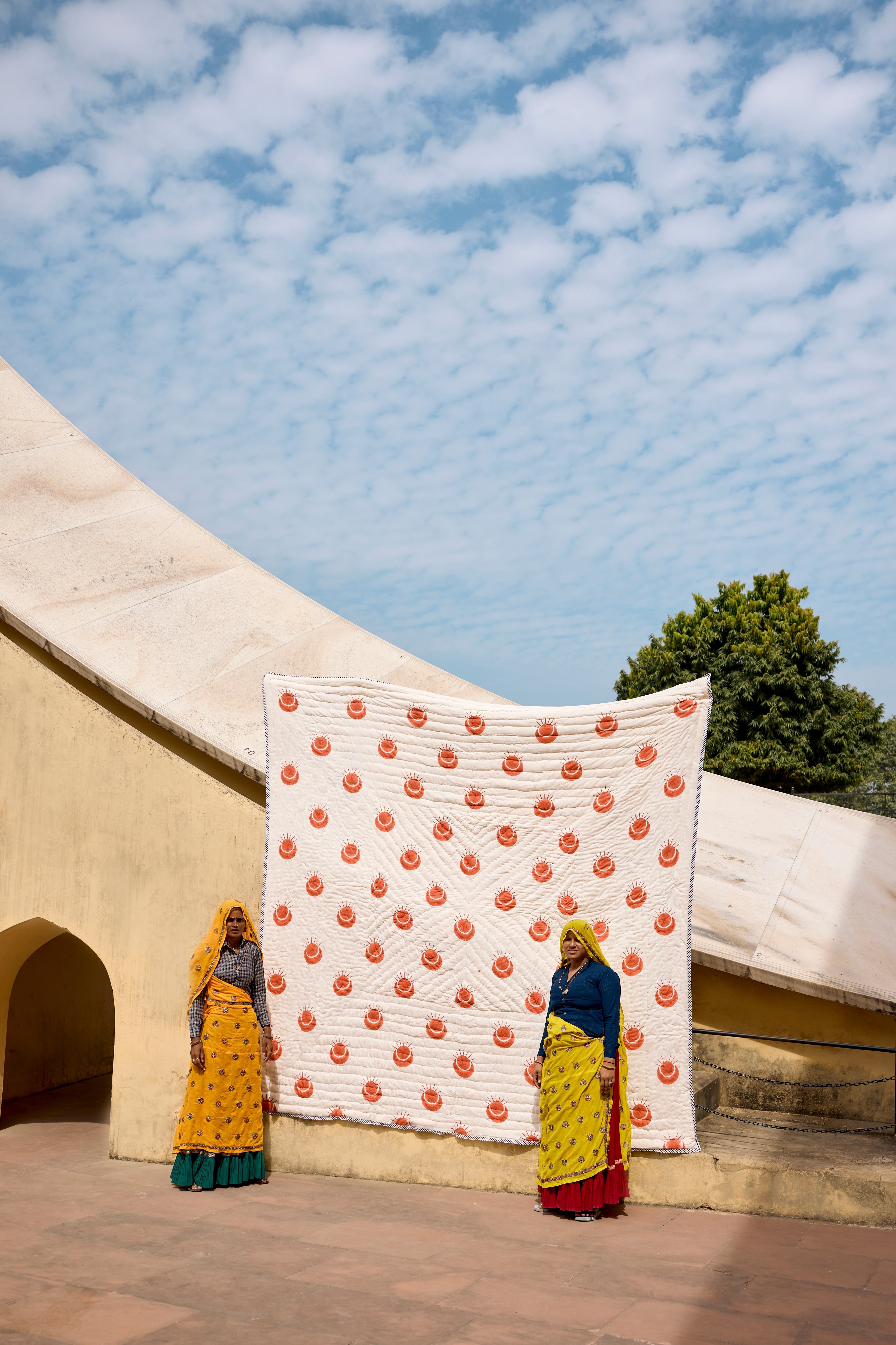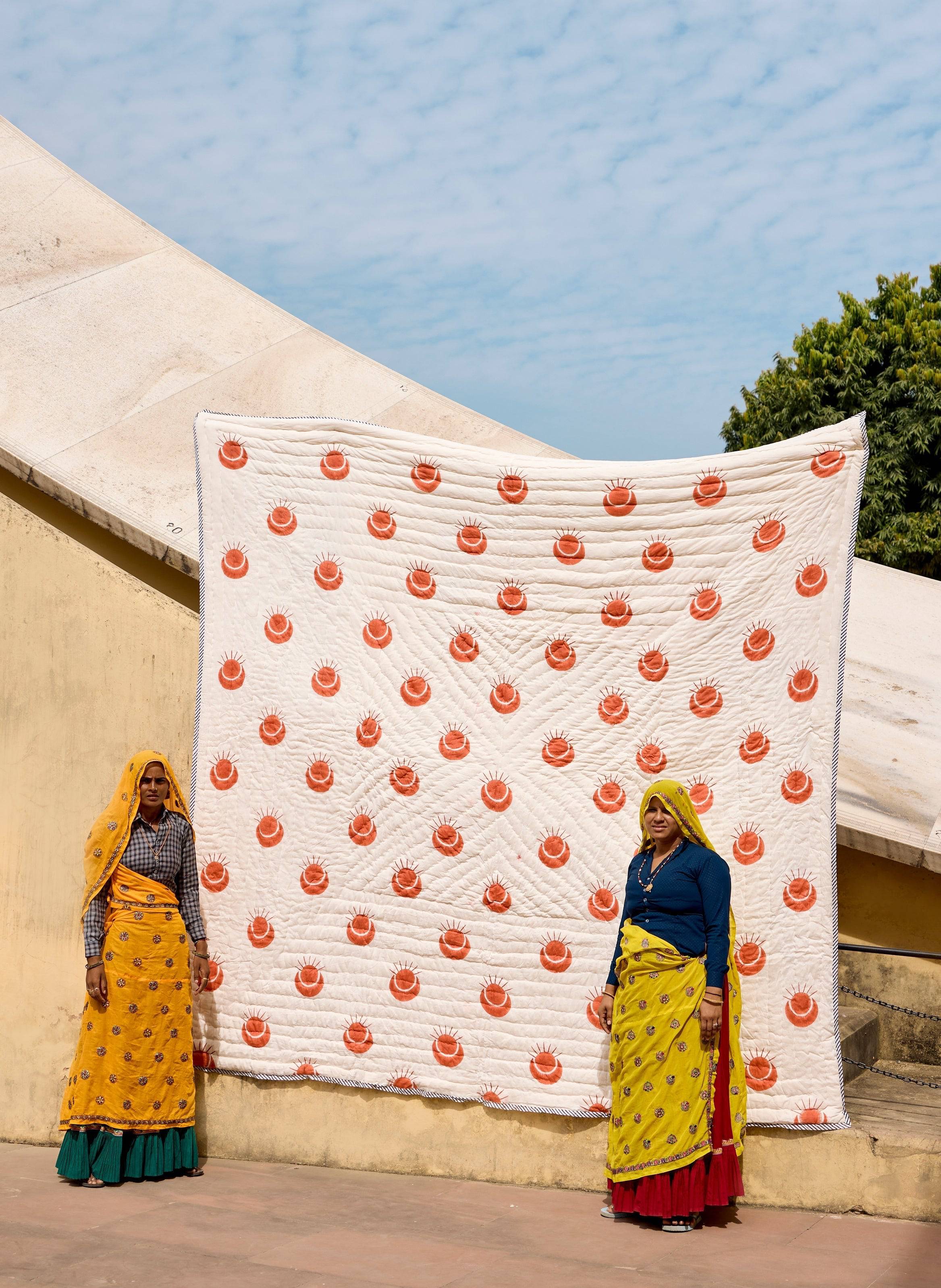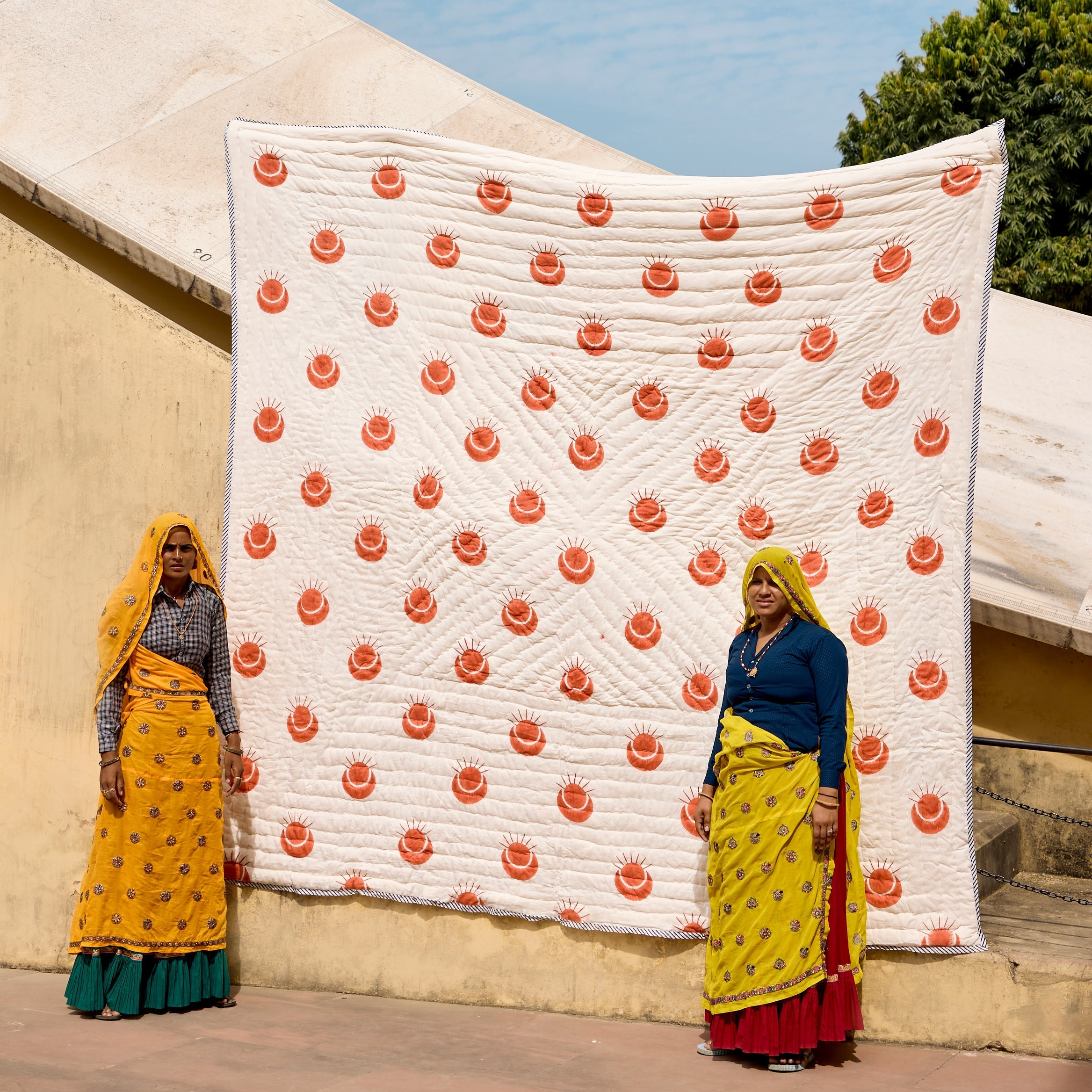 The design is hand-pressed onto each quilt using hand-carved wooden blocks dipped in dyes. The printed cotton shells are brought to the homes of quiltmakers, who stuff and stitch the quilts by hand, creating the final product.