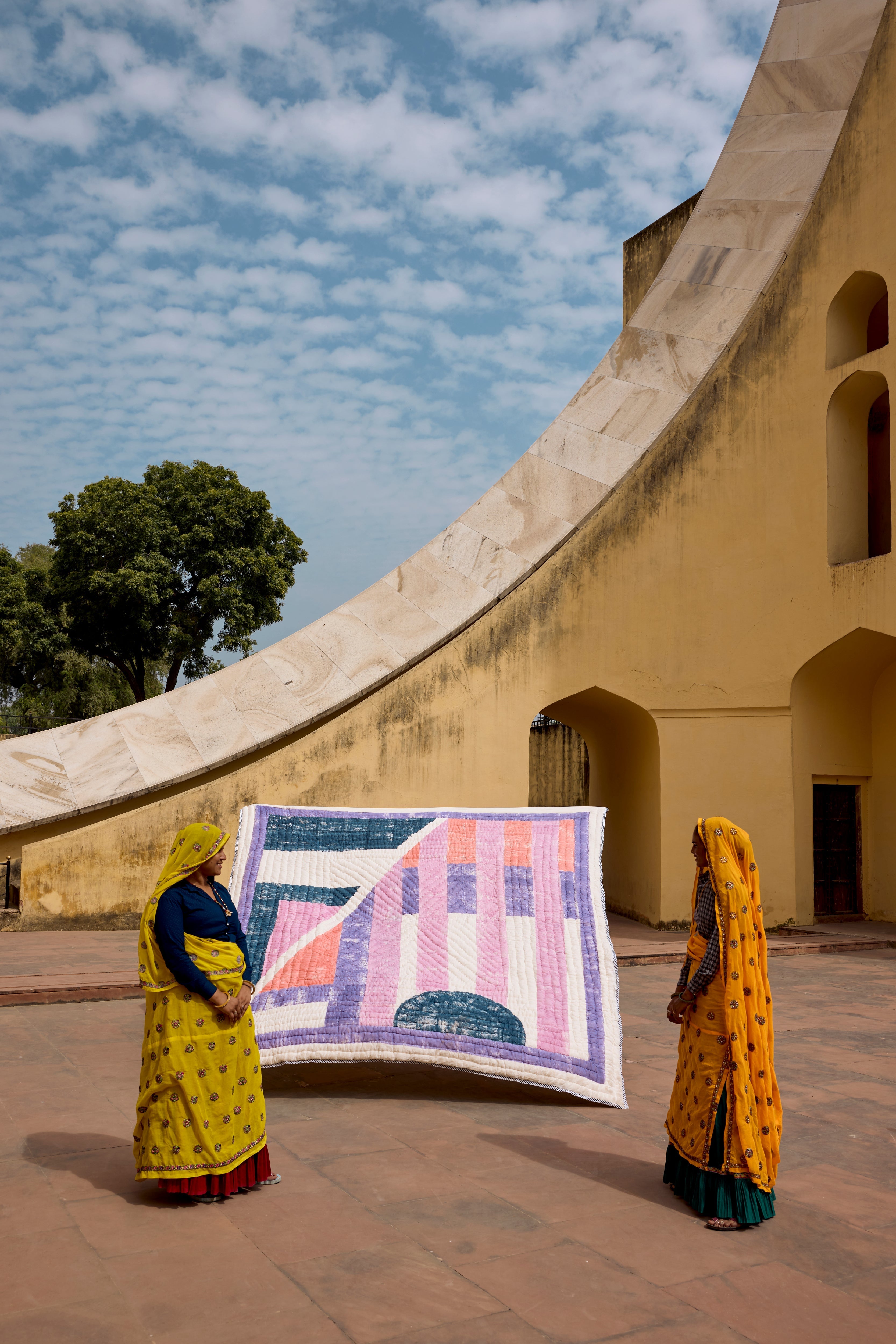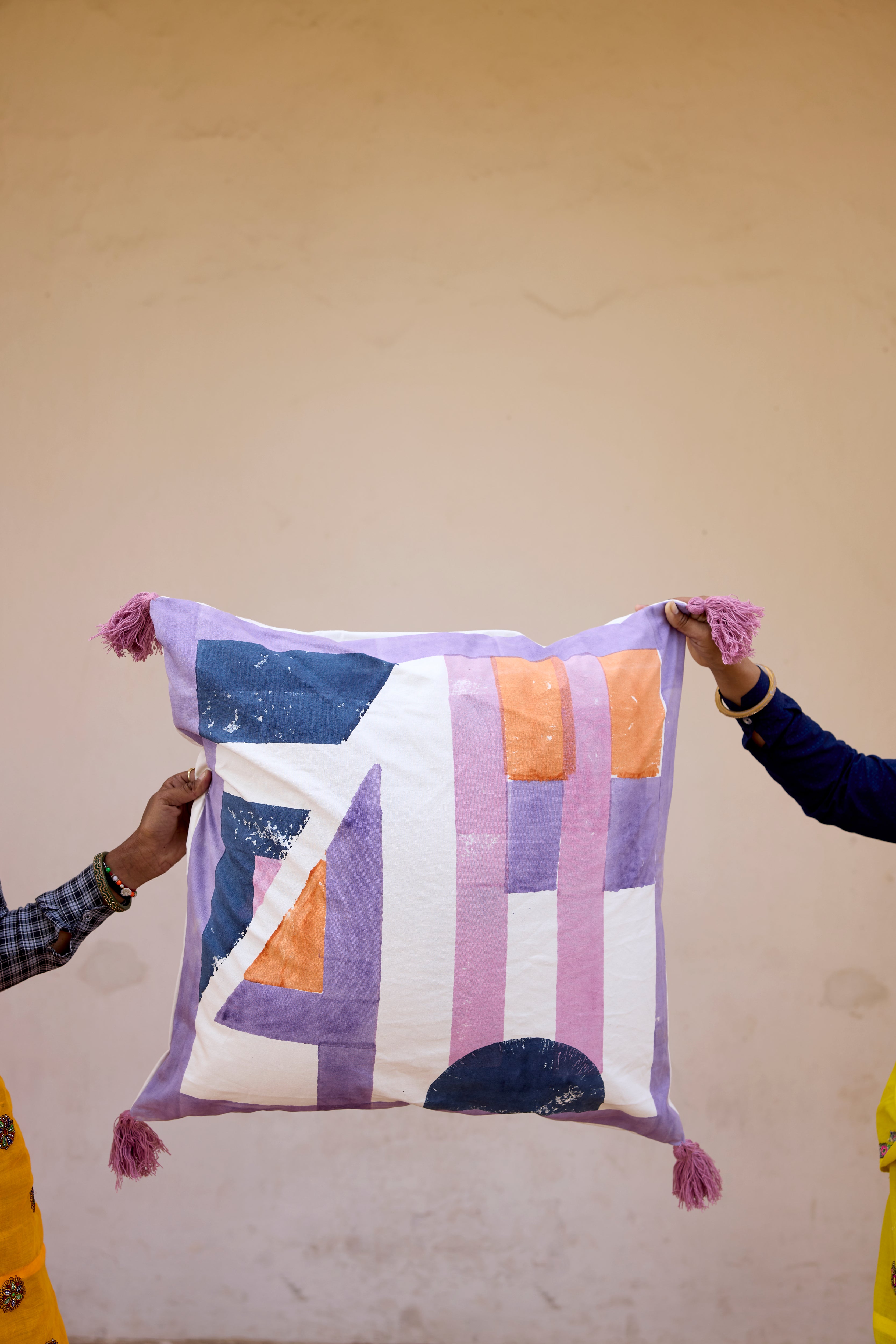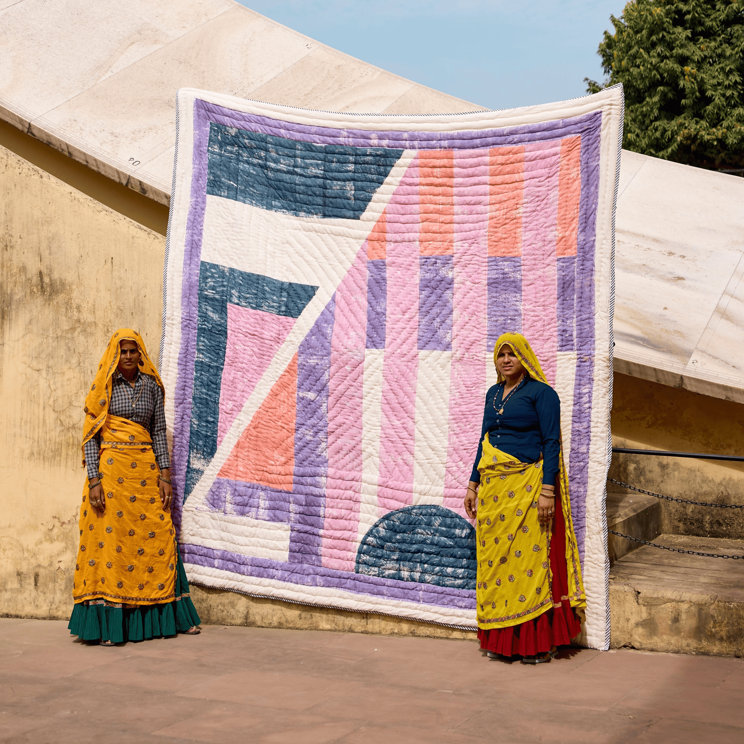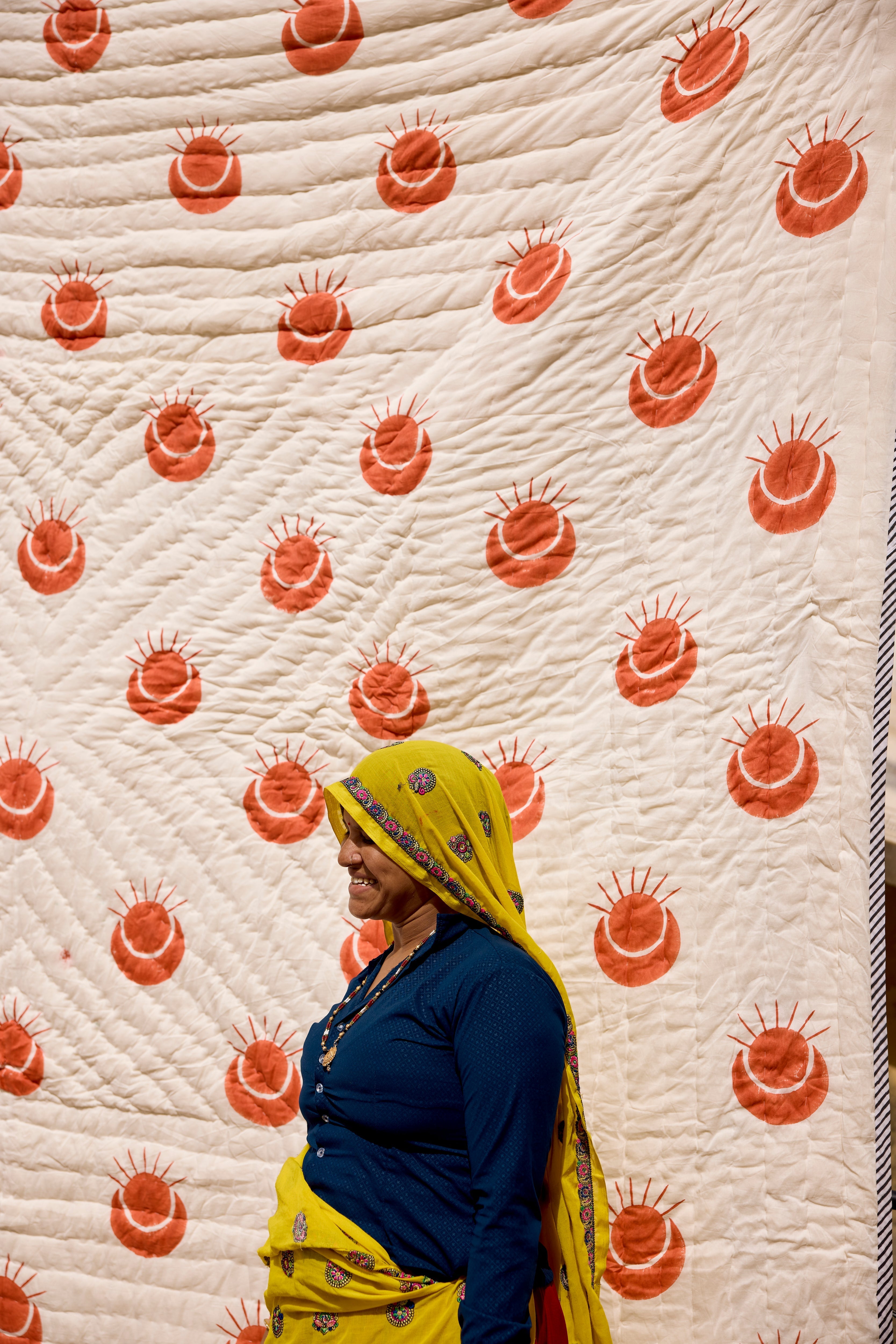 The design is hand-pressed onto each quilt using hand-carved wooden blocks dipped in dyes. The printed cotton shells are brought to the homes of quiltmakers, who stuff and stitch the quilts by hand, creating the final product.