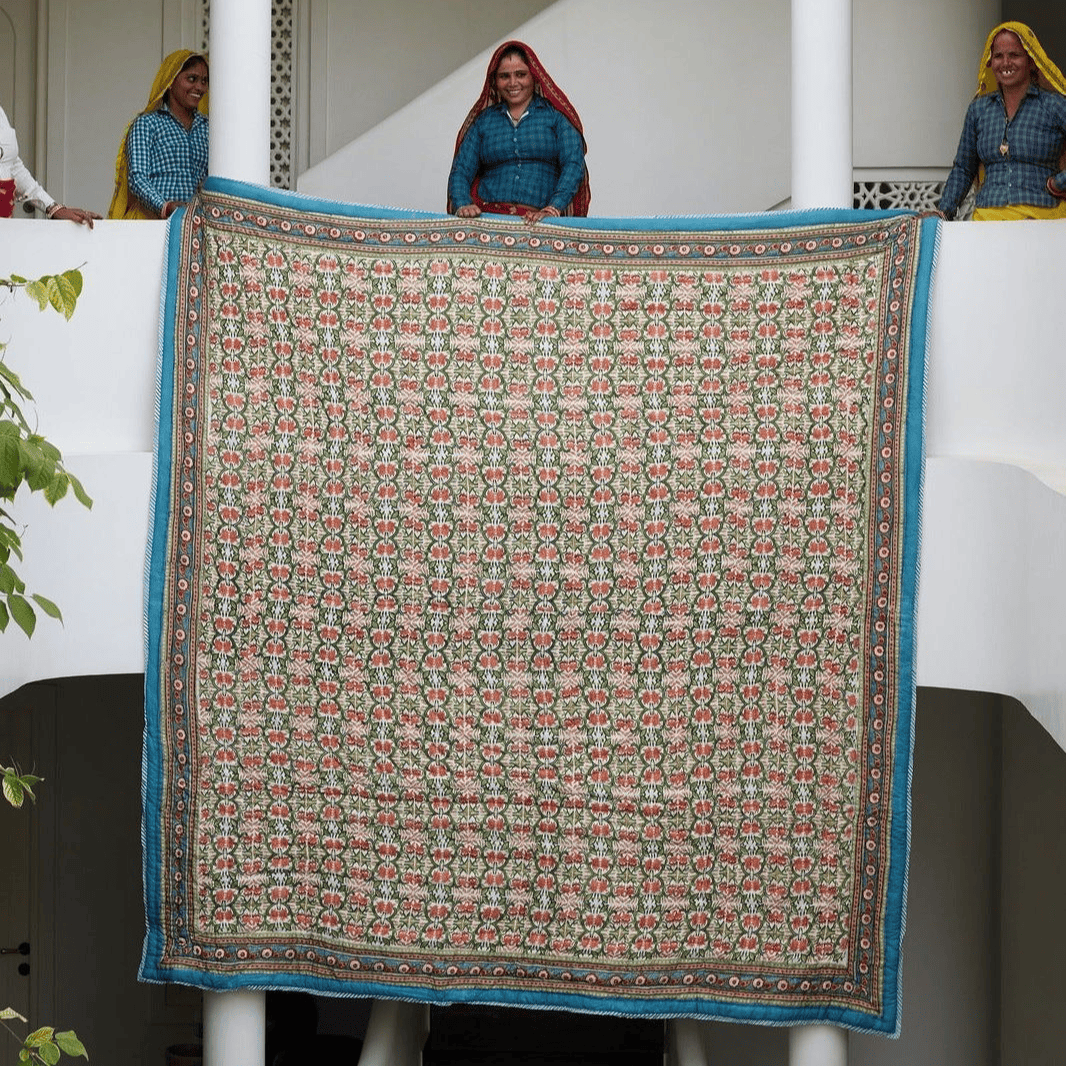The design is hand-pressed onto each quilt using hand-carved wooden blocks dipped in dyes. The printed cotton shells are brought to the homes of quiltmakers, who stuff and stitch the quilts by hand, creating the final product.