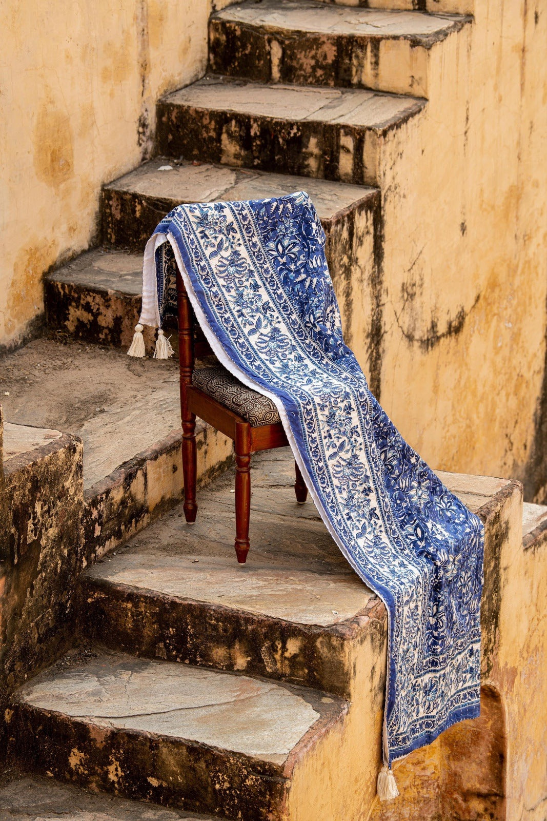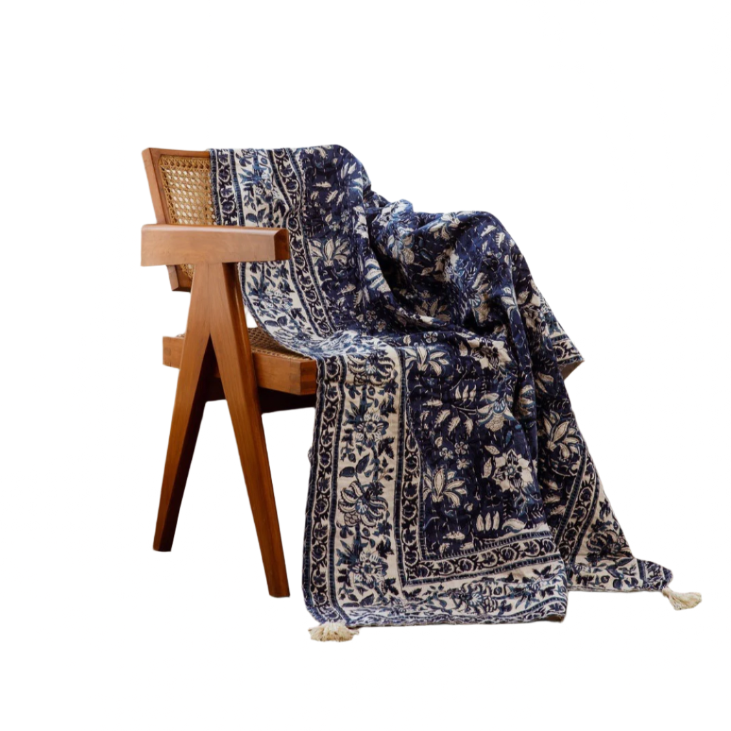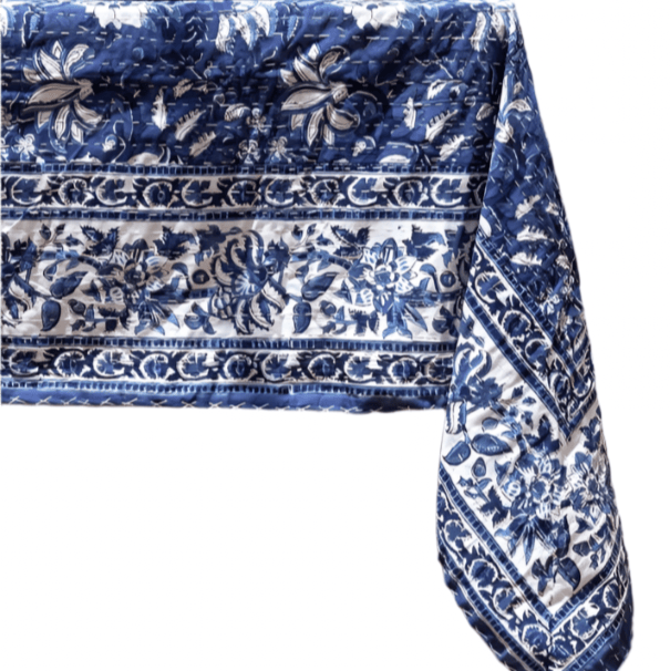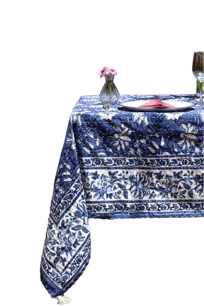 Add a touch of artisanal elegance to your dining experience with this hand-block printed tablecloth, showcasing intricate floral motifs in deep indigo and white. Each tablecloth is handcrafted from 100% cotton, meticulously printed using hand-carved wooden blocks dipped in natural dyes. The rich, botanical patterns bring a timeless charm, making it a perfect centerpiece for both everyday dining and special gatherings.