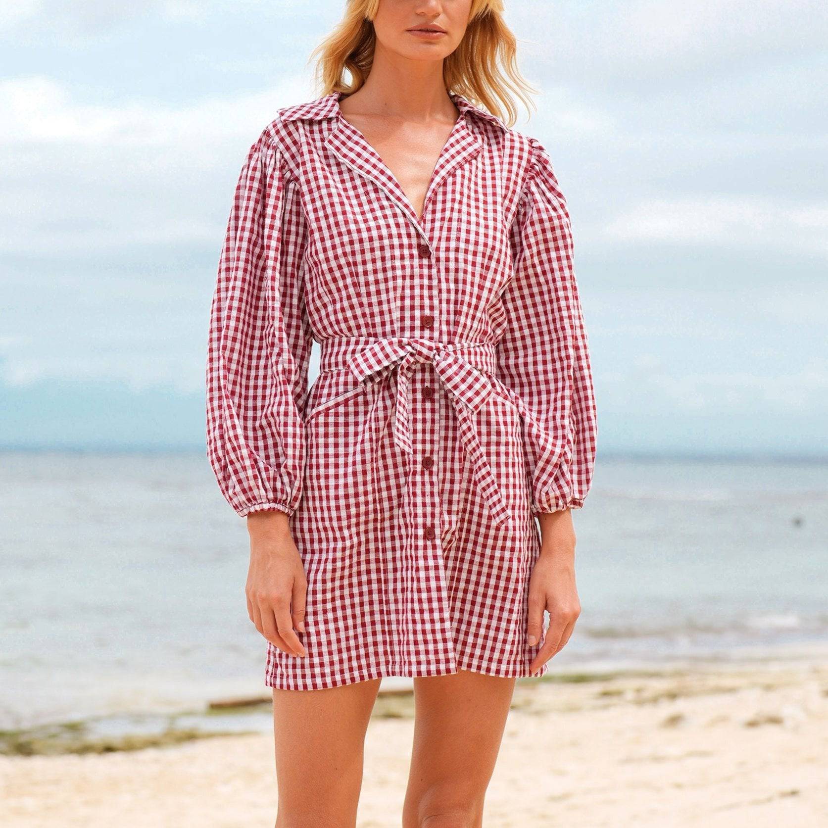 This mini dress offers a sweet silhouette with voluminous medium-length puff sleeves and a light, airy 100% cotton woven gingham fabrication. A chic short skirt with bow-detailing and an adjustable, removable waist belt creates a flattering, playful shape—perfect for picnic days and warm-weather outings.