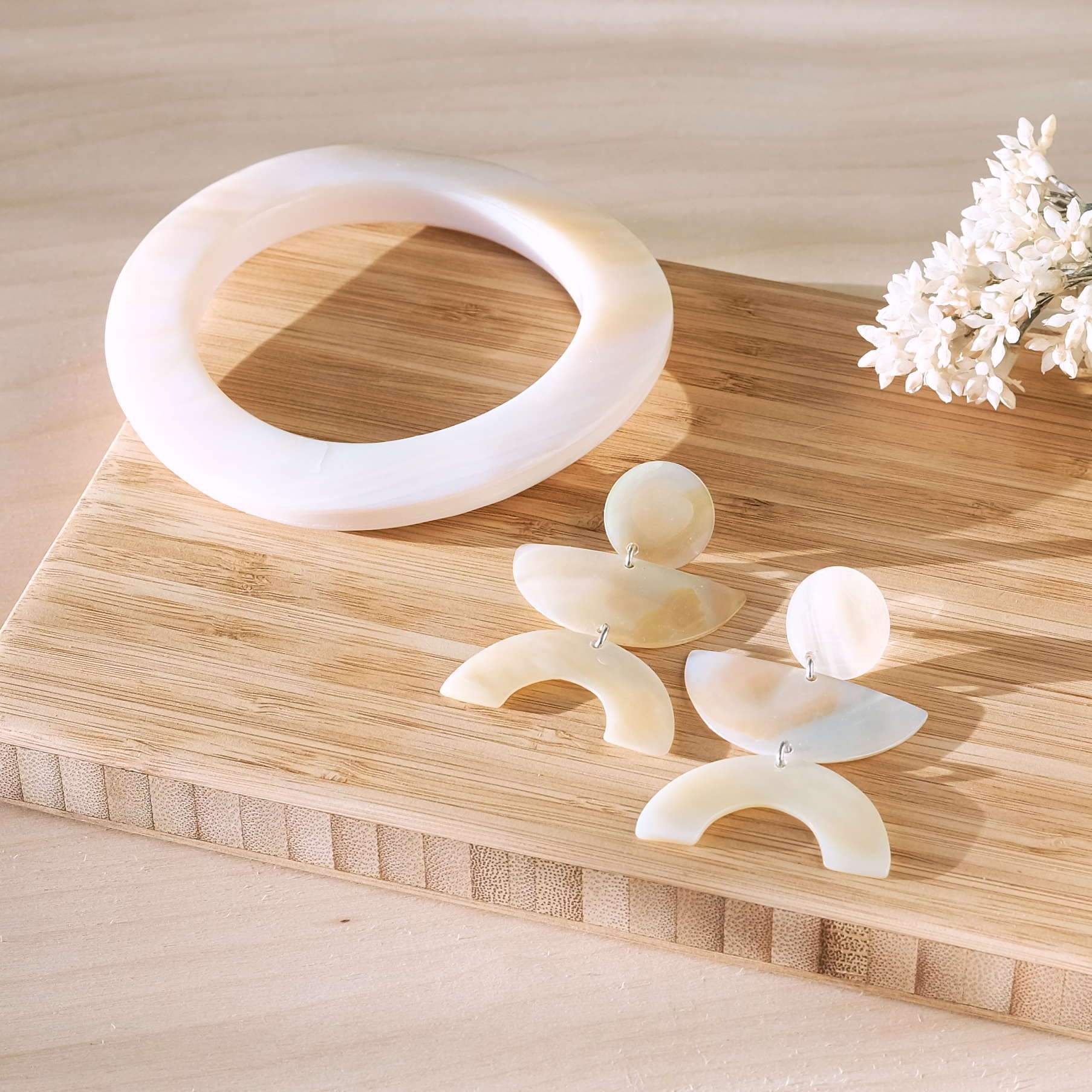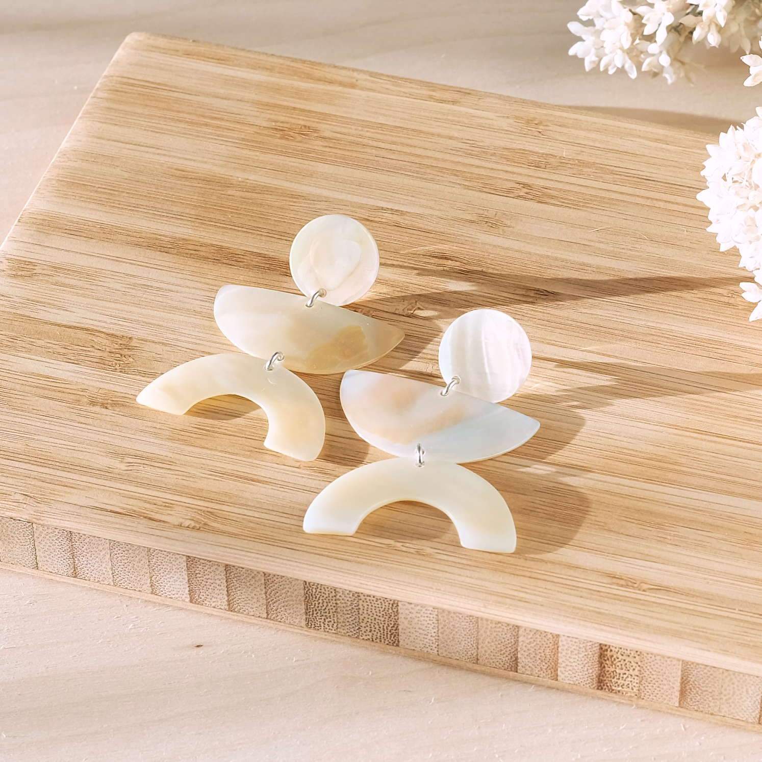 A stunning pair of geometric earrings to pair with every outfit. Handcarved, cut, and polished by master artisans, this versatile mother-of-pearl piece delivers modern elegance in an iridescent cream white color. Due to the material and production process, slight variations in color, pattern, or texture may naturally occur. We invite you to embrace its uniqueness and imperfections. Each purchase empowers female artisan communities in the Philippines, who have access to fair trade and dignified employment through the production process. Always locally-sourced materials, ethically-made, and conflict-free.