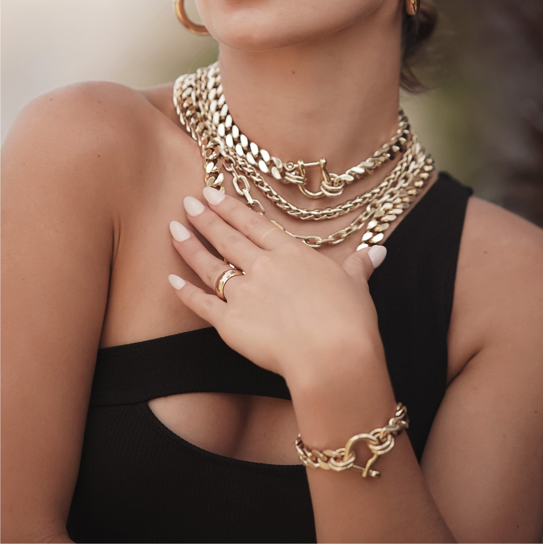 The Roxy bracelet is made from thick squared off recycled brass cuban link chain, fastened with a with horseshoe clasp. Finishes available: 14k Gold plated or Rhodium-Silver plated.