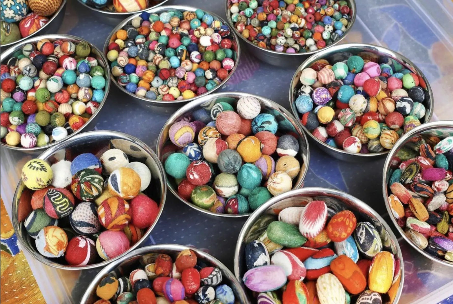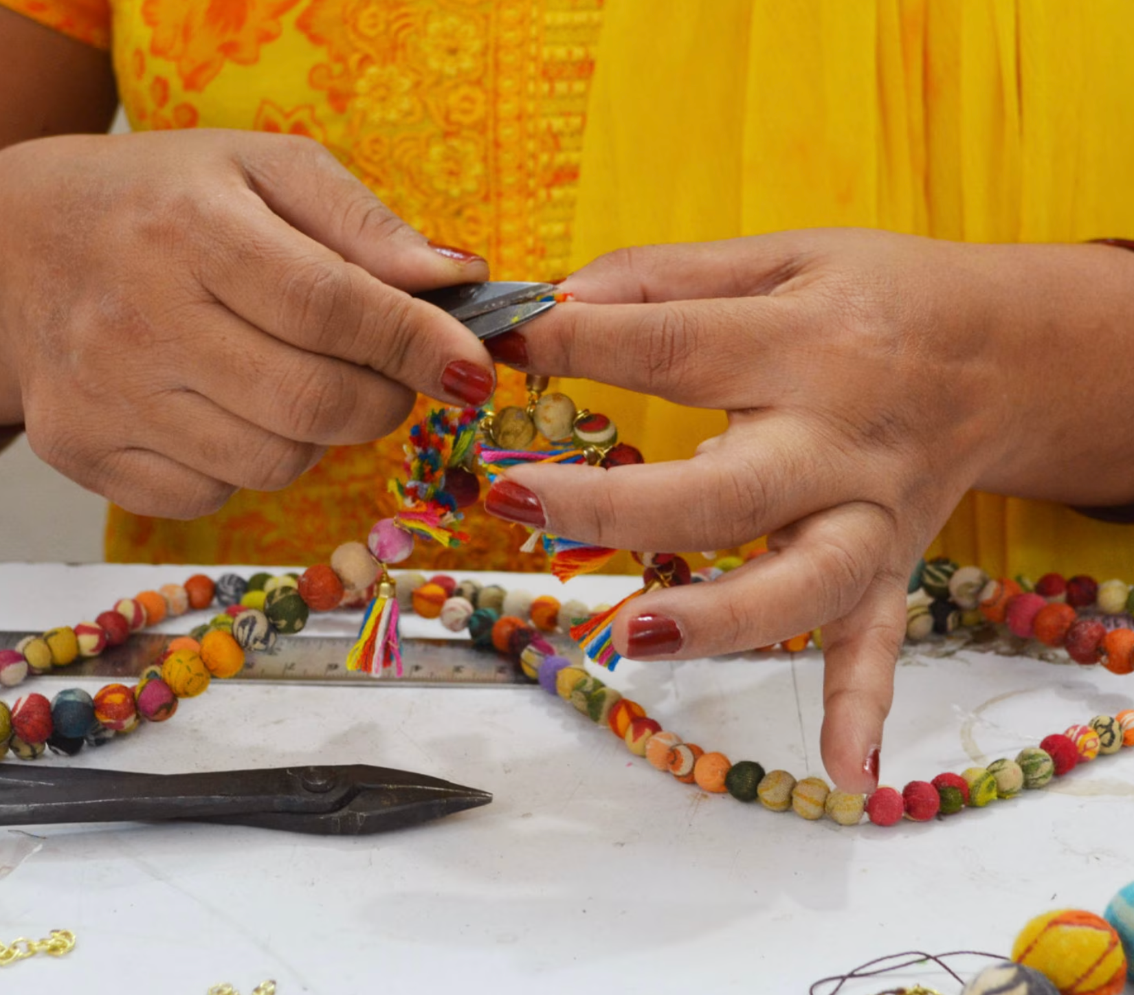 Sustainably handmade by women artisans in India. This fabulous garland features a strands of vibrant Kantha beads made from repurposed Kantha textiles, so colors and patterns are all one-of-a-kind and will vary.