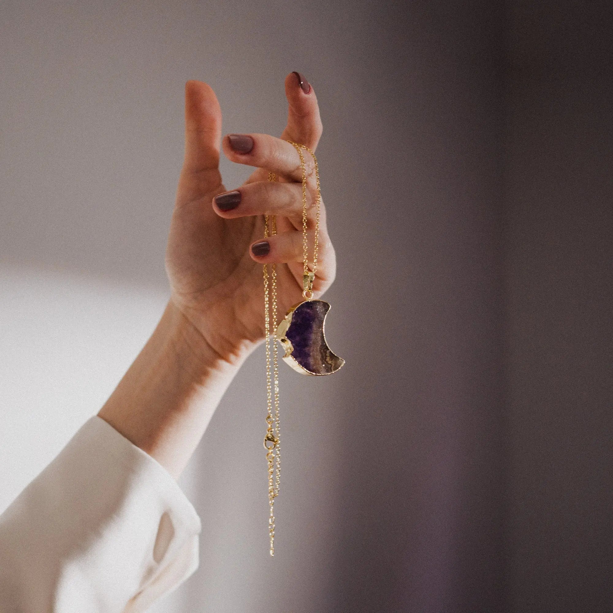 Check out this beautiful moon necklace! Made with a rough amethyst in the shape of a crescent and finished with a druzy, it is the perfect complement to any outfit. It is a unique and eye-catching moon phase amethyst necklace! This piece of natural geode has a gold-plated setting and is hung from a gold-plated chain. The stones are natural amethysts without working. Are you looking for a fashionable necklace with a gemstone pendant? This gold-plated link chain necklace is handmade and is the perfect addition to any outfit. The gemstone is a natural amethyst without working and the necklace is gold plated, which makes it durable and elegant.