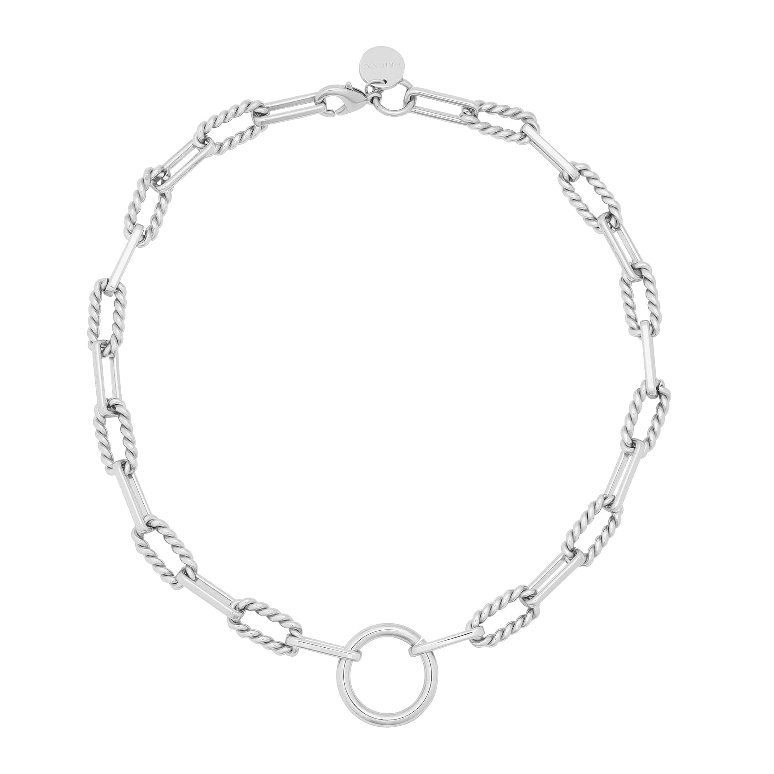 The Eliza necklace is made from our alternating twisted link chain, a large accent ring & fastened with a with lobster clasp.