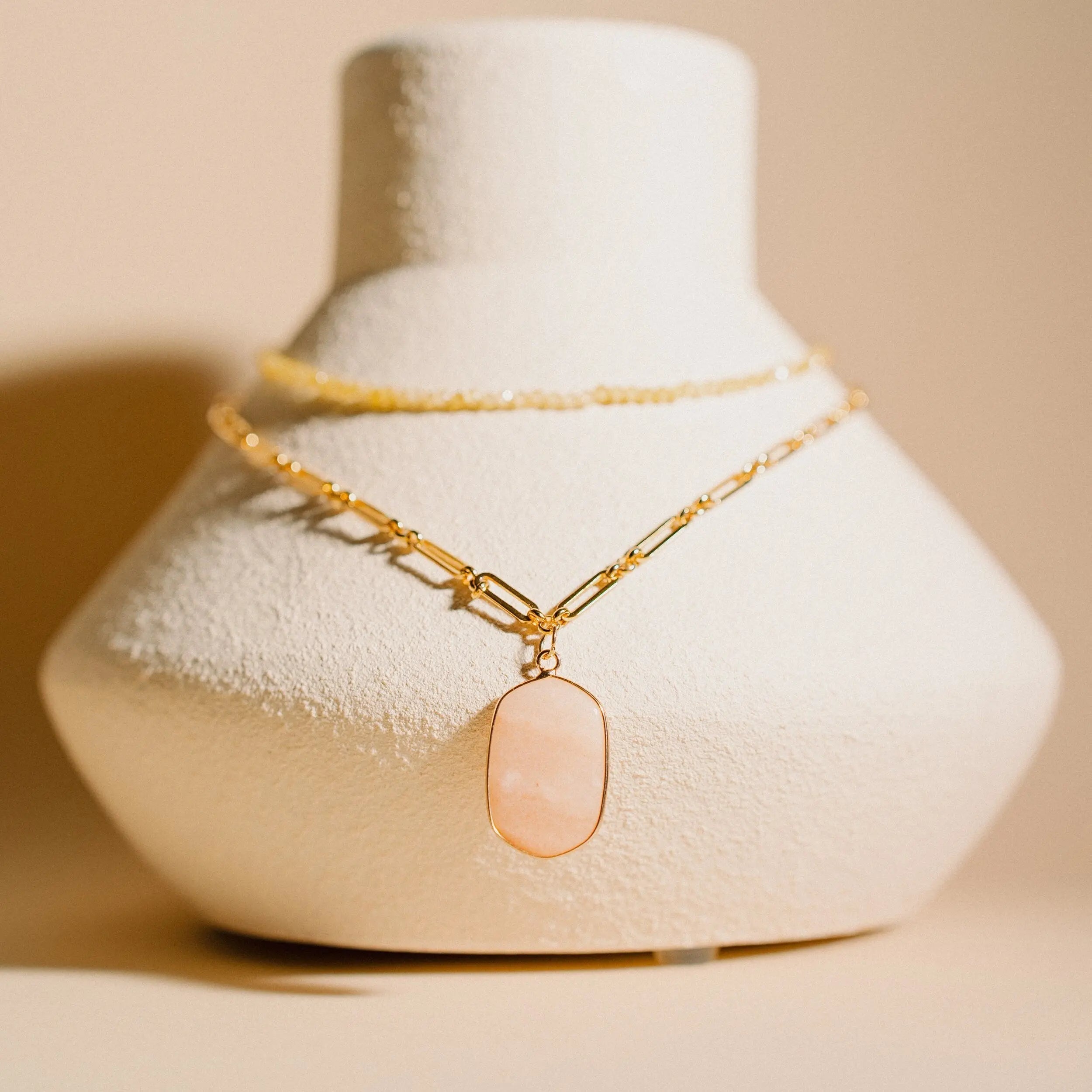 This layered necklace is made up of two main elements: a chain with a special design made of high-quality stainless steel and a polished natural stone pendant in the shape of an irregular hexagon. The chain features a unique design that adds a touch of intrigue and style to the piece, while the irregular hexagon-shaped pendant adds an artistic and modern charm.
