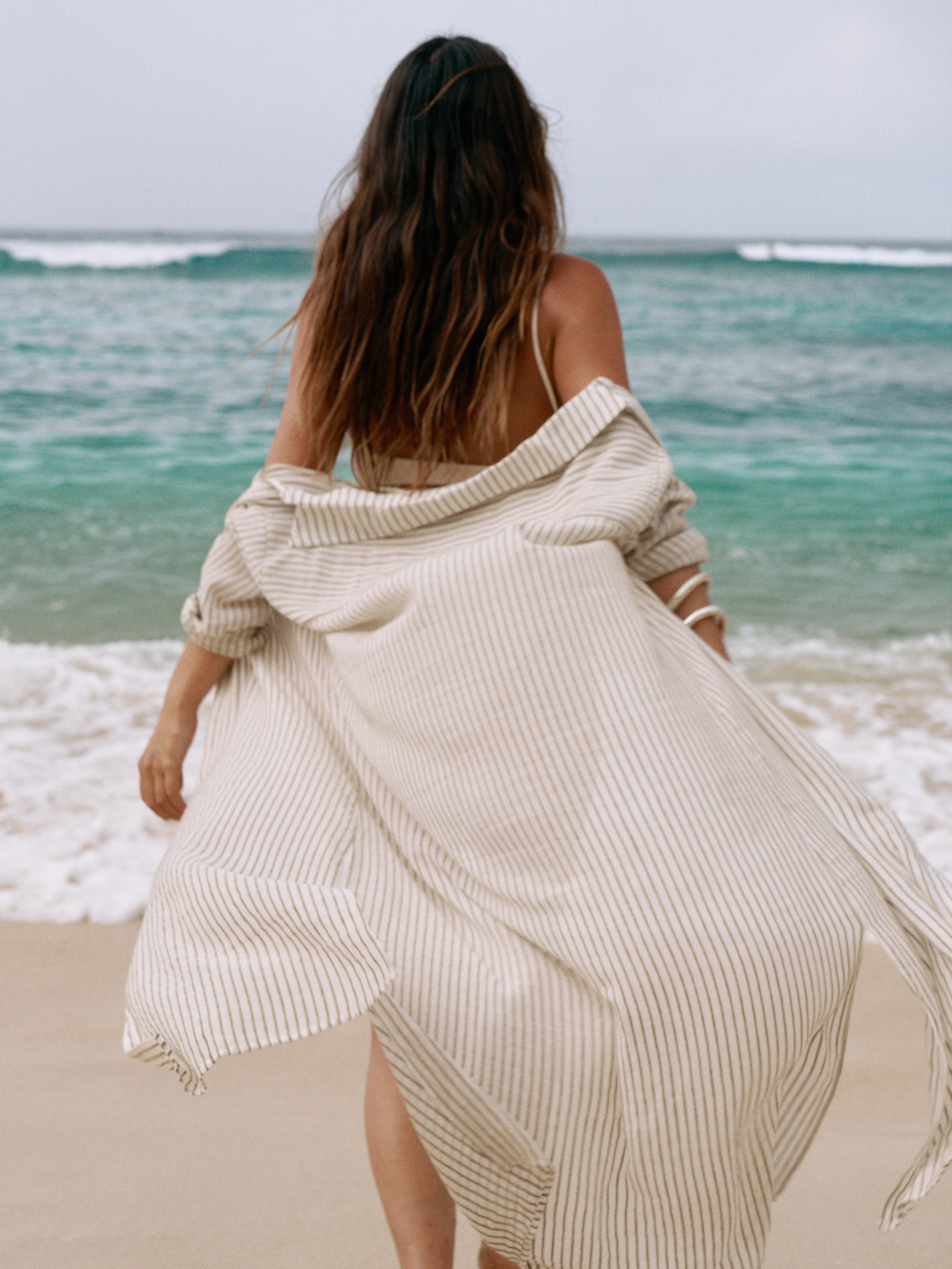 Featuring a button-down front and a relaxed fit, this versatile shirt dress offers effortless layering. Crafted from 100% Turkish cotton with soft, hand-loomed striped fabric, it can be worn open-front over swimwear or buttoned up as a chic beach cover-up. With a classic collar and rollable sleeves, it’s an essential addition to your summer wardrobe, perfect for beachside lounging or strolling through vacation days in style.