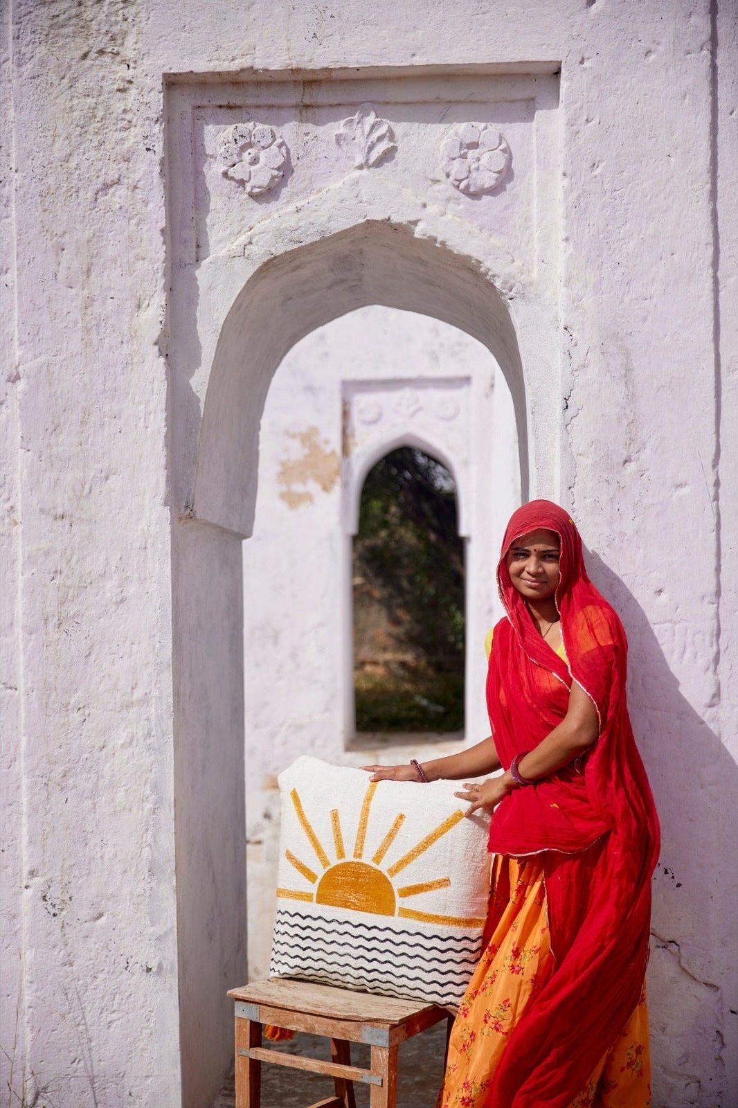 The design is hand-pressed onto each quilt using hand-carved wooden blocks dipped in dyes. The printed cotton shells are brought to the homes of quiltmakers, who stuff and stitch the quilts by hand, creating the final product.
