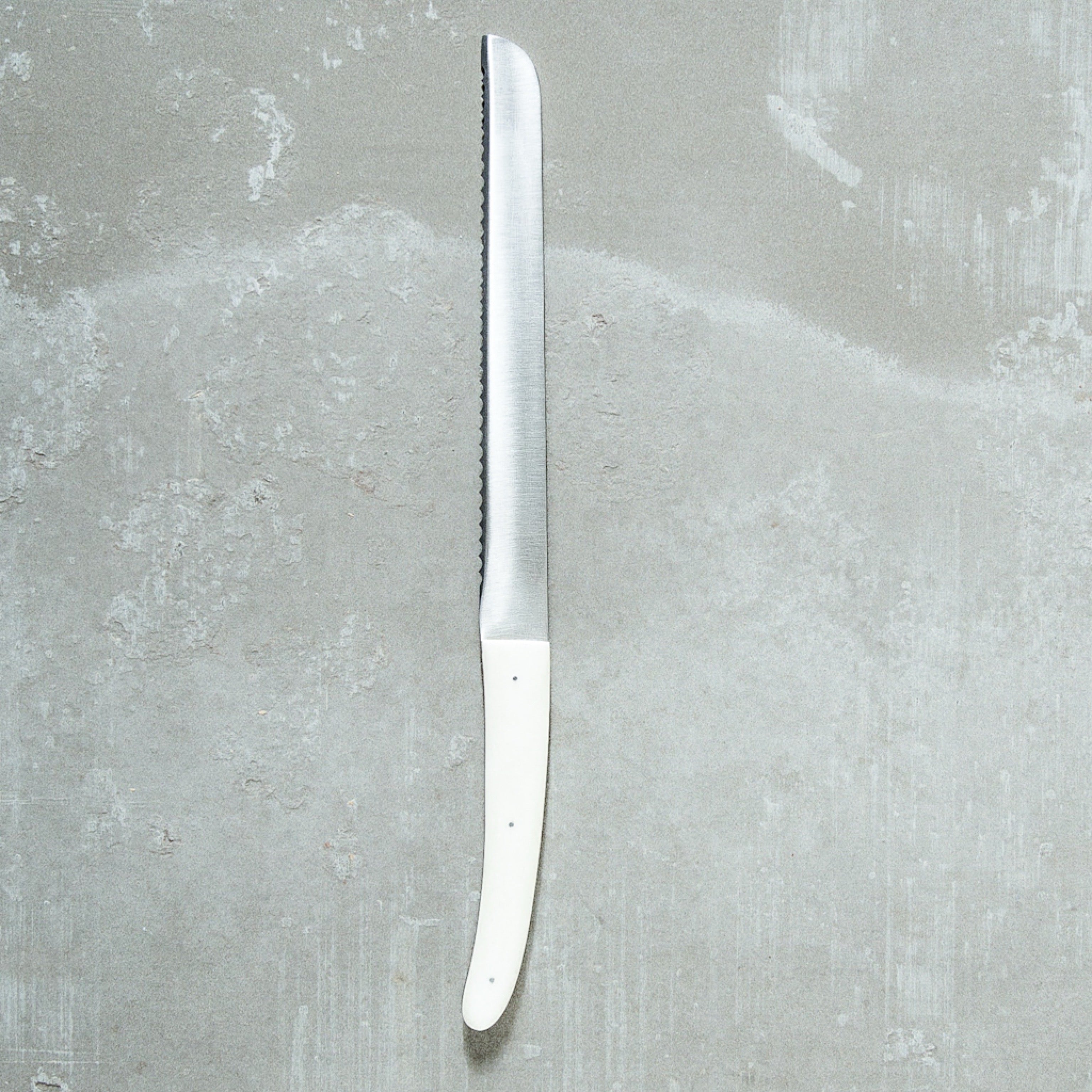 Skilled artisans start with a serrated stainless steel blade, then add polished, hand-shaped segments of natural bone to create the elegant, tapered handle of our Blanco Bread Knife. Whether slicing breads, cooked meats, or vegetables, the serrated edge helps to minimize its compression. Stainless steel provides remarkable blade strength and sharpness, which is best maintained by hand washing.