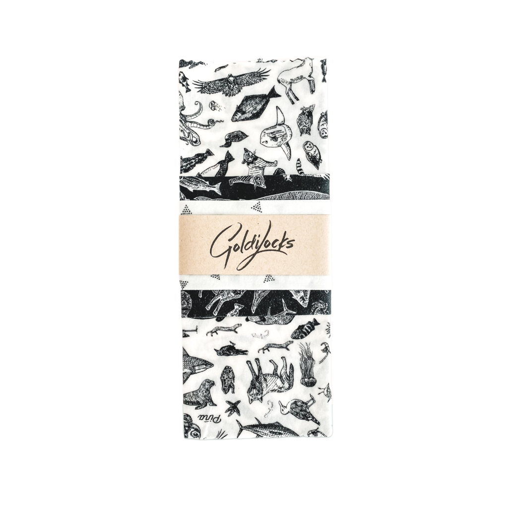 Hemos colaborado con un artista local para crear este fantástico conjunto de la Costa Oeste. Los envoltorios grandes y medianos presentan animales característicos de la isla de Vancouver. Desde ballenas jorobadas hasta pumas, estrellas de mar y colibríes, esta impresión incluye a toda la familia.