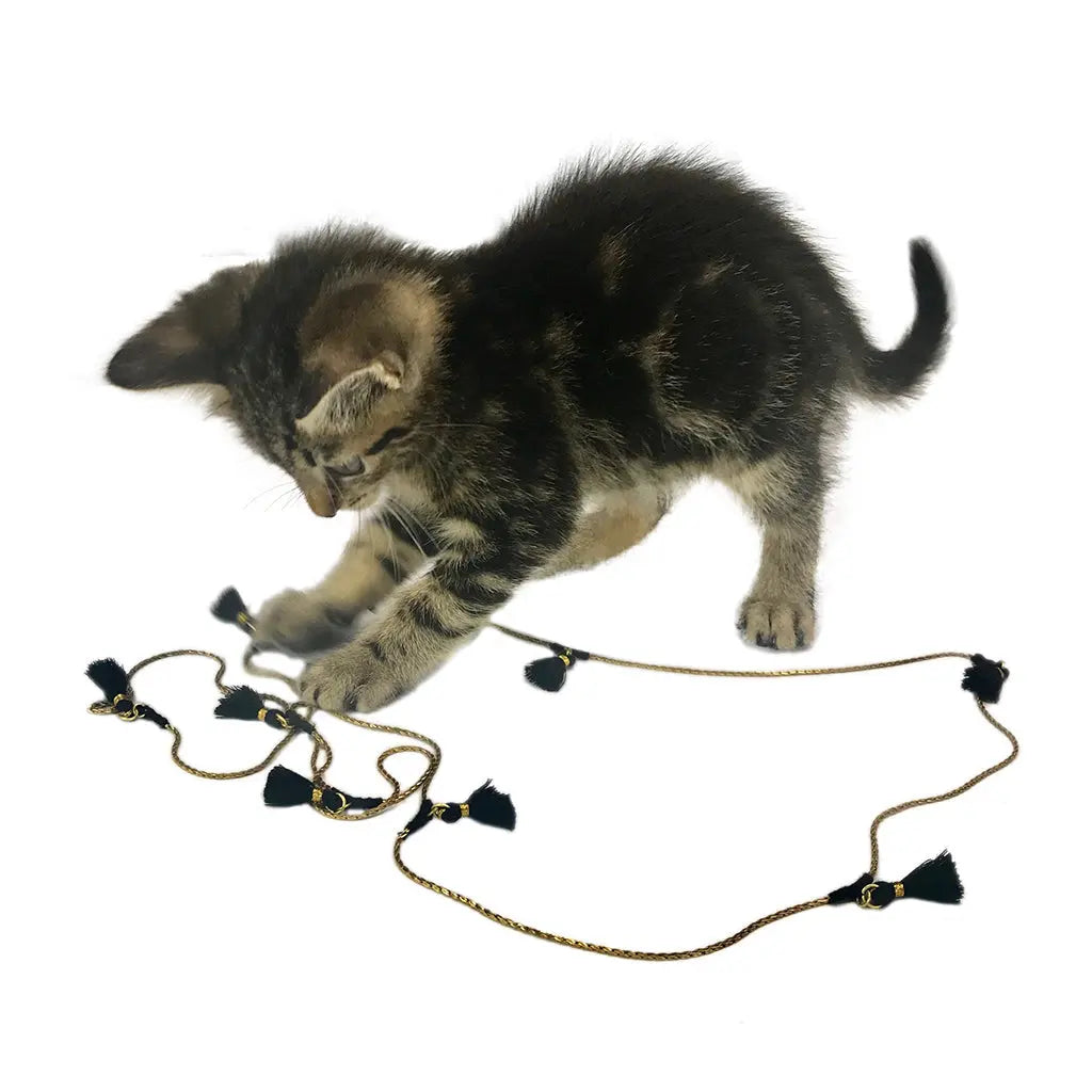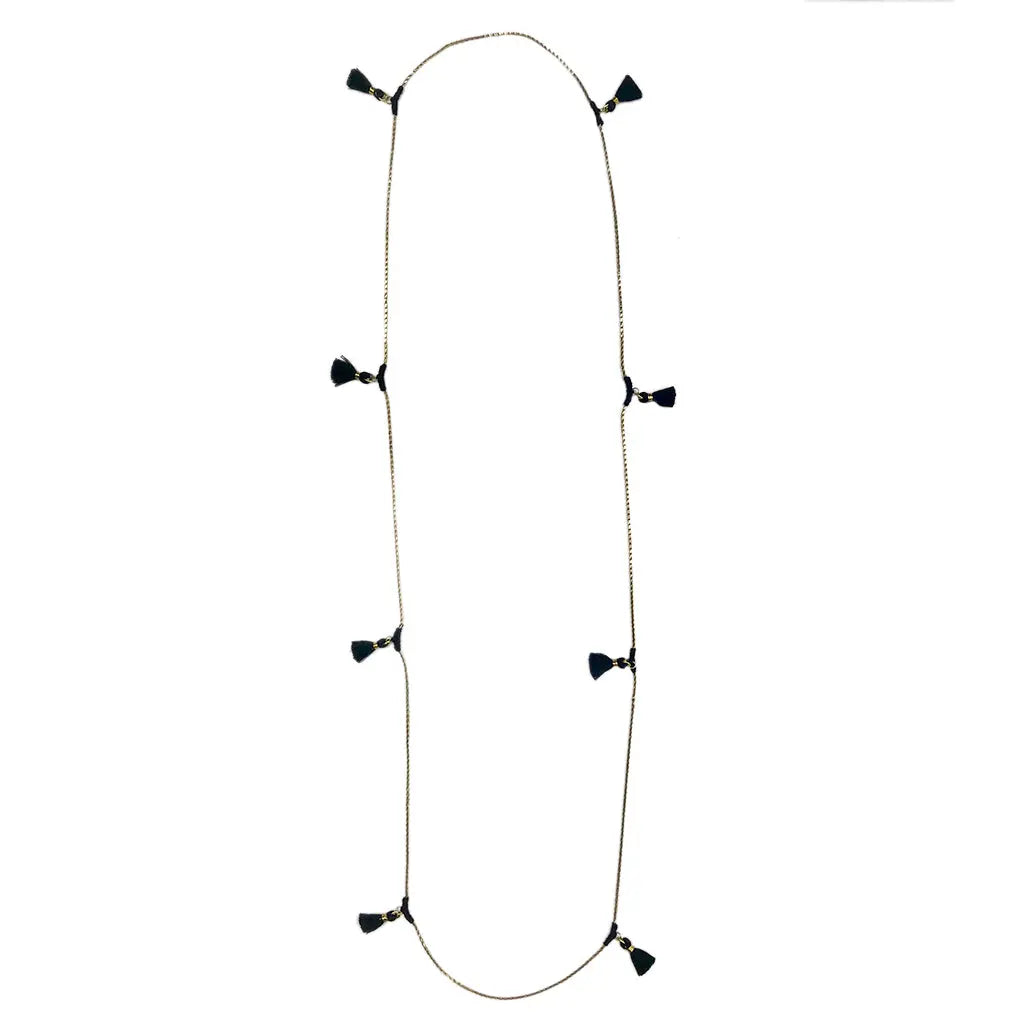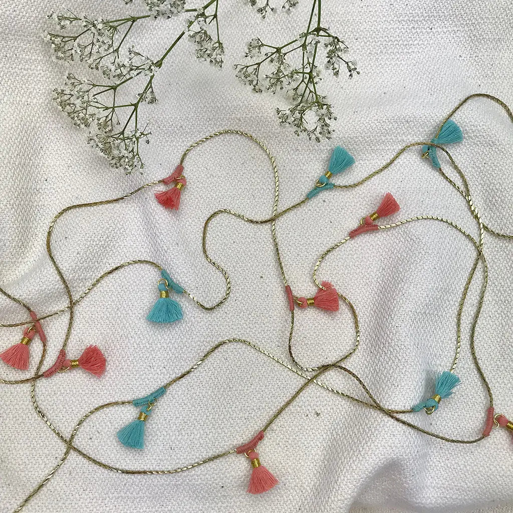 Este collar largo y versátil está adornado con borlas de algodón y se puede usar de múltiples maneras. El delicado diseño es una mezcla de técnicas tradicionales indias con un toque bohemio moderno.