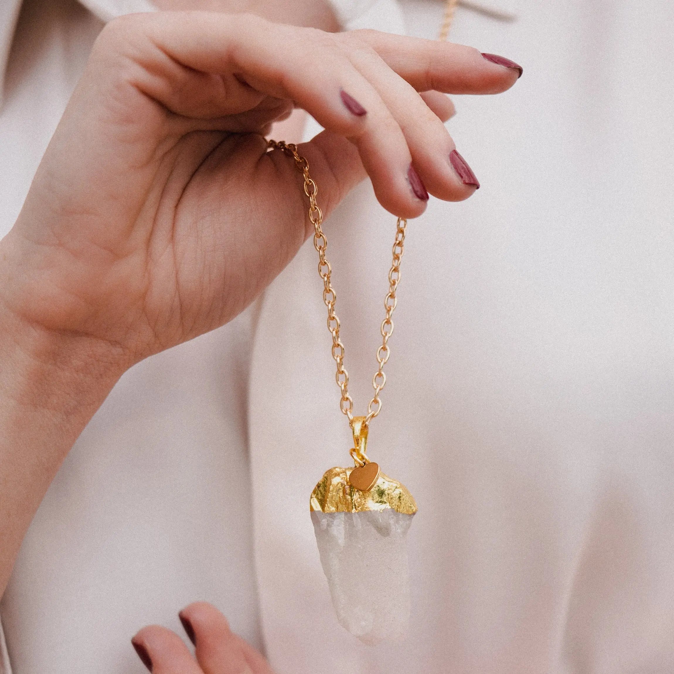 The white quartz druse pendant adds a special touch to the necklace. The druse is a natural formation of small crystals found inside a cavity. This unique feature gives the pendant a fascinating and unique appearance.