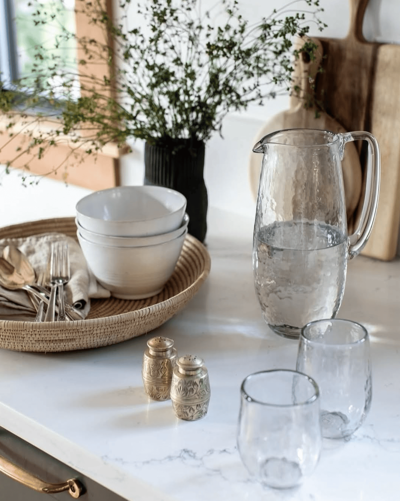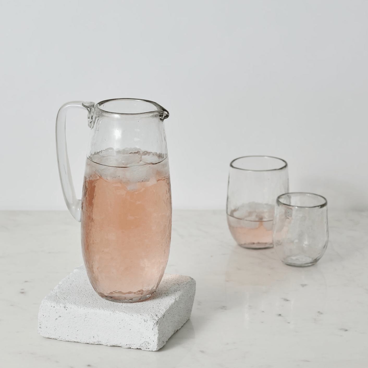 Perfect for dining al fresco, our new Pebbled Glass Pitcher is a tall drink of water! Partially made from recycled glass, this simple, hand-blown vessel features the same slightly hammered texture as the other pieces in the collection. Its slim silhouette is deceptively roomy, with an impressive 48 oz. capacity. This polished, versatile piece looks at home in any decor, at any meal, whether used with our Pebbled Glassware or not.