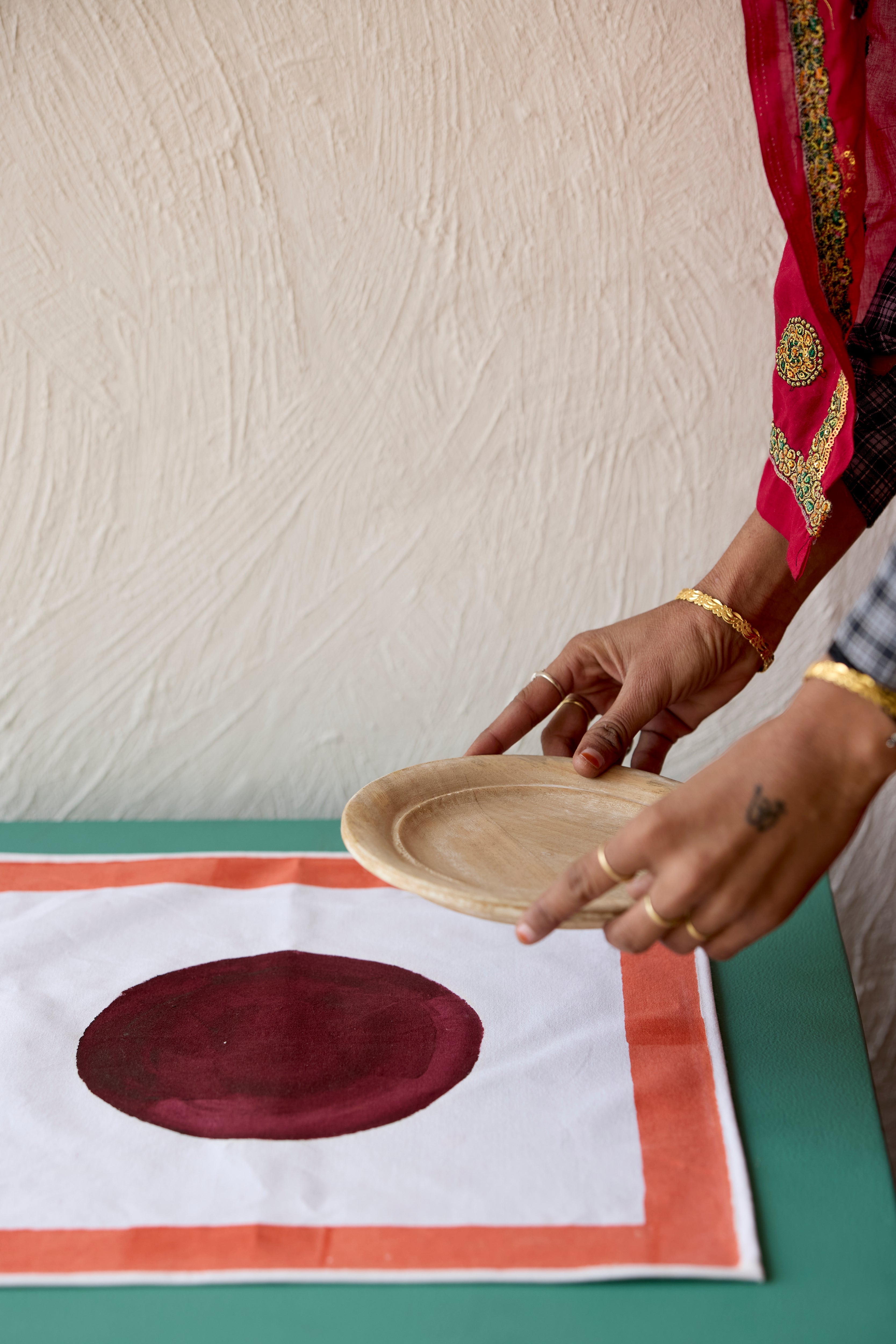 Each placemat is lovingly handmade by skilled artisans specializing in wood carving, block printing, Kantha stitching, and dyeing. The design is meticulously hand-pressed onto premium 100% cotton fabric using carved wooden blocks and natural dyes. A traditional Kantha stitch finishes the edges, creating a seamless union of craftsmanship and contemporary aesthetics.
