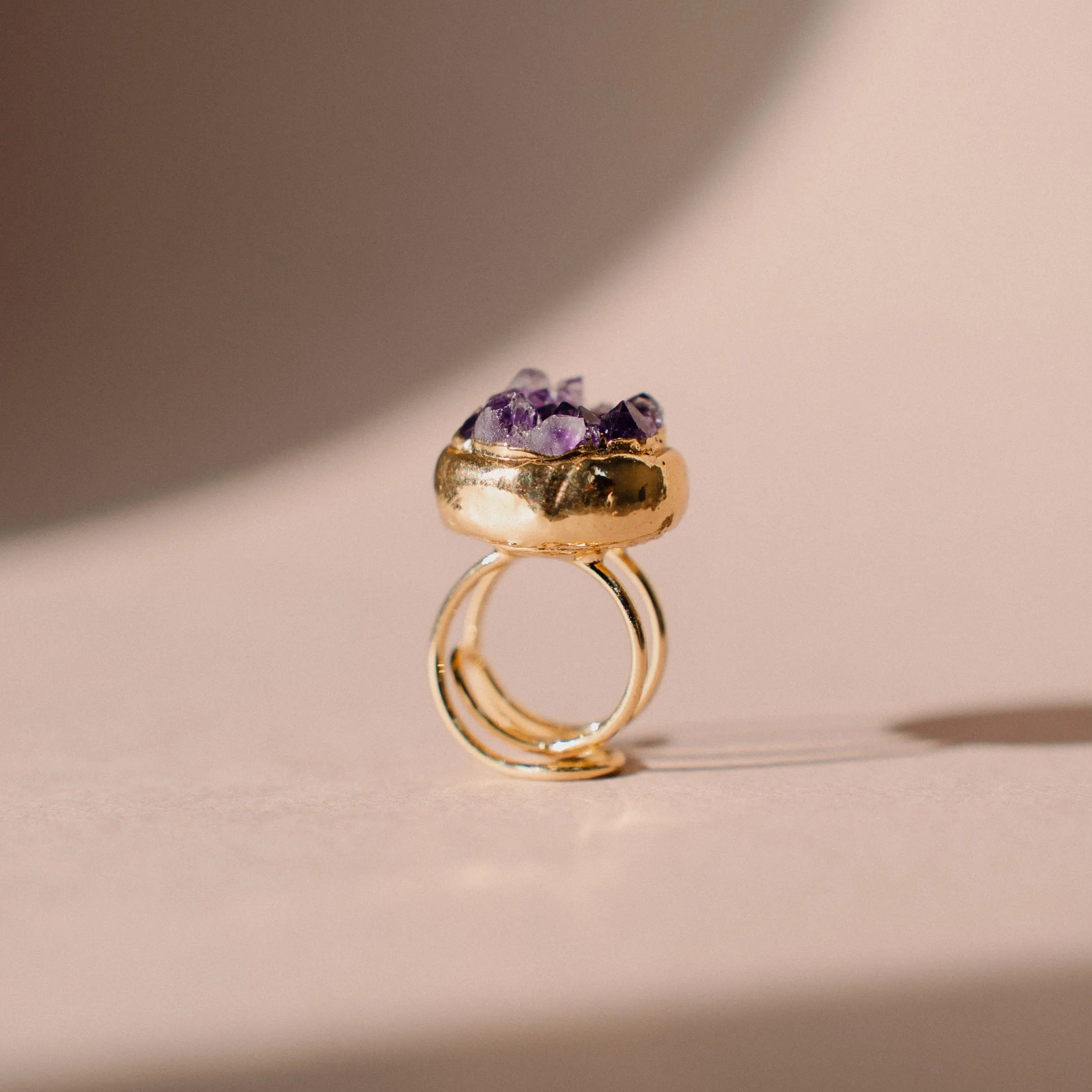 Indulge in luxury with our Amethyst Ring, featuring a gold-plated adjustable band and a stunning amethyst stone. Elevate your style and feel exclusive with this exquisite piece. Experience the beauty of amethyst in a whole new way with our elegant ring.