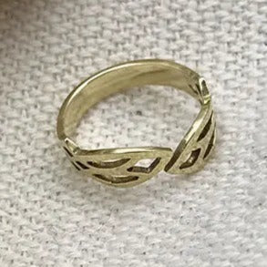 Hecho a mano con amor en Camboya. Este delicado anillo con forma de hoja, que transforma la guerra en paz, está muy pulido y fabricado a mano por un grupo de artesanos en Camboya a partir de conchas de latón recicladas.