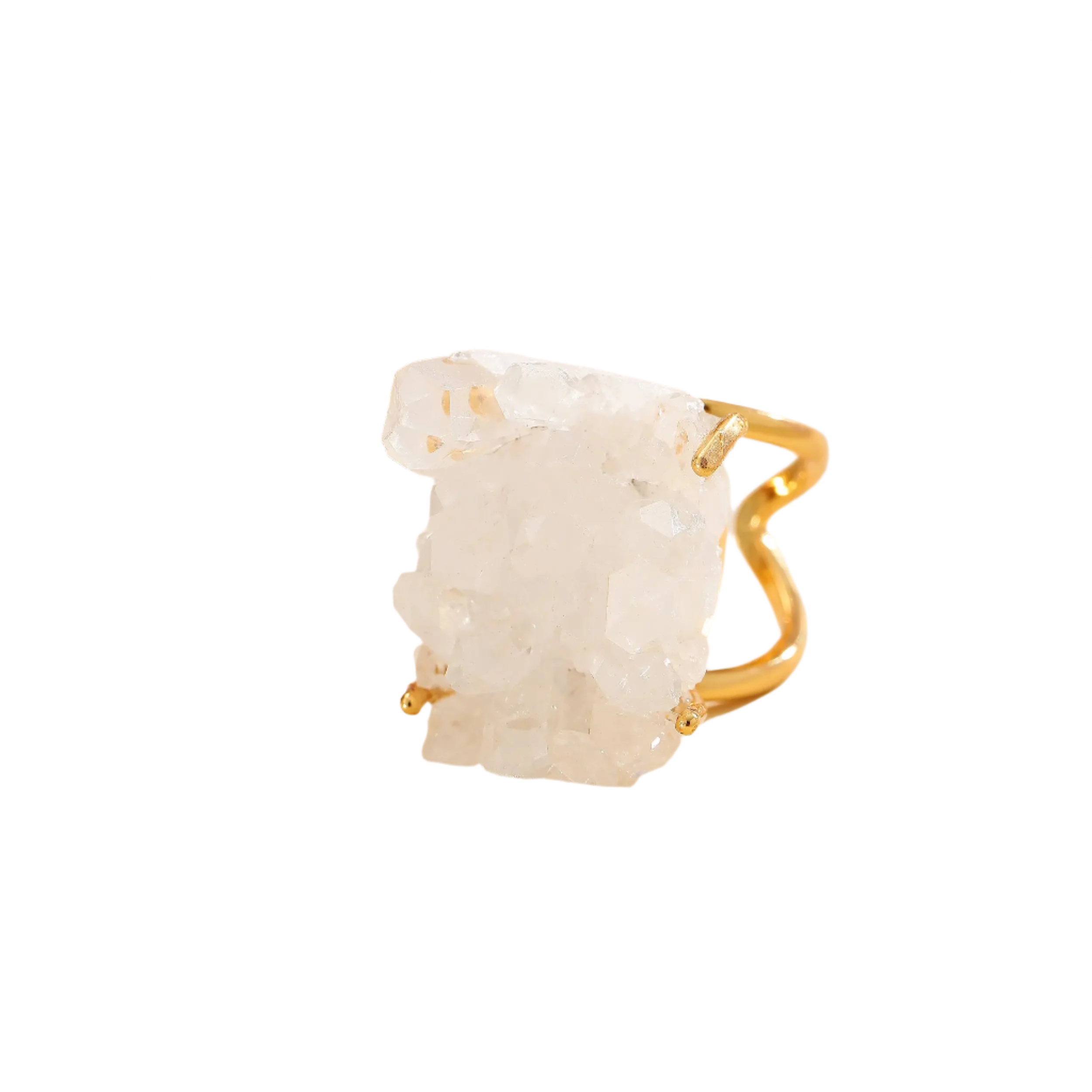 The clear quartz stone at the centerpiece of this chunky ring shines with unrivaled clarity. Many appreciate stones like clear quartz for their versatility and pristine look because they can complement various styles, whether you prefer casual daywear or a more formal, night-out look. Clear quartz has long been cherished in the world of crystal enthusiasts and jewelry lovers alike, and with good reason. Its natural beauty and the way it catches the light make it a highly desirable choice for anyone looking to add a touch of timeless elegance to their ensemble.
