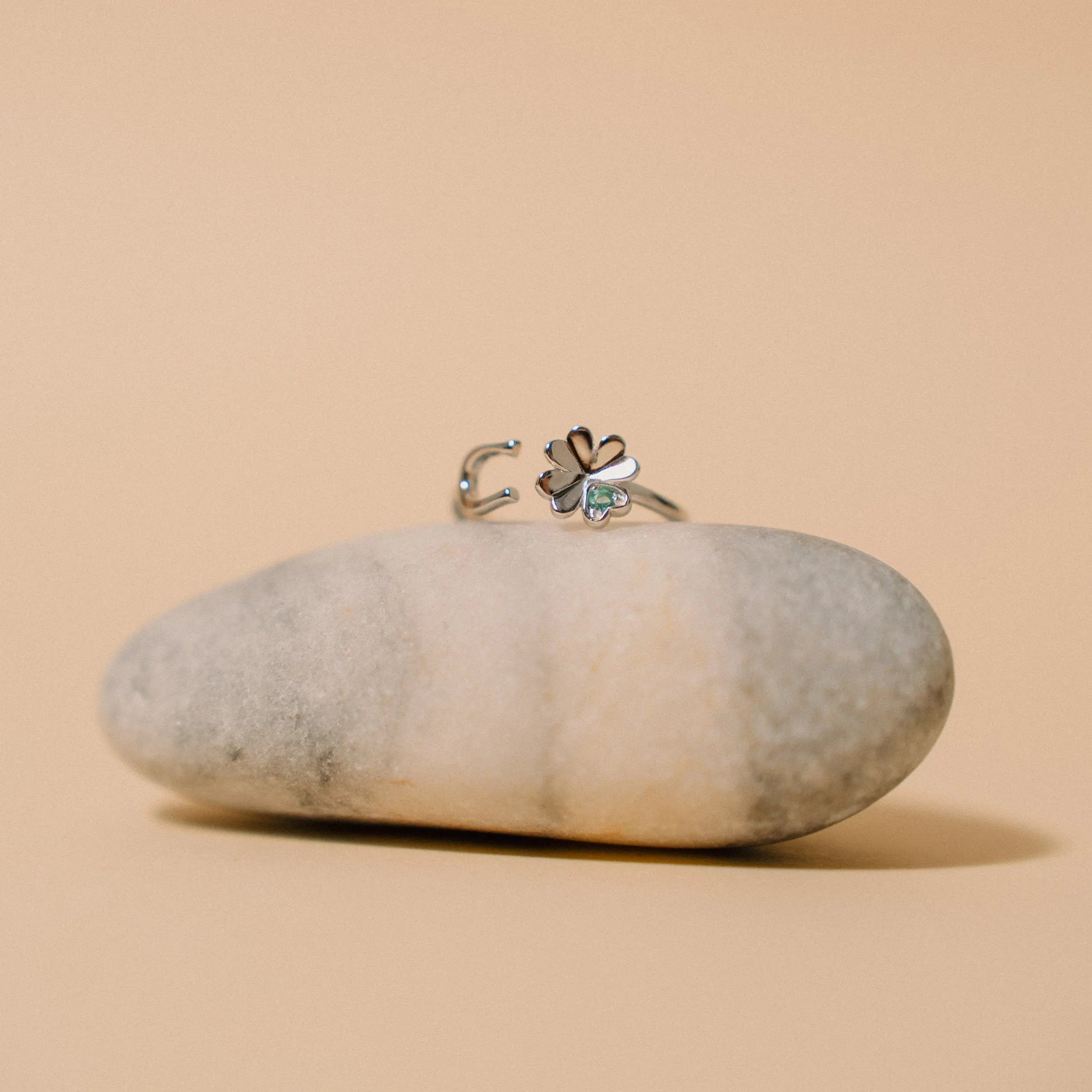 This 925 silver Horseshoe and Four Leaf Clover open ring is a charming work of art that combines symbolism and elegance in one piece. At one end of the ring is a delicate four-leaf clover, a symbol of good luck and fortune. At the other end is a horseshoe figure, another symbol traditionally associated with good luck and protection.